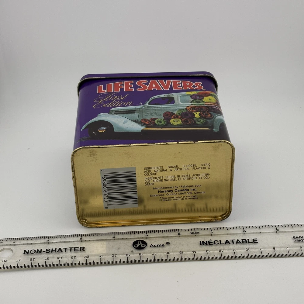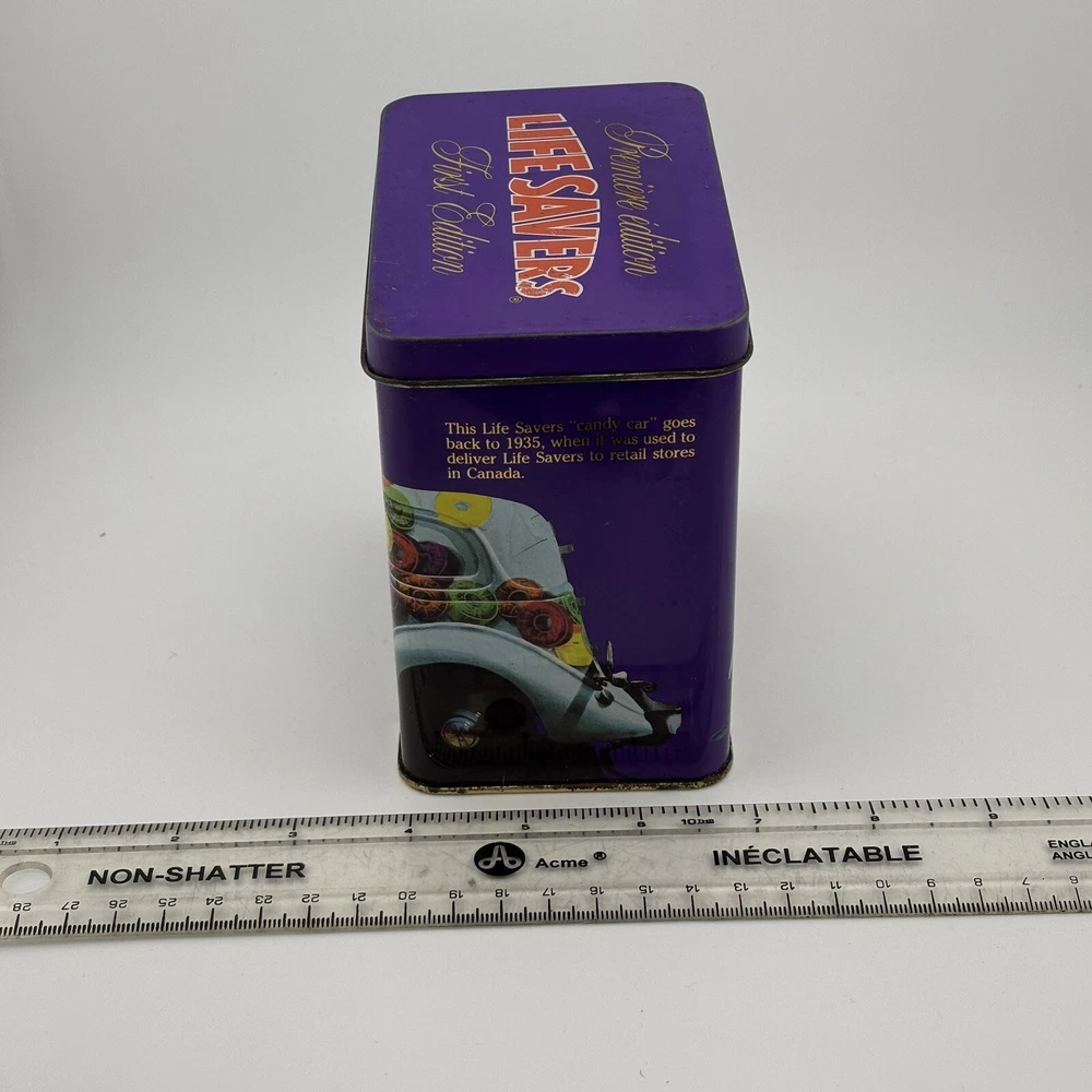 This vintage Lifesavers "First Edition" tin features a vibrant purple design with an old-fashioned candy delivery car graphic and the tagline, "The candy with the HOLE." The nostalgic imagery and colorful graphics make it a collectible piece for Lifesavers enthusiasts or vintage advertising collectors. The tin also includes text referencing the use of the iconic candy car in 1935, adding historical charm. Its spacious interior makes it practical for storage or display. Refer to the photos with the ruler for accurate scale. This tin is a delightful decorative piece for collectors or those looking to add a retro touch to their home. Condition Notes: This Lifesavers tin is in fair vintage condition, with noticeable signs of wear, including scratches, scuffs, and minor dents. The interior shows light tarnishing, but the overall structure remains intact. The graphics are vibrant, though they exhibit some wear consistent with its age. Please examine all photos carefully to assess its condition. Welcome to The Gay Delphinium! I'm new to selling on eBay, so I appreciate your patience as I navigate this learning curve. Please note that I ship from rural Canada, and while I do my best to get your items to you as quickly as possible, shipping can sometimes take a bit longer, especially during the winter months. Save on shipping by bundling items from my shop! I offer a variety of vintage items, such as books, toys, and more. These items naturally show signs of age and wear, which adds to their unique charm. What you see in the photos is exactly what you'll receive. I strive to mention any notable flaws, broken parts, or missing pieces in my listings, but if you have any questions or need more details, please don't hesitate to reach out. If you happen to notice any mislabeling or errors in my listings, I would greatly appreciate you letting me know! Thank you for supporting my shop, and I hope you find something special! Important Shipping Update Due to an ongoing strike by Canada Post workers, I am currently unable to ship items using standard postal services. While private courier options are available, they are significantly more expensive and are currently inundated with packages, resulting in their own delays. Please keep this in mind when placing an order. Additionally, while my shop is technically on 'vacation time,' I am still accepting orders. However, I ask that you manage your expectations regarding shipping times, as delays are beyond my control at the moment. Thank you for your patience and understanding. Your support means the world to me, and I?ll do everything I can to ensure your order gets to you as soon as possible! Take care, The Gay Delphinium