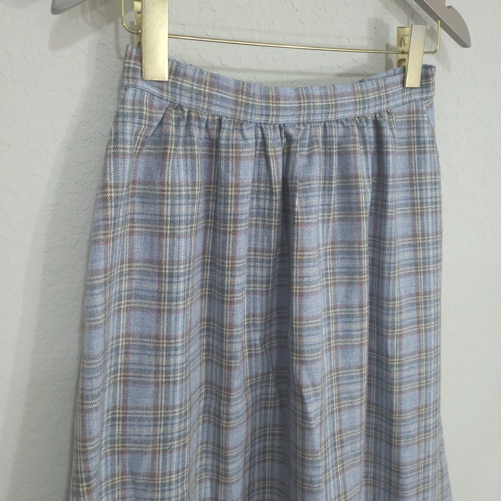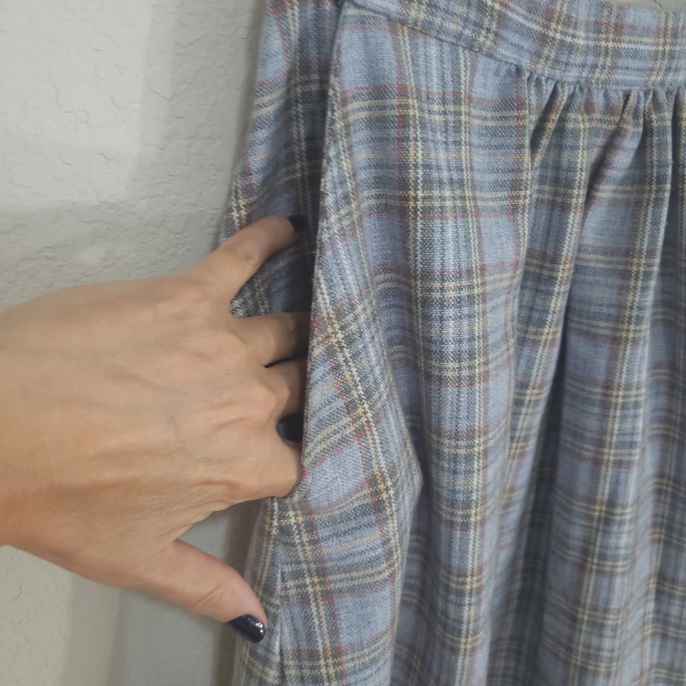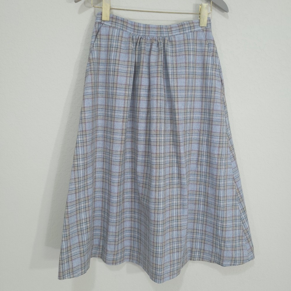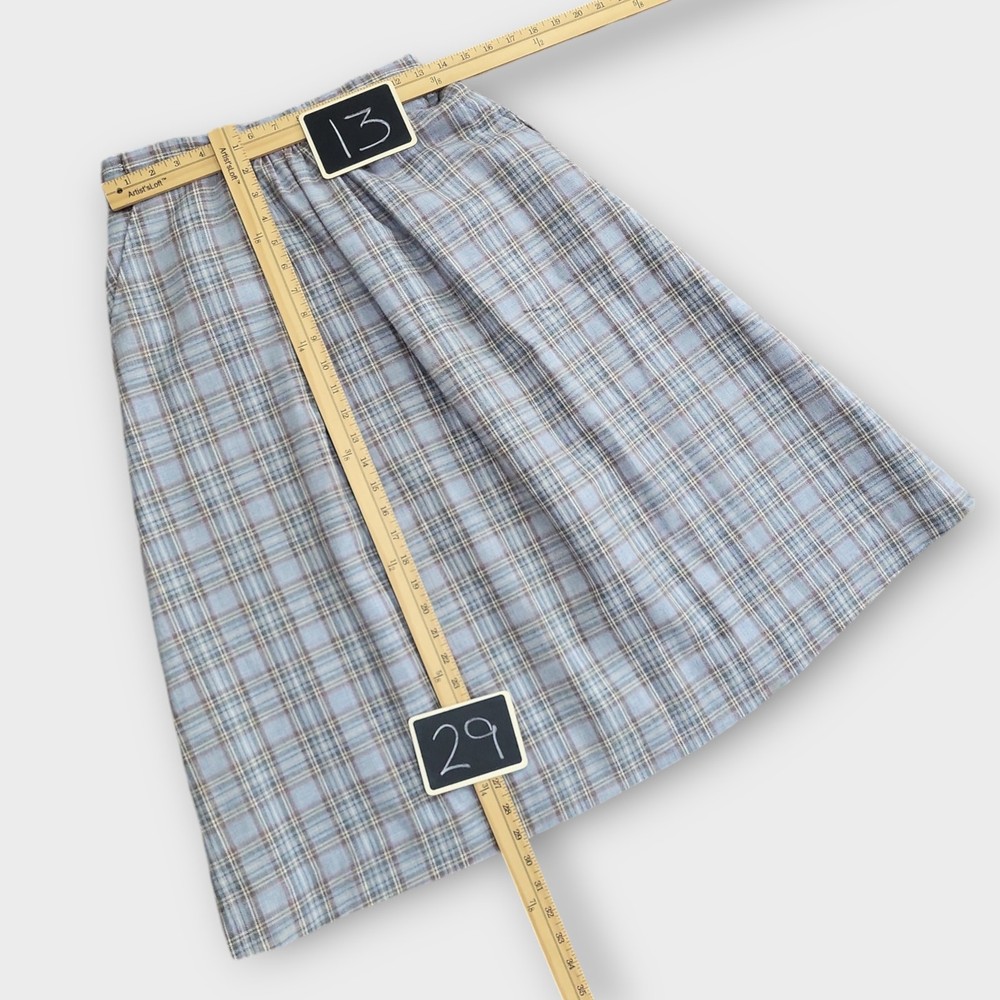 Vintage Plaid Skirt SIZE: No size tag. Based on measurements, seems around a size XS maybe a S. 26 inch waist *** ~ Approx measurements in pics CONDITION: Preloved and in Great Condition. No holes, tears, stains FABRIC: No fabric Tag. Based on feel, I’d say wool, or wool blend DETAILS: ~ Light Blue and Gray Plaid ~ No tags, I think it’s handmade ~ Pockets ~ Hook and Eye with Zipper closure on side of waist ~ A Line ~ Knee Length to Below Knee Tea Length depending on height ~ Vintage. I think it’s vintage based on style ~ Vintage, Retro, Preppy, Academia, *** Make sure it fits - Sizing varies between brands and decades. It's best to know your body measurements and compare them to clothing measurements and your preferred fit. If you need help on how to do this, or additional measurements, let me know. I will be happy to help.
