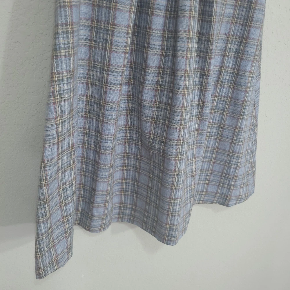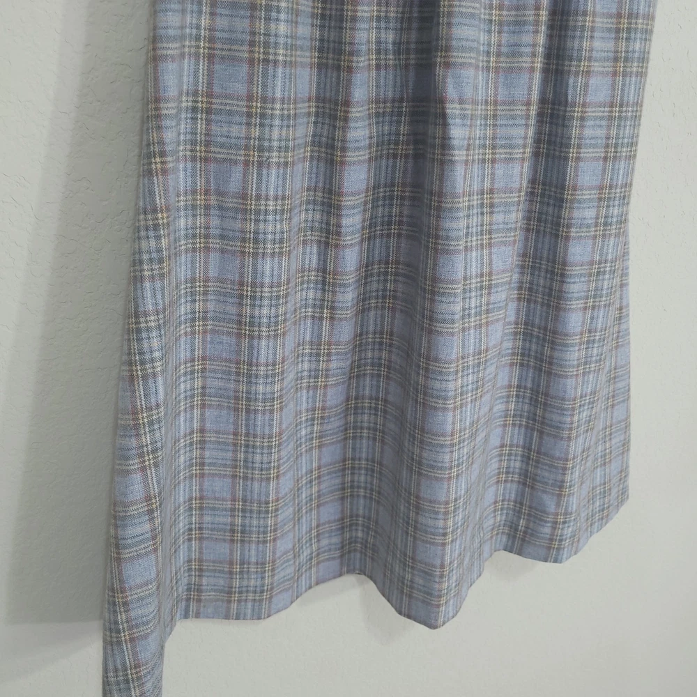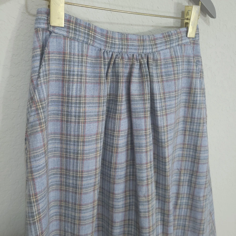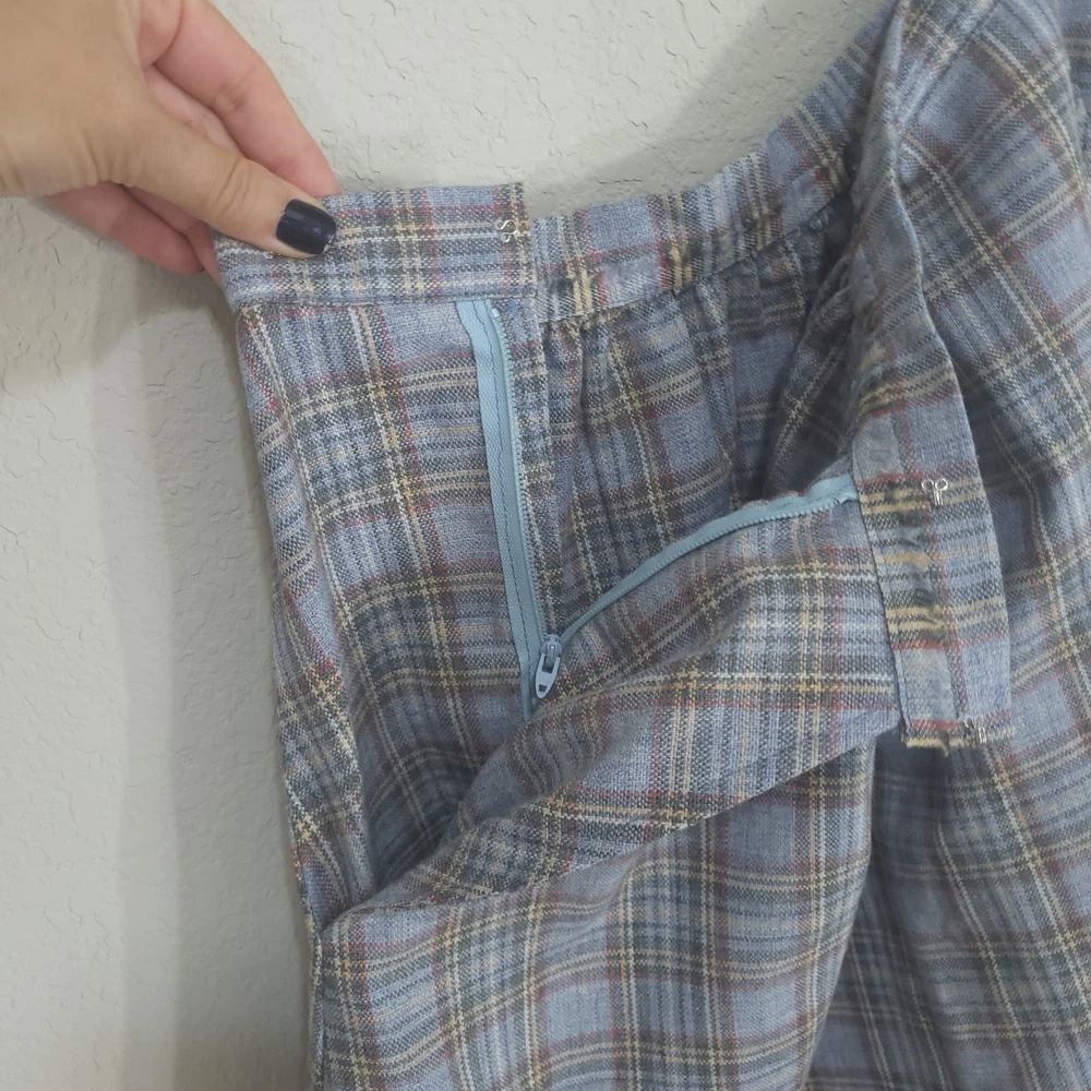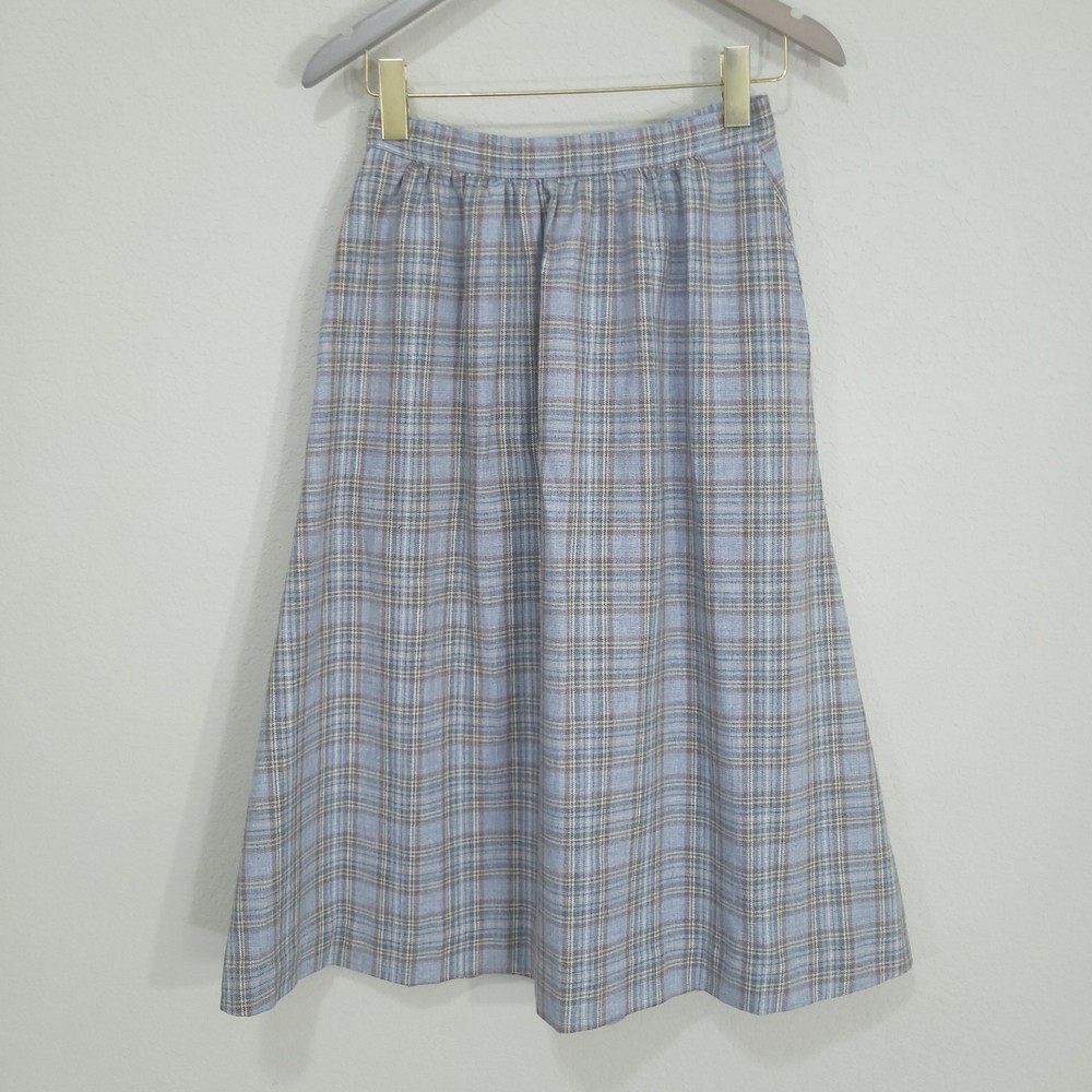 Vintage Plaid Skirt SIZE: No size tag. Based on measurements, seems around a size XS maybe a S. 26 inch waist *** ~ Approx measurements in pics CONDITION: Preloved and in Great Condition. No holes, tears, stains FABRIC: No fabric Tag. Based on feel, I’d say wool, or wool blend DETAILS: ~ Light Blue and Gray Plaid ~ No tags, I think it’s handmade ~ Pockets ~ Hook and Eye with Zipper closure on side of waist ~ A Line ~ Knee Length to Below Knee Tea Length depending on height ~ Vintage. I think it’s vintage based on style ~ Vintage, Retro, Preppy, Academia, *** Make sure it fits - Sizing varies between brands and decades. It's best to know your body measurements and compare them to clothing measurements and your preferred fit. If you need help on how to do this, or additional measurements, let me know. I will be happy to help.