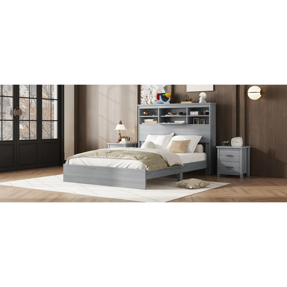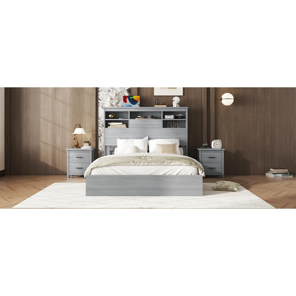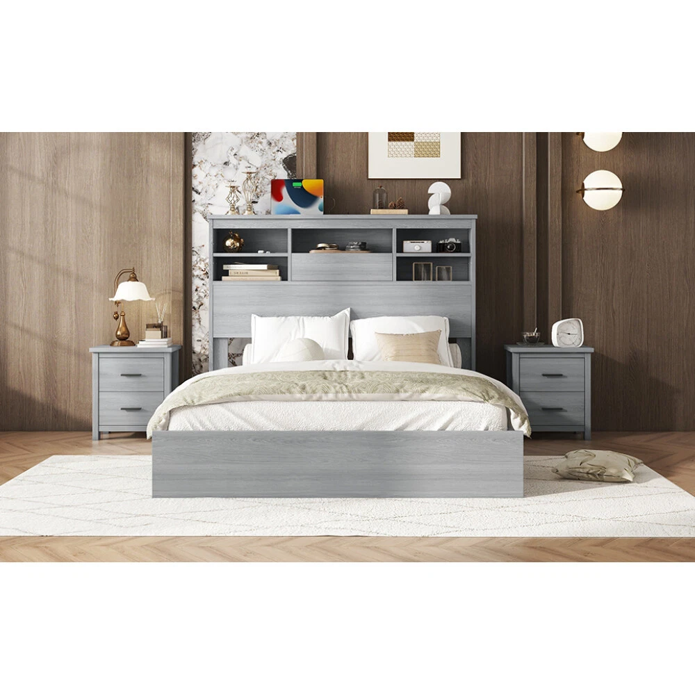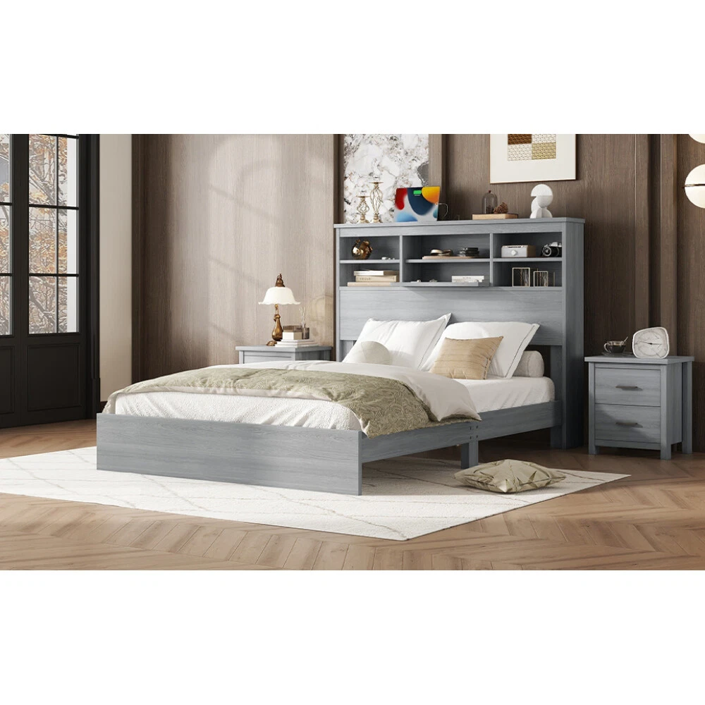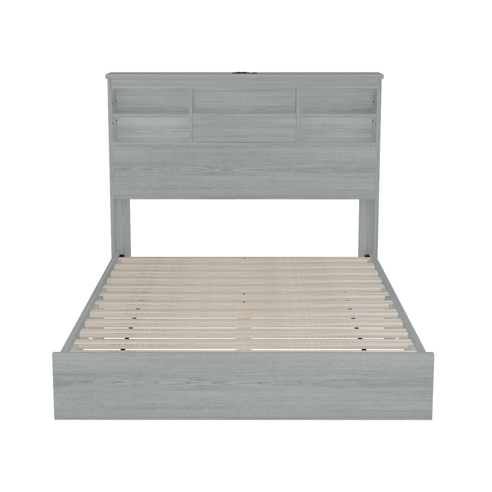 Double Storage Headboard:There are a total of six storage compartments at the head of the bed, giving you plenty of space to categorize your essentials and keep them at hand while you rest. With USB Ports and Sockets:There are two sockets and two USB ports at the head of the bed, which can fully meet your charging needs, so you can comfortably charge in bed and make your life more convenient. Vintage Design Style: The surface of this bed is modeled after the original grain of the wooden planks, which makes you feel like being in the farm, forest, and close contact with nature. Solid Construction and No Spring Box Required:This bed is made of MDF and plywood, structurally stable, with a weight capacity of 700 pounds, which will allow you to sleep soundly, and the bed has slats, eliminating the need for a box spring and saving you the cost of purchasing a box spring. Simple assembly: The product comes in a package and comes with instructions, making installation simple. Queen Size Vintage Platform Bed,With Storage Headboard and Charging Station, Light Gray The surface of this bed mimics the original texture of wood planks, making it seem as if you are in close contact with nature while you sleep. The double storage headboard allows you to compartmentalize your essentials for visual comfort and easy access to the bed space. There are also two sockets and two USB ports on the headboard, which are perfectly suited to meet your charging needs, so you won't have to worry about power when using your mobile devices. In addition, the sturdy construction has a weight capacity of 700 pounds, allowing you to sleep soundly.