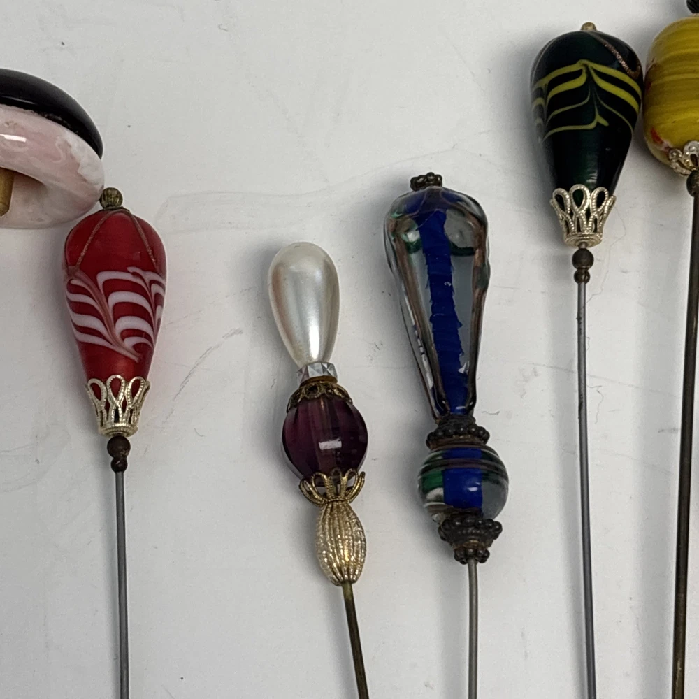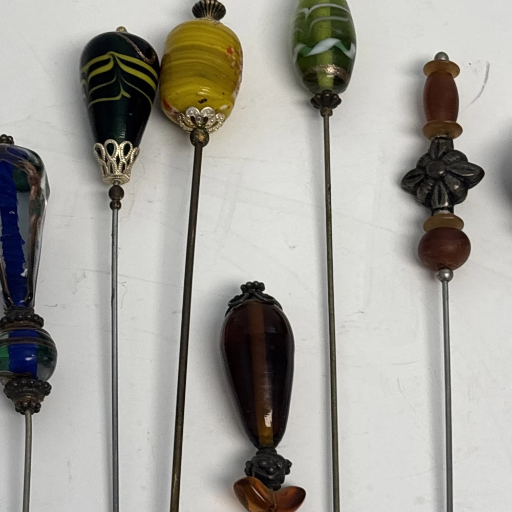 $ 10.56VINTAGE DECORATIVE GREEN GLASS BEAD LONG HAT / HAIR PIN 8"