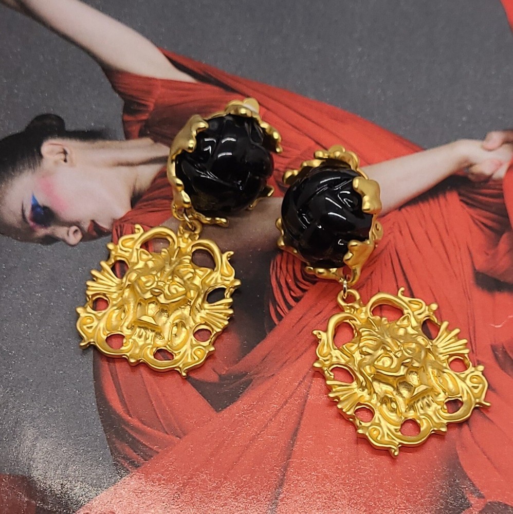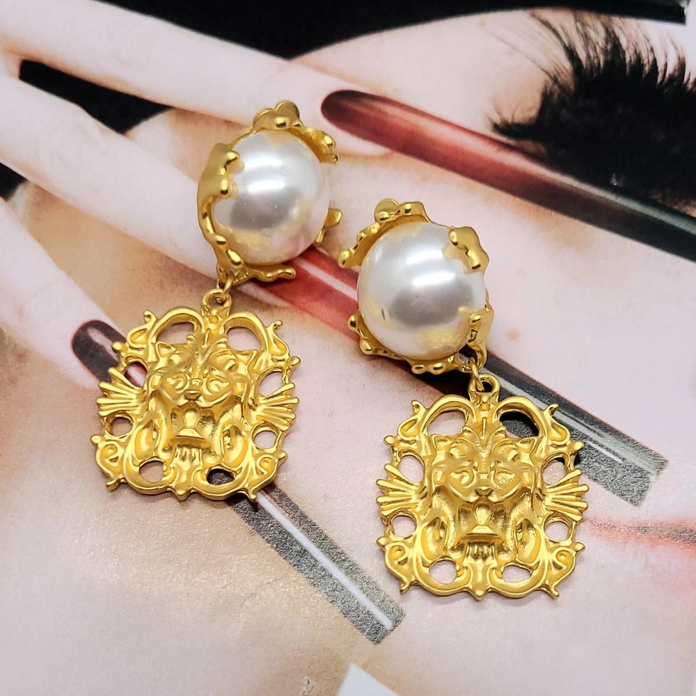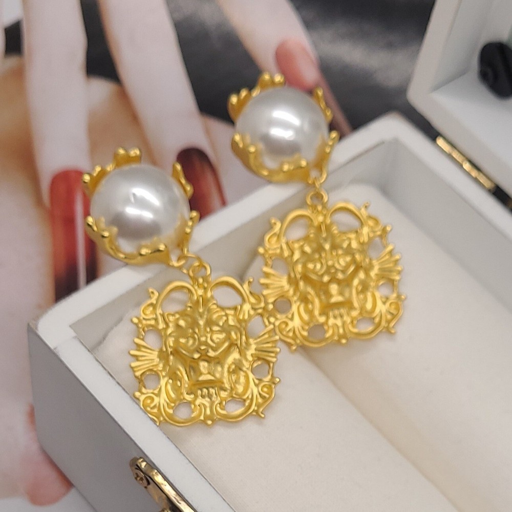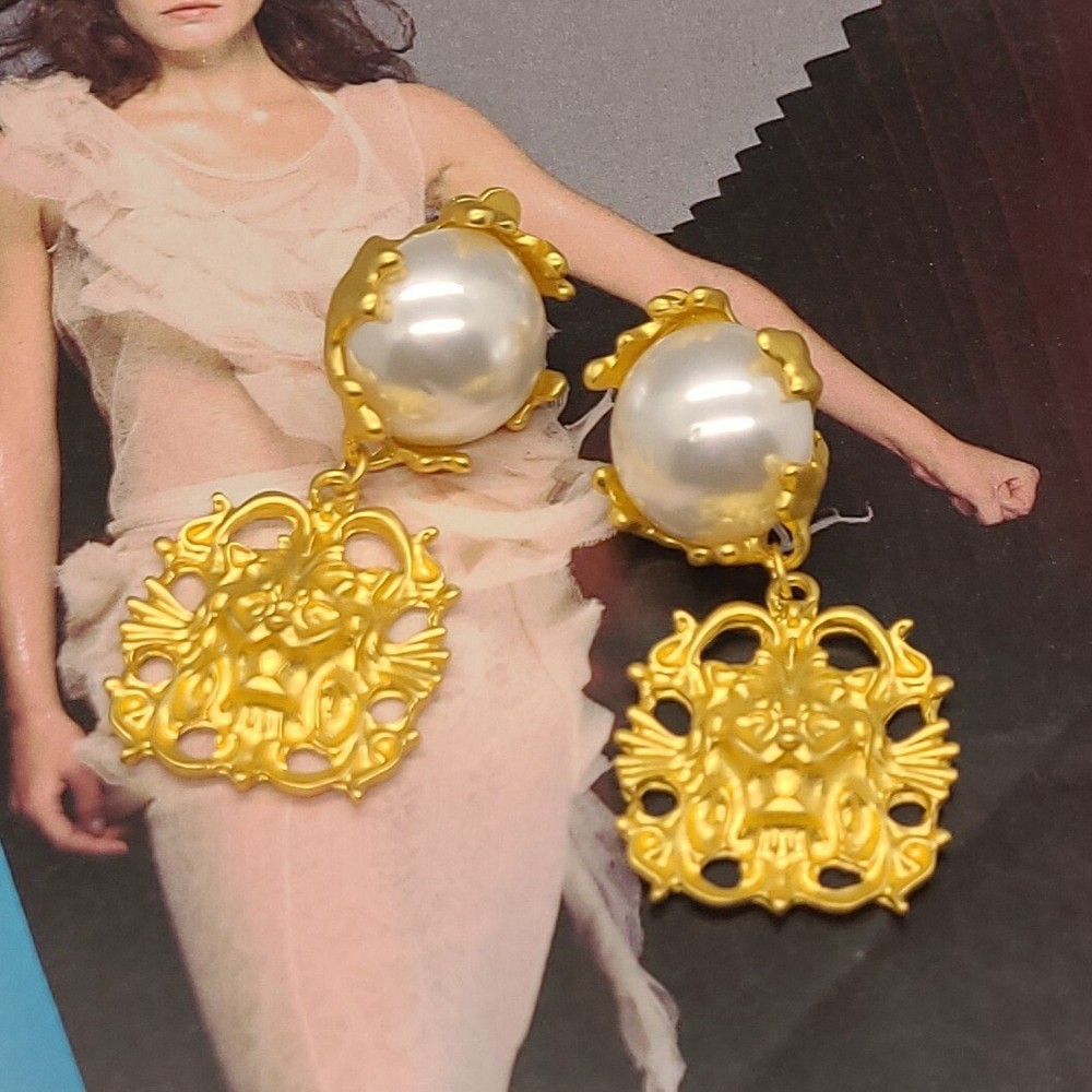 Add a touch of vintage elegance to your style with these stunning French palace style pearl embellished gold pendant clip-on earrings. The earrings feature a lion head design that exudes strength and confidence. The pearl main stone adds a touch of sophistication to the overall look. These yellow gold plated earrings are perfect for any occasion, whether it's an anniversary or a birthday. The dangle/drop style and the beauty, art, & animals make these earrings a must-have for any jewelry collection. The earrings are 2.56 inches in length and are designed to be worn on the lobe. Vintage Lion Head French Palace Style Pearl Gold Pendant Clip On Earrings 2.56" Length 1.18" Width Clip On Gold Plated