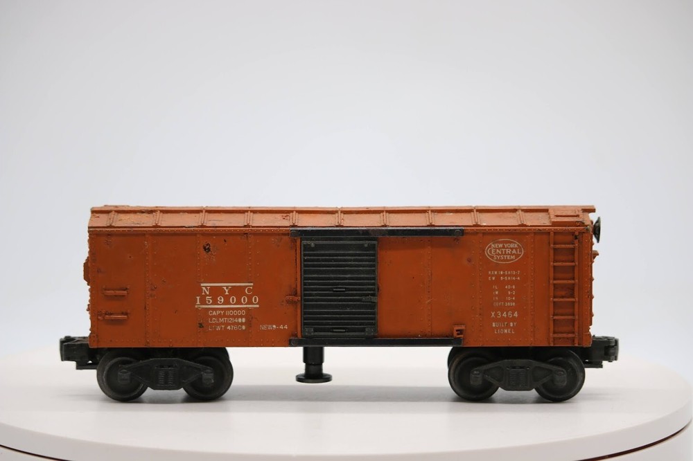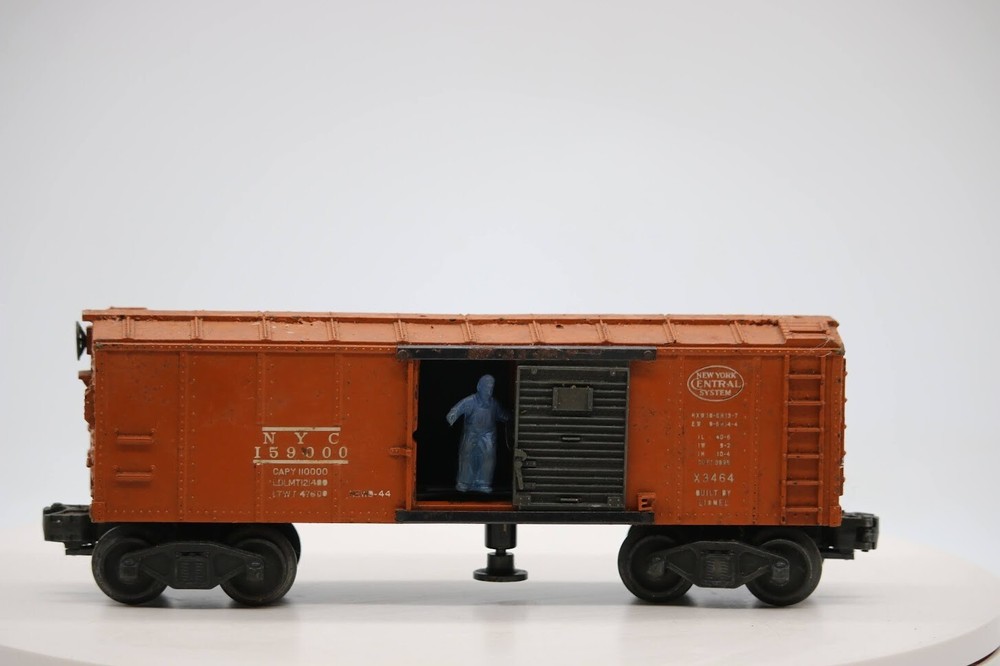 Vintage O Scale Lionel NYC 159000 3464 Operating Box Car SKU#003310 Look closely at the pictures to see further details. We ships USPS PLEASE see photos for detailed condition!! There may be pieces that are missing or broken including, but not limited to, couplers, brake wheels, steps, ladders, railings, etc. May need detailed cleaning. PLEASE LOOK AT THE PHOTOS CAREFULLY BEFORE PURCHASING!! If you are purchasing more than one item from us and would like combined shipping, PLEASE request an adjusted invoice from us while still in the cart and BEFORE paying. Ebay does not usually calculate combined shipping accurately and you might get overcharged. Please be aware that when we photograph items, we use lighting that will show the details well. Although we try to present the product as accurately as possible, the lighting may affect the overall look of the item by appearing lighter/darker or possibly a different hue than the actual item. Depending on the type of lighting you have in your home, there may be some differences between the photos and the actual item. If this is a concern of yours, please feel free to request additional photos made in natural lighting or ask for a more detailed description of the item PRIOR TO PURCHASE! PLEASE NOTE: We greatly appreciate your interest in our item for sale. We look forward to a pleasant, quick and satisfying transaction for everybody, so please note the following information before bidding. Thank you! ITEM DESCRIPTIONS: * We will try to describe items well and provide plenty of photos. Please review these carefully before bidding or purchasing. * Only the items pictured and described are what you will receive when purchased. * We will occasionally offer an item clearly marked "AS-IS". This means that we are not sure if it works because we are unable to test it for whatever reason. We will offer these at a discounted price then a similar "working" item. It is possible that these items will work fine, but it also is possible that these items are more useful for their parts. Please only bid on or purchase these items if you are well aware of this, as we will only provide refunds of actual item price (no shipping cost refunds) for these items. * If you have any questions that aren't addressed by the descriptions or photos, please feel free to ask before you bid. SHIPPING: * We usually do not offer shipping to international addresses, but ARE WILLING TO TAKE CONSIDERATIONS. * We try to pack items as carefully as possible, but damage may occur during shipping. If you receive an item that was damaged in shipping, please contact us and we will work with you to resolve the problem. * We will combine shipping costs for all items the same buyer purchases from us within 2 days. Please wait to pay for items until you're done shopping with us. Please contact us if you're expecting to buy more items from us, or to have us adjust the shipping costs. * We will usually ship items out within 24 hours of payment being received Sunday through Friday at noon. We will notify the buyer if there will be a delay in shipping for some reason. Please allow additional time for holidays and weekends when the post office is closed. If payment is received after noon (EST) on Friday, the item might not be shipped until the following Monday. * We do try to recycle shipping materials as much as possible. RETURNS: We abide by eBay's Money Back Guarantee. We definitely want our customers to be happy with their purchase! You may return an item within 30 days of receiving it with the following guidelines: * If the item is defective or damaged (unless we clearly marked the listing "AS-IS"), the buyer will receive a full refund after the buyer returns it and it is received by us. Customers who falsely claim their item is defective, damaged, or not as described in order to receive a full refund and free return shipping will be permanently blocked from making future purchases from us. * If the item is as described (including "AS-IS" items) and the buyer decides for any other reason than defective/damaged to return it, only the actual price of the item will be refunded once it has been returned and it is received by us. The buyer will be asked to pay all original and return shipping charges. This includes all reasons other than defective/damaged, including wrong size, wrong type, changed mind, etc. All "AS-IS" items will fall into this category of return. Please make sure the item is what you want before purchasing it. * Please contact us before initiating a refund request. FEEDBACK: We always leave feedback at the end of transaction. We consider the transaction to be over when we receive feedback from the buyer confirming the item arrived satisfactorily. If you are unsatisfied with your purchase please contact us before leaving neutral or negative feedback. WE APPRECIATE POSITIVE FEEDBACK IF YOU ARE SATISFIED WITH YOUR PURCHASE! THANK YOU FOR YOUR INTEREST IN THIS ITEM!