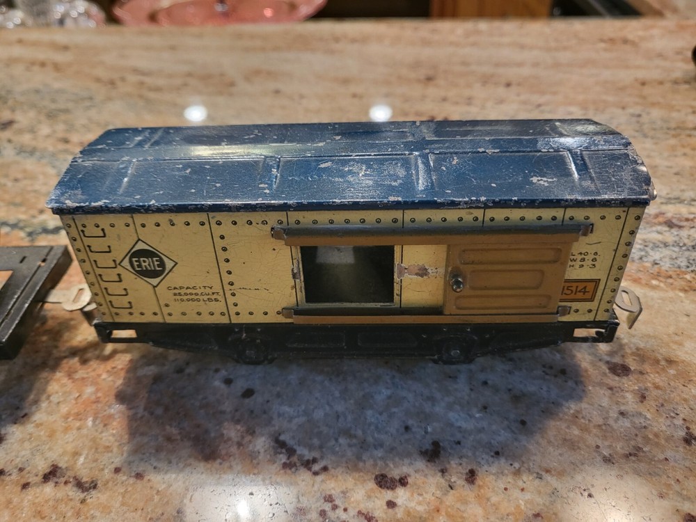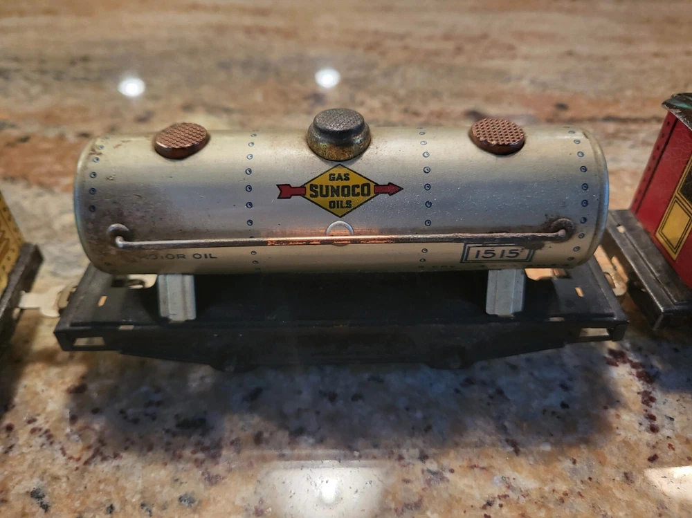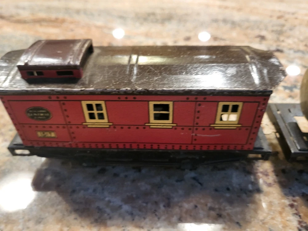 1934 Set #1529 #1506L loco.#1502 Lionel Lines wind up, Runs Good Removable Key (No Key) Black wheels Copper Trim Brake,Light,Bell (work) Play ware, see pic for details (AS IS) #1514 Boxcar #1515 Tank Car #1517 Caboose (No Couplers) (Brown Roof,Brown Cupola Roof) Play ware, see pic for details (AS IS)