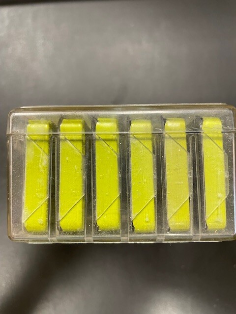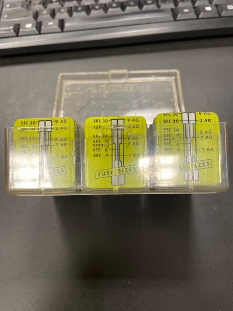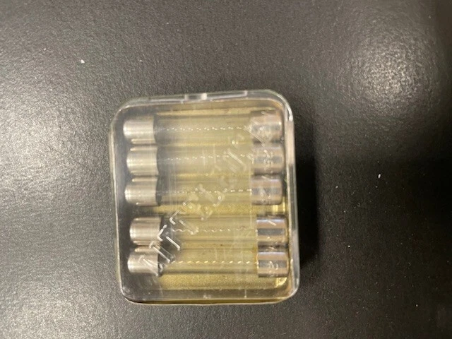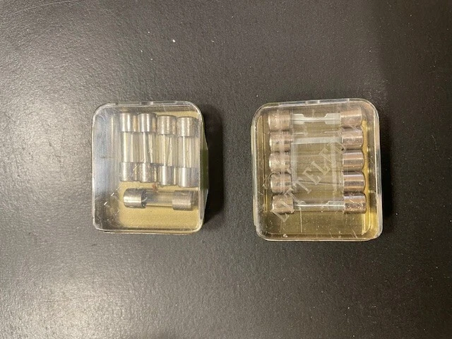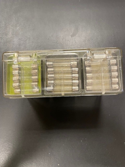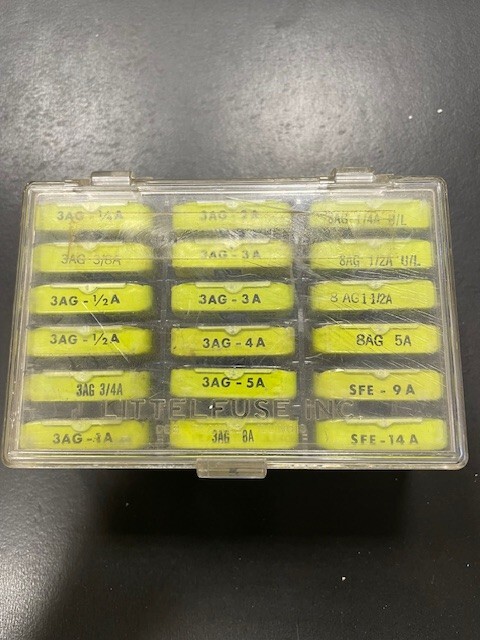 This is a set of 90 size 3AG, 8AG and SFE fast acting fuses in 18 vintage Littelfuse metal / plastic tins, themselves contained in a plastic case. Some of the fuses and tins are a bit dirty, dusty, cloudy, scratched and/or shelf-worn from long storage. Others are still bright and shiney. The plastic case has yellowed, is scratched and has some tape residue on it. The top closes properly but does not snap securely shut. Please review the pictures carefully before purchasing. Each individual tin contains 5 fuses: 3AG 1/4 amp, 3AG 3/8 amp, 3AG 1/2 amp (2 tins), 3AG 3/4 amp, 3AG 1 amp, 3AG 2 amp, 3AG 3 amp (2 tins), 3AG 4 amp, 3AG 5 amp, 3AG 8 amp 8AG 1/4 amp, 8AG 1/2 amp, 8AG 1 1/2 amp, 8 AG 5 amp SFE 9 amp, SFE 14 amp Size 3AG fuses are 1/4" by 1 1/4" (or 6.3 x 32mm) and may alternatively be designated as size AGC. Size 8AG fuses are 1/4" by 1" (or 6.3 x 25mm) and may alternatively be designated as size AGX. SFE fuses are 1/4" in diameter and vary in length by their current rating. These fuses are designed to provide precise regulation of current in automotive, industrial, radio and other electronic applications. Many people even keep the handy (but no-longer-made) metal tins with see-through covers after they become empty.