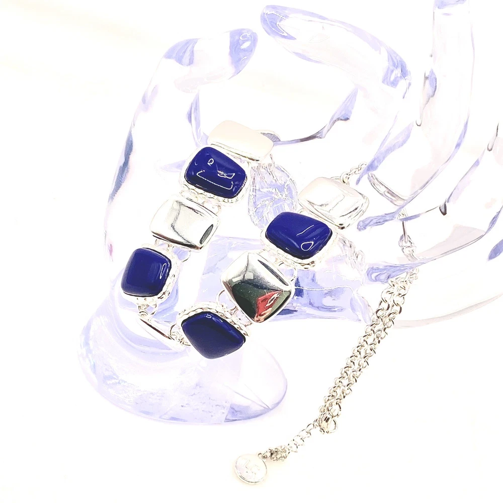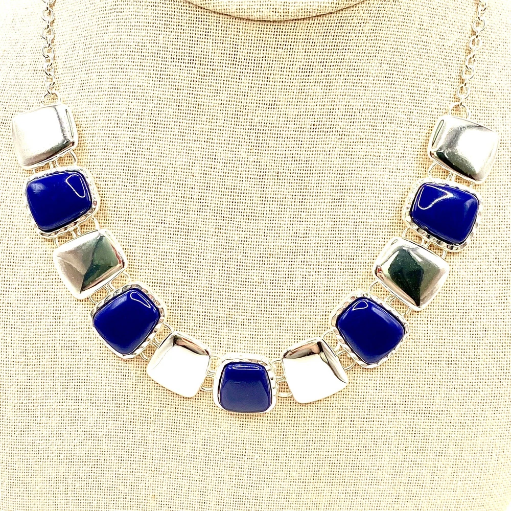 Add a touch of vintage charm to your outfit with this stunning Liz Claiborne necklace. The silver-tone chain features a unique oval link and a lobster closure, while the pendant shape is a beautiful rectangle with a navy blue color and silver charms. The necklace is 17 inches long and has an adjustable feature, making it suitable for any occasion, whether it's a special event like a wedding or anniversary, or an everyday accessory. The necklace has a classic and timeless design, with a beachy and bohemian theme that is perfect for any fashion-conscious woman. The piece is signed and has a vintage feel, but it is also modern and eye-catching. Whether you're looking for a gift for a loved one or treating yourself, this Liz Claiborne necklace is a must-have addition to any jewelry collection. Vintage Liz Claiborne Silver Tone Navy Blue Silver Charms Choker Bib Necklace C. This necklace is gorgeous! The deep blue glass stones are mesmerizing. Very shiny. People are sure to notice. It comes with a 2 inch extender, which is tangled at the end. My fingers don’t want to work. This is a pre-owned piece. It may cleaning. There may be scratching,, chips, normal wear, missing stones,… See Photos. If you have any questions, please feel free to contact me via eBay messaging. Thank you for stopping by. Make sure to check out other items in my store. Your satisfaction is my priority! Have a wonderful blessed day!