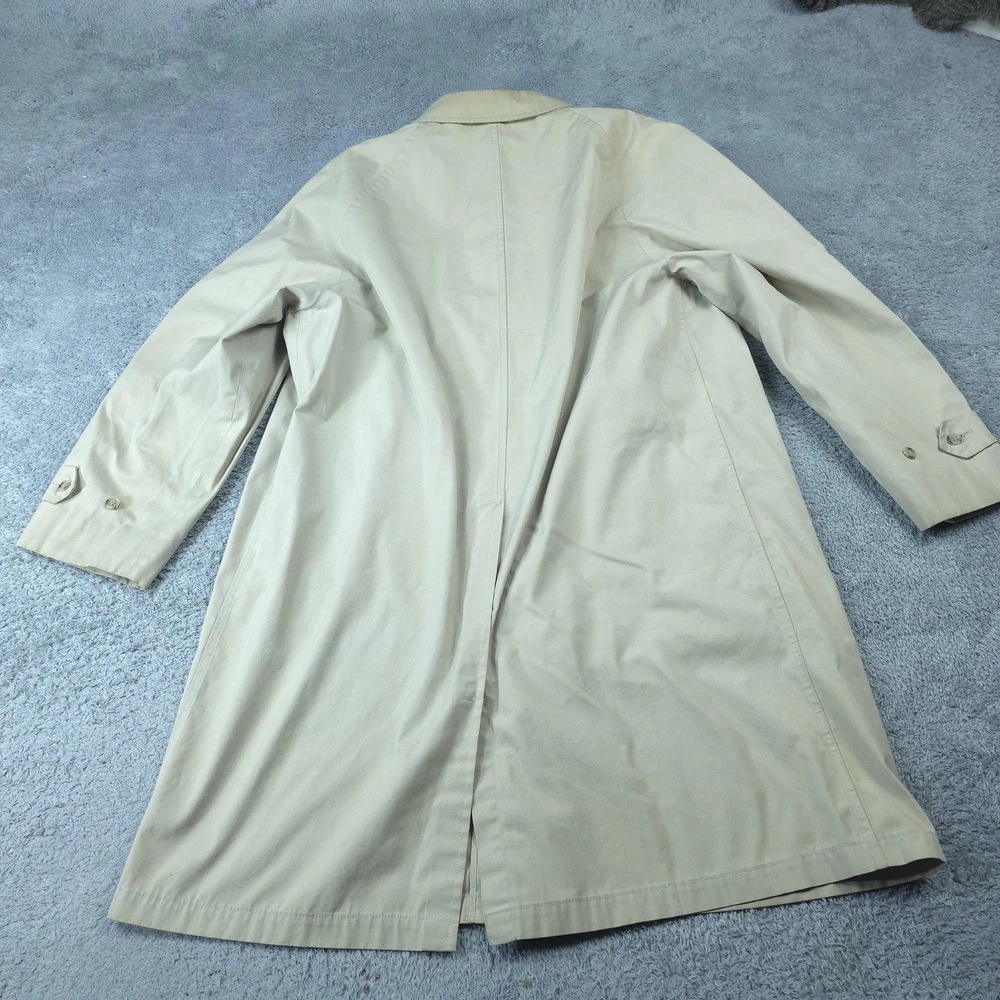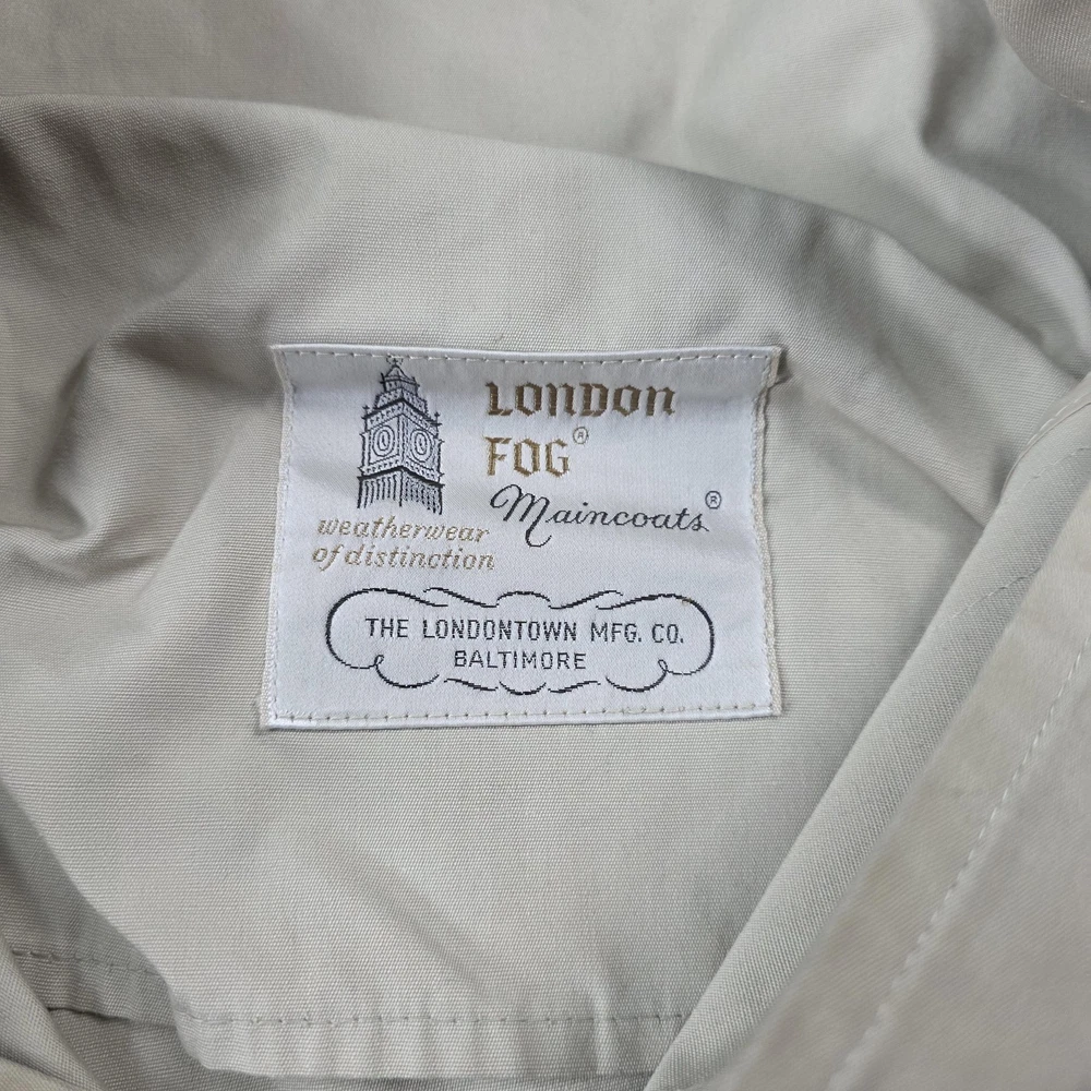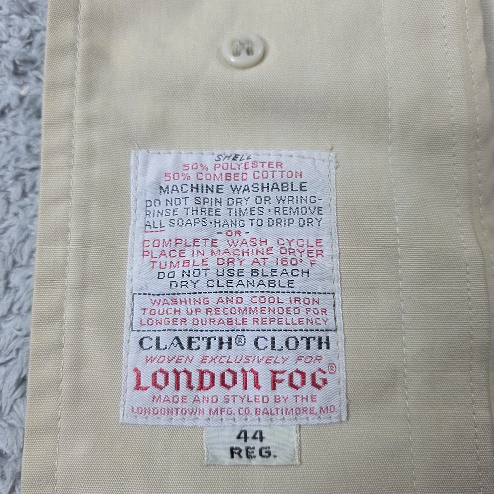 Brand: London Fog Line: London Fog Maincoats "weatherwear of distinction" by The Londontown Mfg. Co., Baltimore. Item: Mens single-breasted trench-style raincoat with classic pointed collar and mid-length overcoat silhouette. Color: Tan/khaki. Size on tag: 44 Regular (Mens). Material: Shell 50% polyester, 50% combed cotton Claeth cloth woven exclusively for London Fog. Country of origin: Made and styled by The Londontown Mfg. Co., Baltimore, Maryland, USA (per interior tag). Details: Covered button front placket, two front slash hand pockets, button-tab cuffs, raglan sleeves for easier layering, center back vent for movement, and water-repellent Claeth cloth fabric designed for everyday weather protection and classic dress outerwear use. Item is in gently worn pre-owned condition. Item may contain normal signs of wear, blemishes, discoloration, creases and/or other signs of distress. Photos depict the exact item you will receive including measurements . Please refer to photos for full details prior to purchasing. If need be please measure against a similar clothing item you own. Items are cleaned in accordance with eBay's policies and standards and stored in a smoke free weather controlled environment. Fast USPS Shipping - 30 Day Free Returns - Hats Ship in a Box