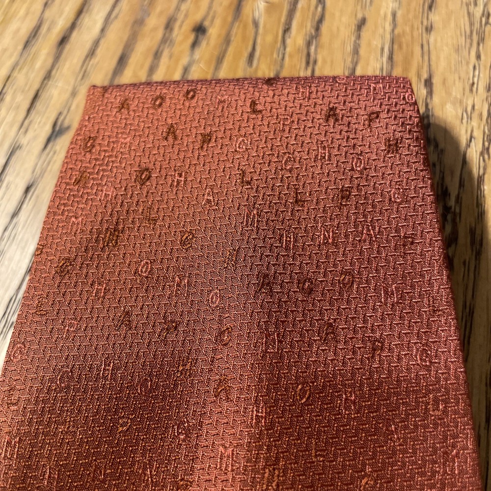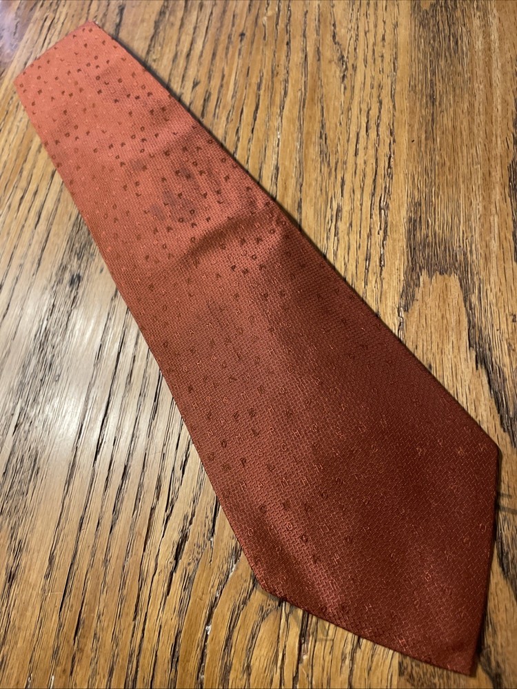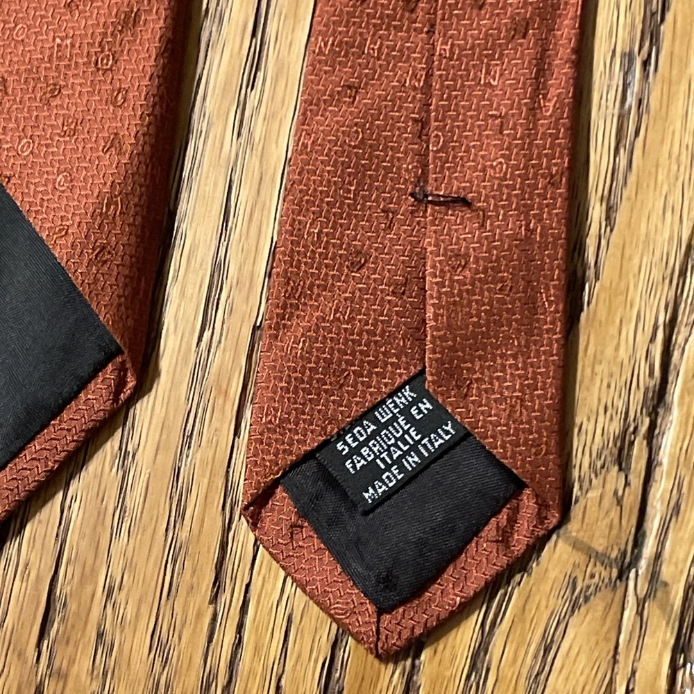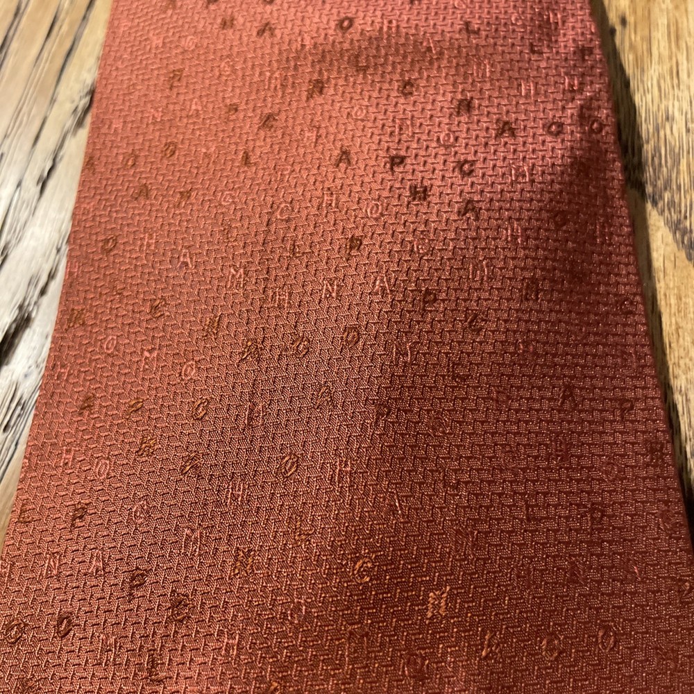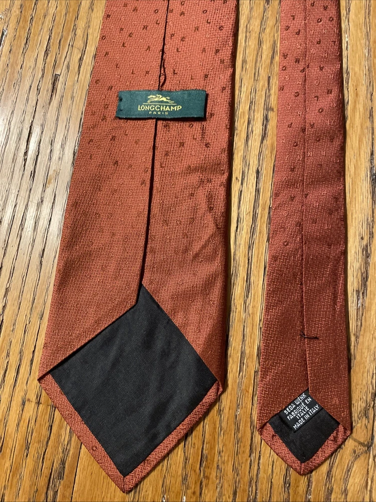 The Vintage Longchamp Paris Scrambled Logo Letters Silk Tie Necktie is a designer accessory crafted in Italy from 100% silk. This classic men's tie features the iconic Longchamp logo in a scrambled pattern, adding a touch of preppy sophistication to any formal outfit. The vintage piece exudes timeless style with its cinnamon color and jacquard fabric, making it a versatile and luxurious addition to any man's wardrobe. Super cool tie - it does have some faint staining however, see pics.