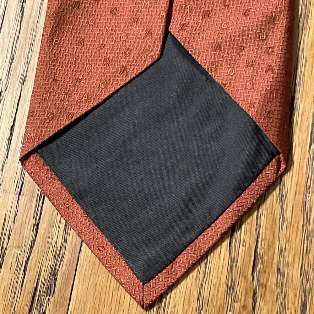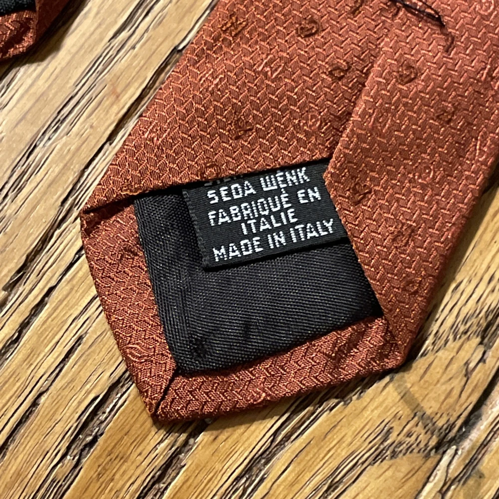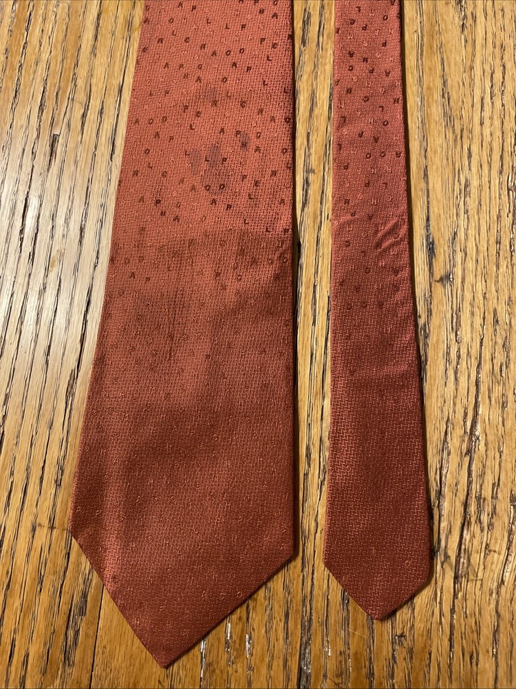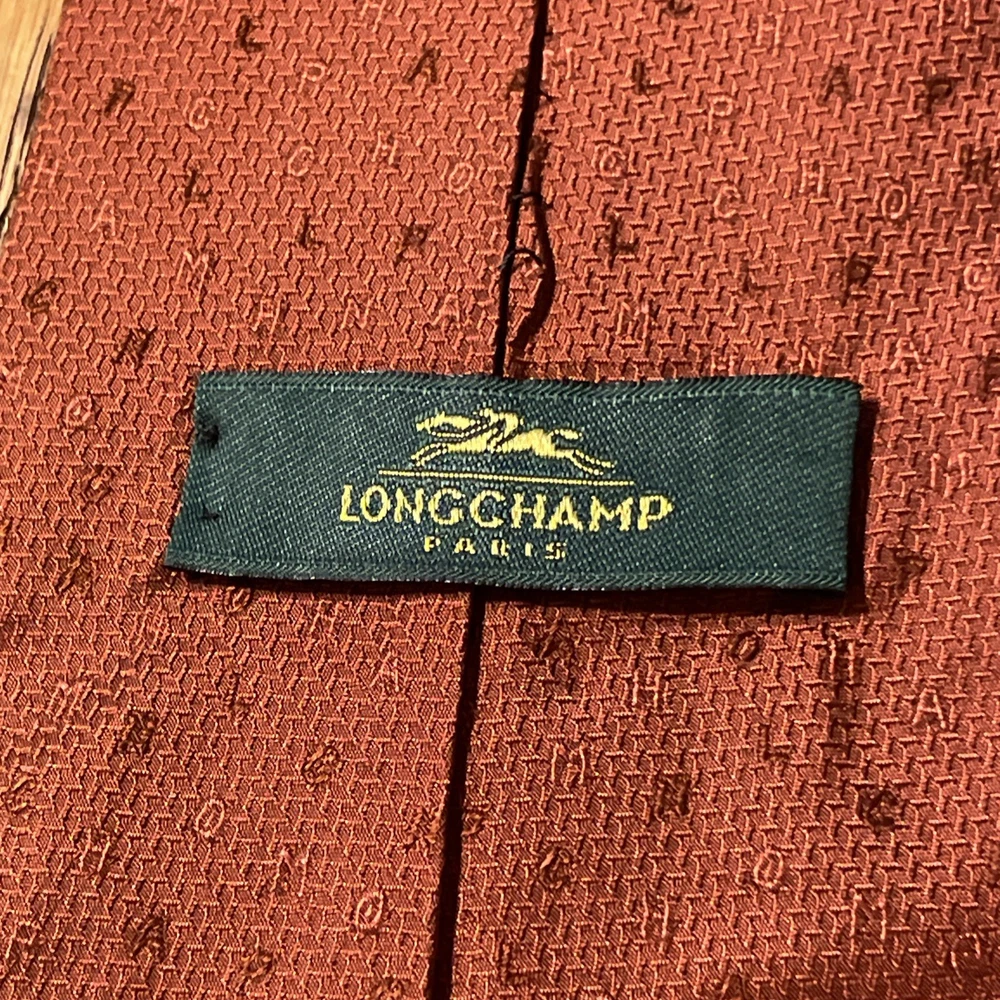 The Vintage Longchamp Paris Scrambled Logo Letters Silk Tie Necktie is a designer accessory crafted in Italy from 100% silk. This classic men's tie features the iconic Longchamp logo in a scrambled pattern, adding a touch of preppy sophistication to any formal outfit. The vintage piece exudes timeless style with its cinnamon color and jacquard fabric, making it a versatile and luxurious addition to any man's wardrobe. Super cool tie - it does have some faint staining however, see pics.
