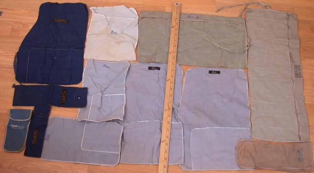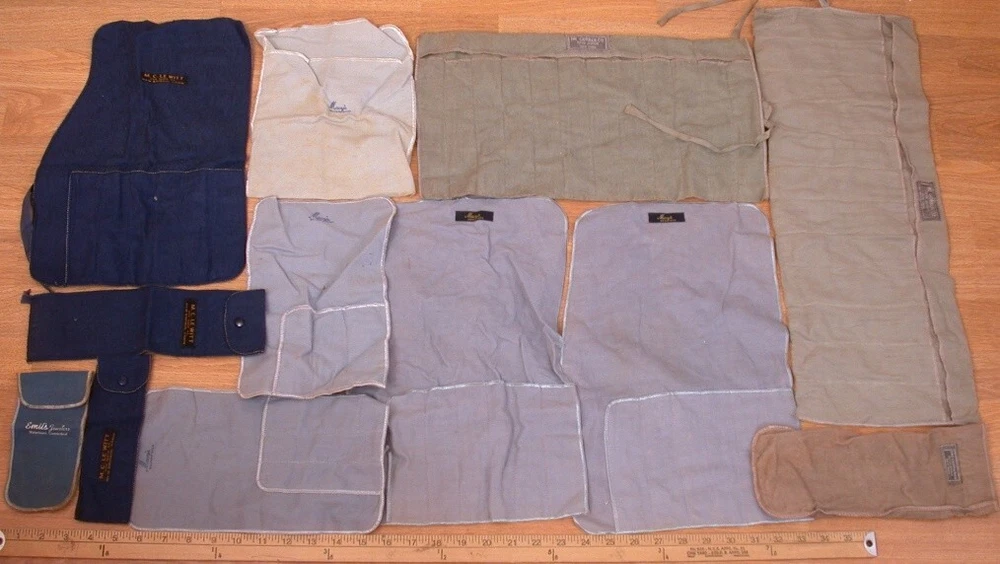 Vintage Lot 12 Cloth Flatware Silverware Storage Anti Tarnish Bag & Roll Please see photos for sizes-note yardstick at sides. 12 bags include: Gorham, Macy's, McLewitt and Emil's Please see all photos for condition. From a smoke and pet free home. I do combine shipping.