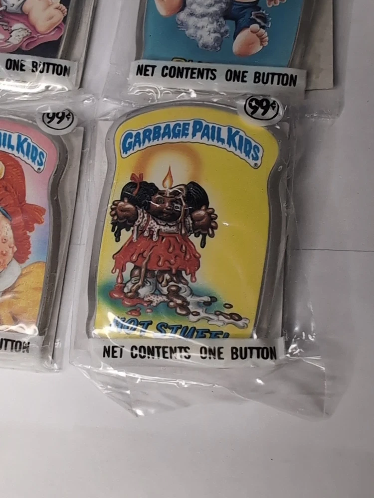 This product is a vintage lot of 4 Garbage Pail Kids pinback buttons from 1986, produced by Topps. These original sealed pins feature multicolor designs and are part of the popular Garbage Pail Kids franchise. these collectible buttons are perfect for fans of comics and non-sport trading cards. The lot includes 4 buttons, making them a great addition to any vintage collection.