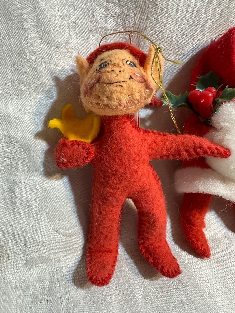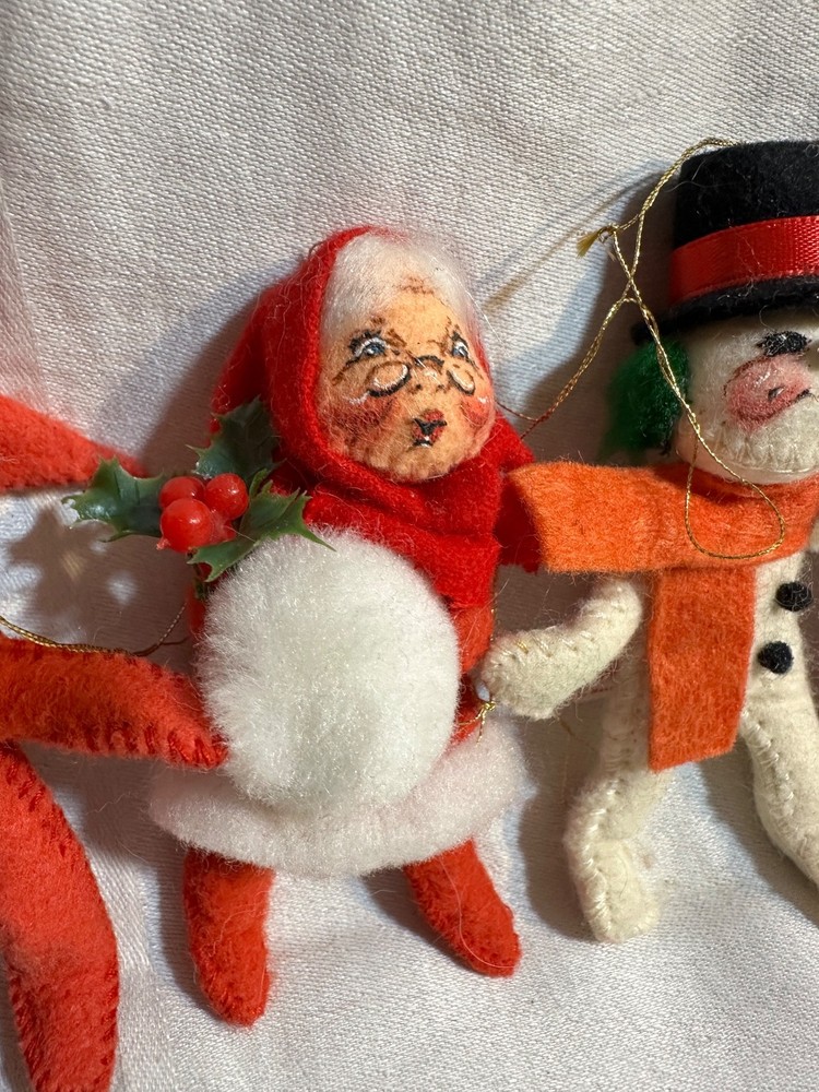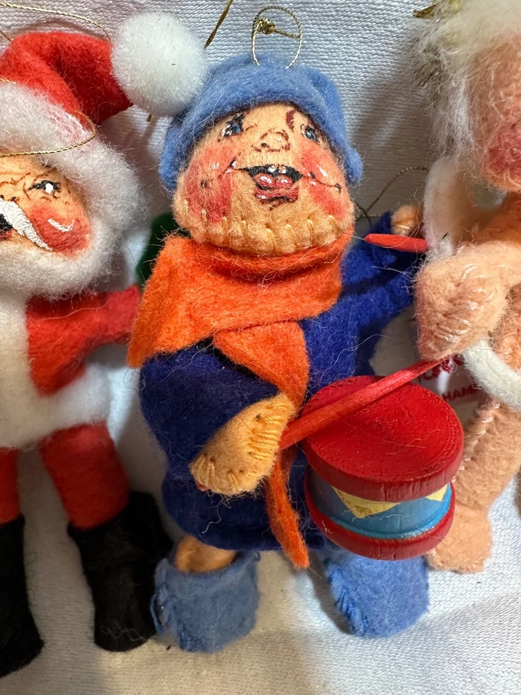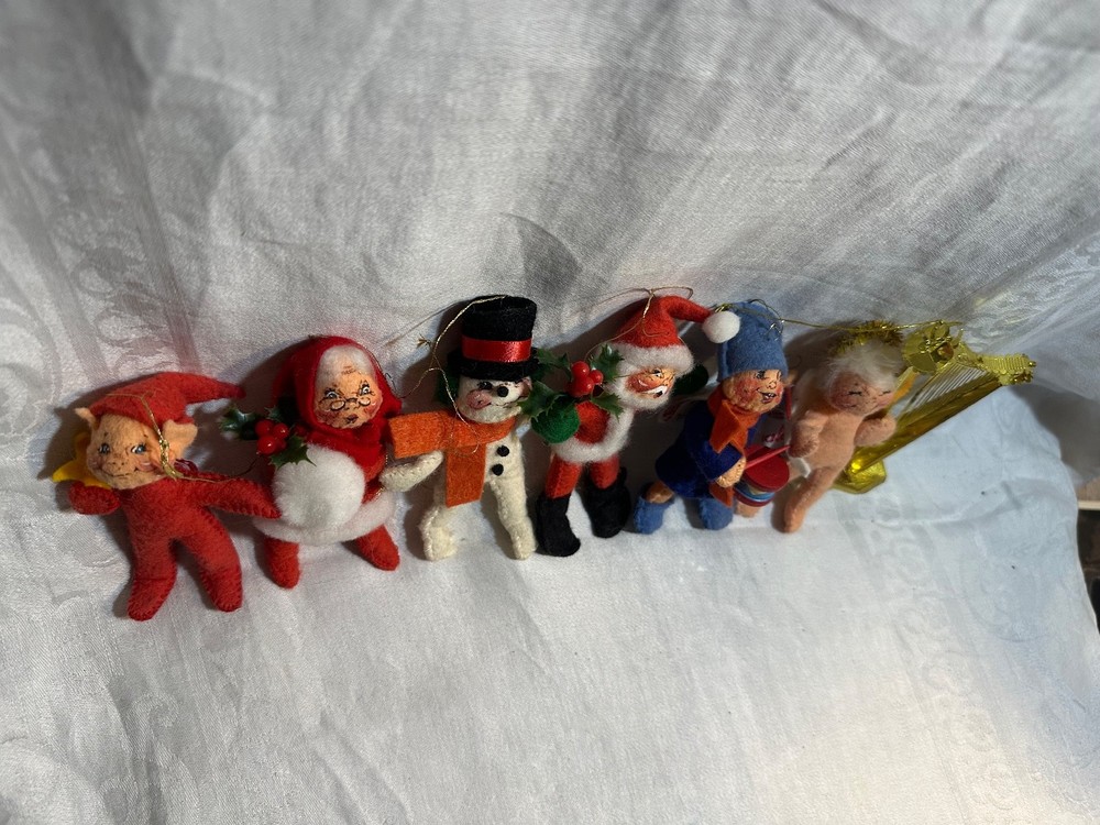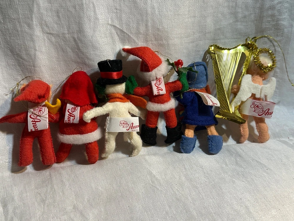 This vintage lot of 6 Annalee felt ornaments from 1987-1997 is a charming addition to any Christmas decor collection. Handmade in Hampshire, United States, these small-sized ornaments feature a multicolor design with a Santa Claus theme. Each ornament measures between 3-4 inches in height and all 6 weighs approximately 3 ounces, making them easy to hang and display. This nostalgic set is a delightful reminder of holiday traditions from the late 20th century. Snowman-1987 Drummer Boy-1987 Elf-1995 Angel-1995 Santa-1996 Mrs.Claus-1997 Does not come an original packaging