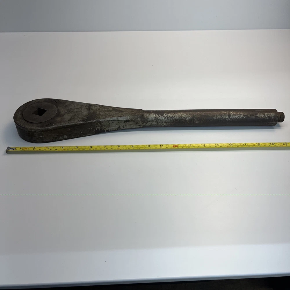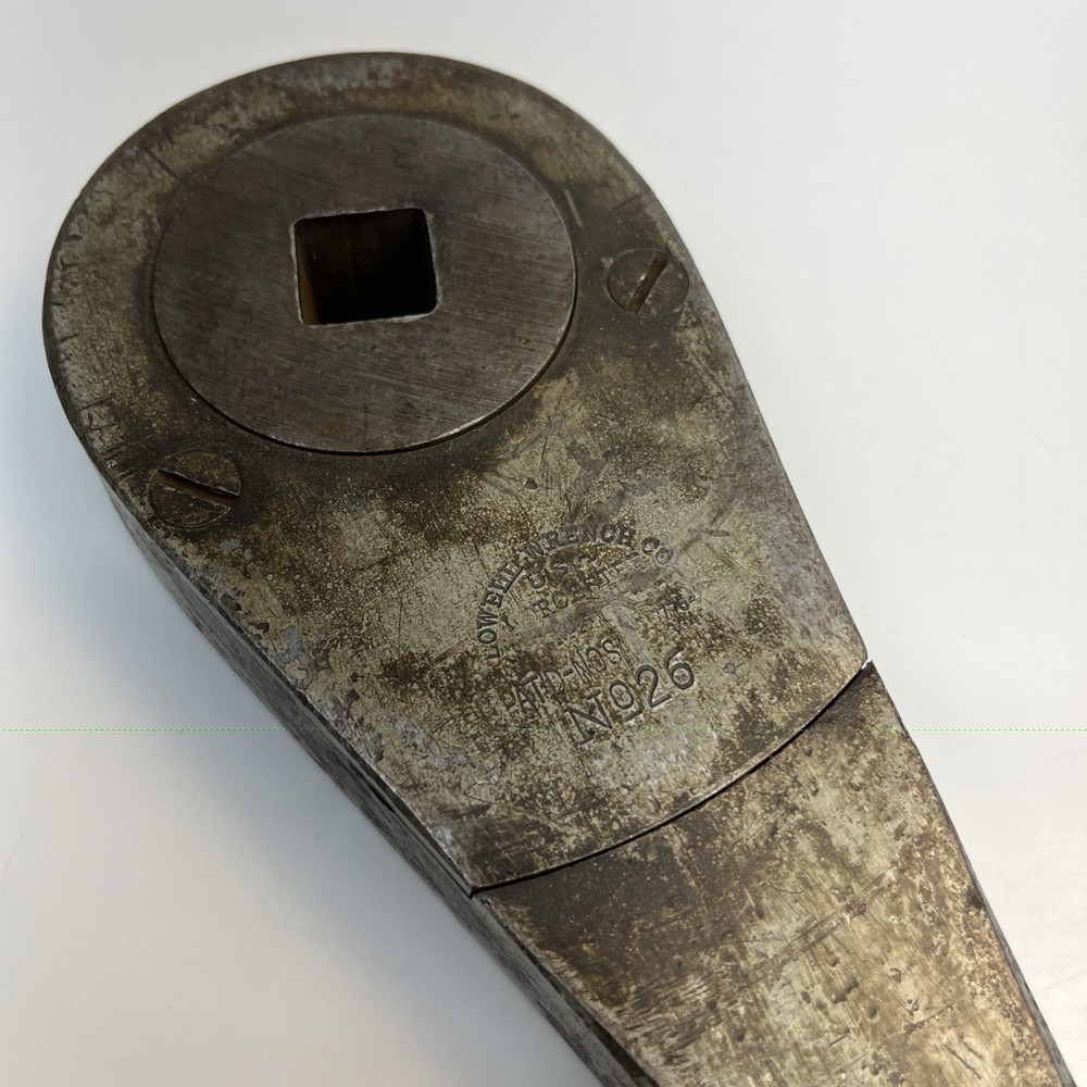 Marked Lowell Wrench Co Worcester Mass USA and No 26. Overall length is 20 in. Total weight is approximately 10 lbs 8 oz. Condition Used vintage condition. Shows surface wear, oxidation, and finish loss from age and use. Head and handle show impact marks and typical industrial wear. Knurled end cap present and intact.