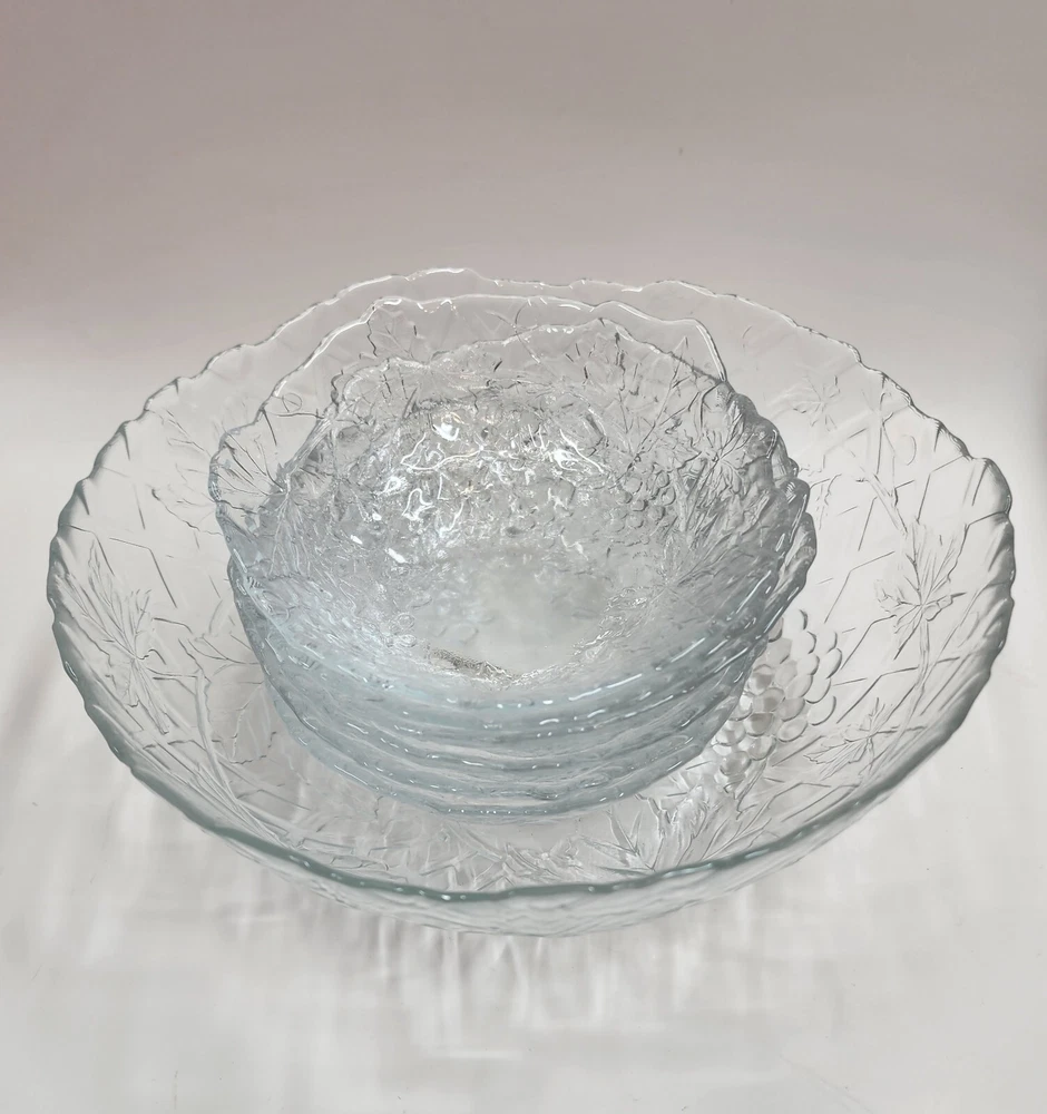 Vintage Luminarc Melanie 7 Piece Salad Set 1 Large Serving Bowl & 6 Small All Purpose Bowls Large Serving Bowl: 10.25" diameter 4" height Small all purpose bowls: 6.5" diameter 2" height