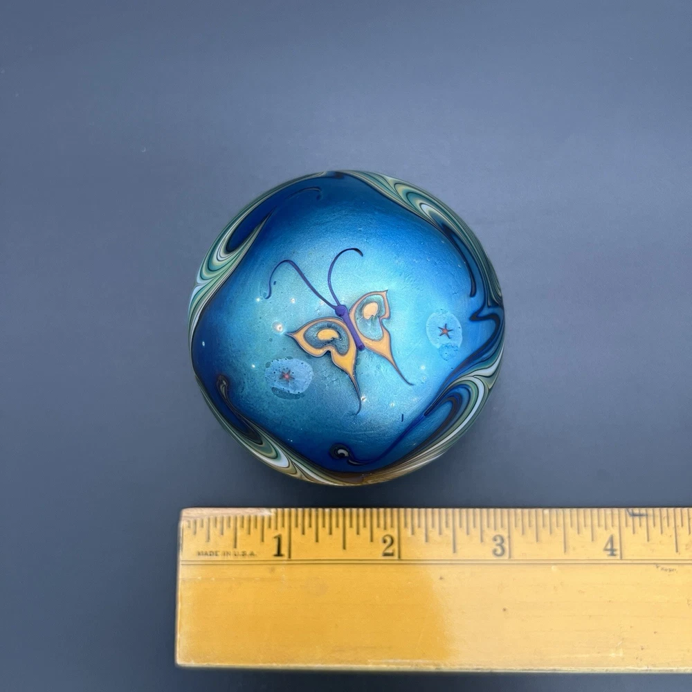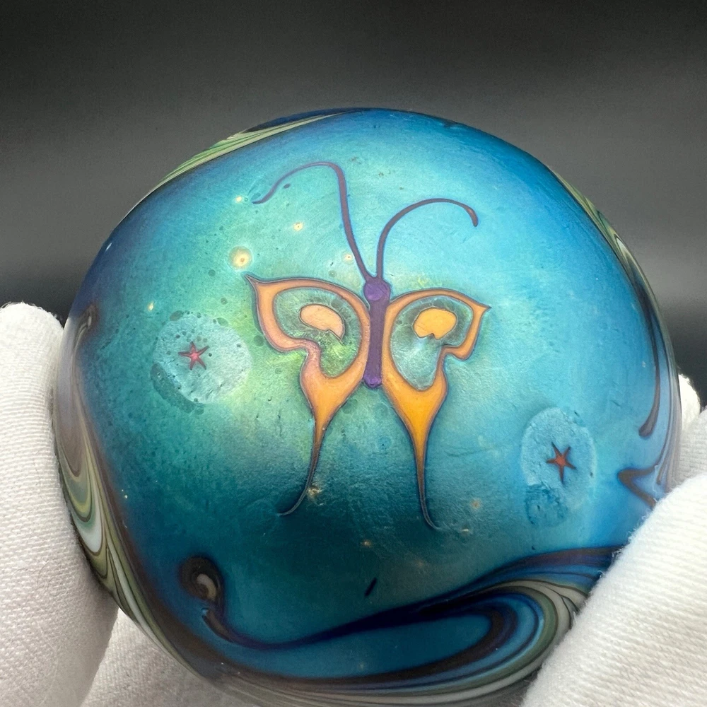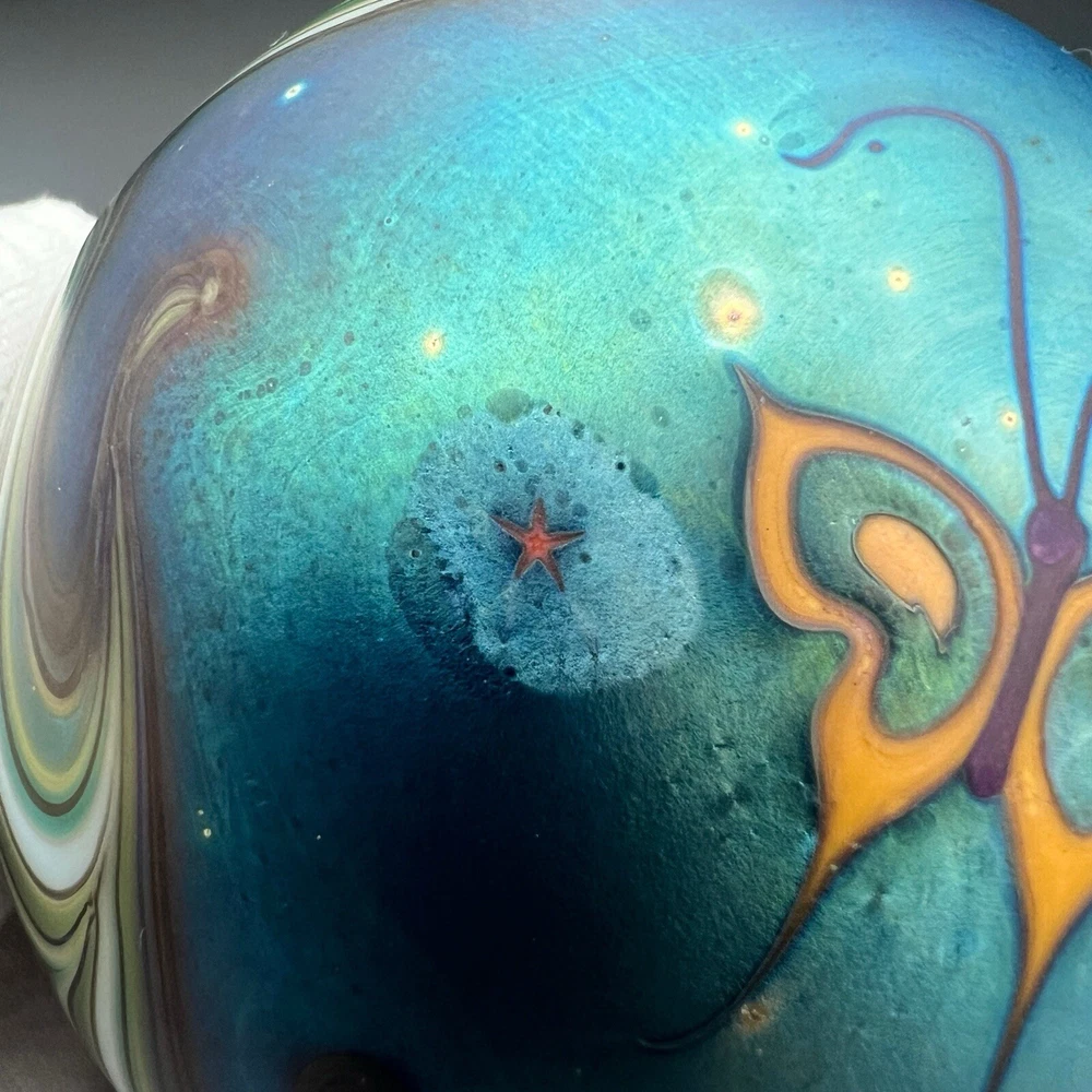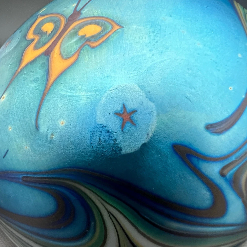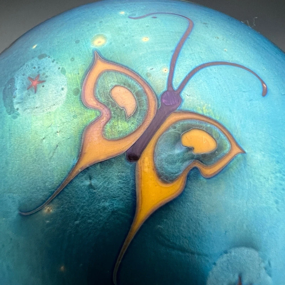 Signed Lundberg Studios art glass paperweight features an orange and purple butterfly with red stars above a swirling green and cream colored sea. 3”x2.25”