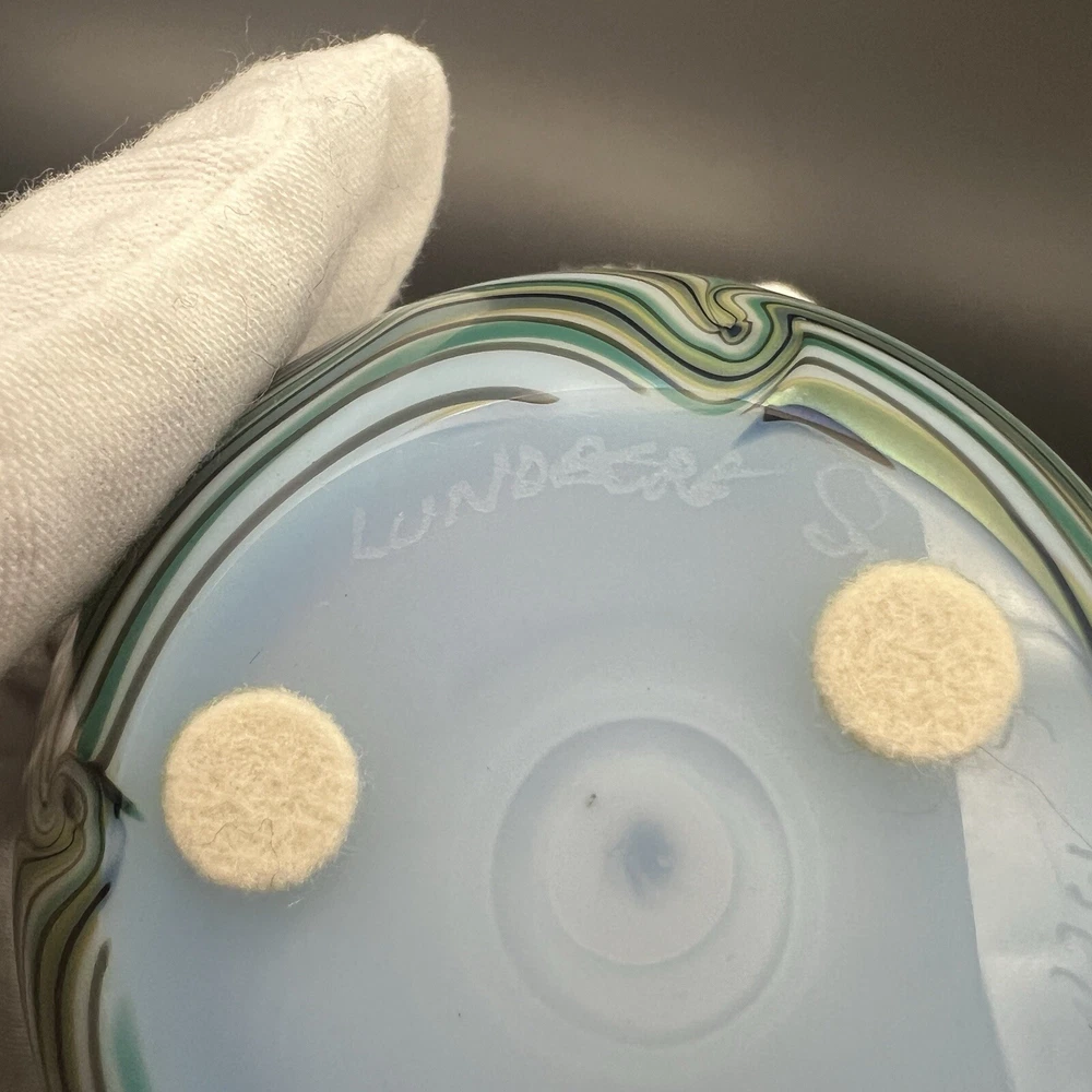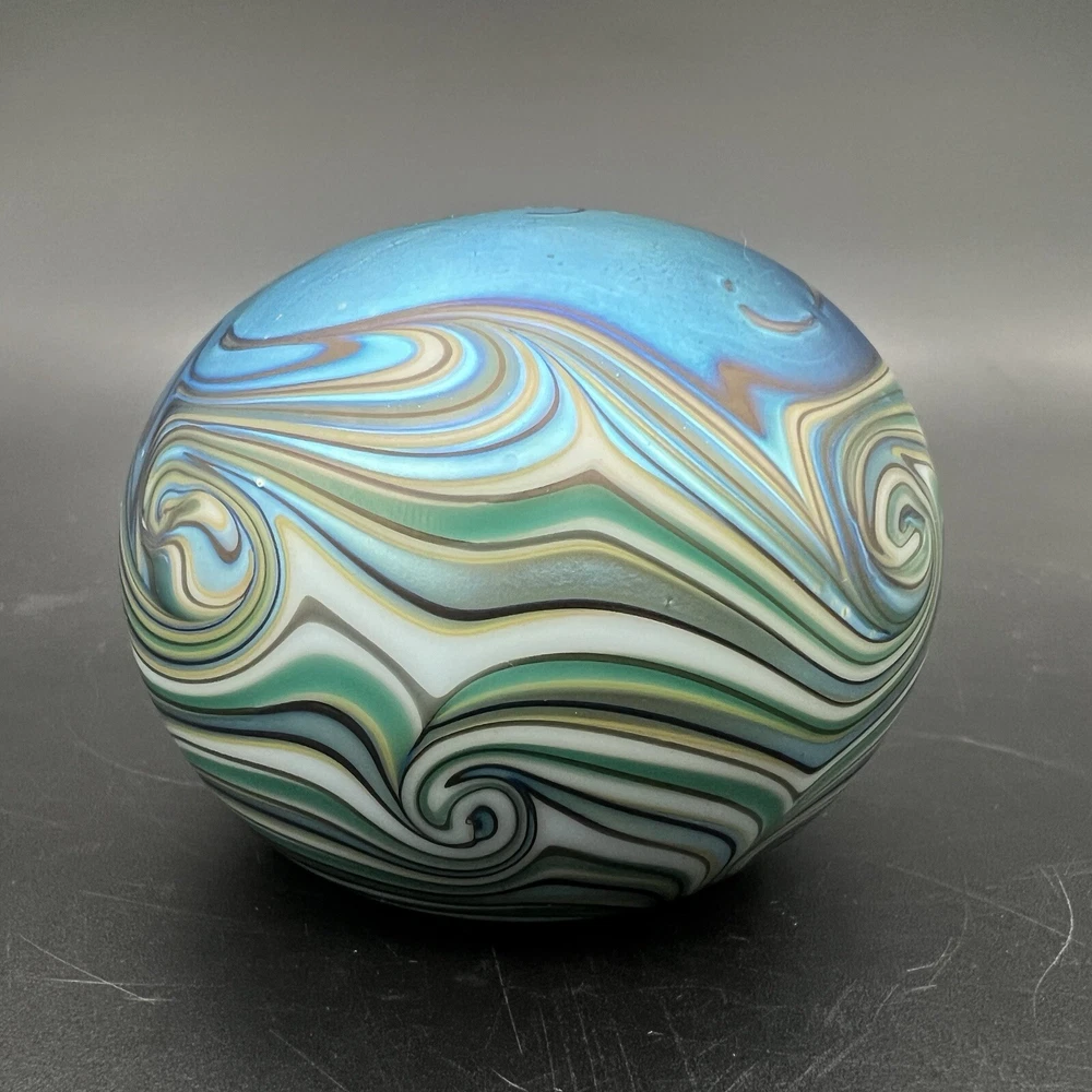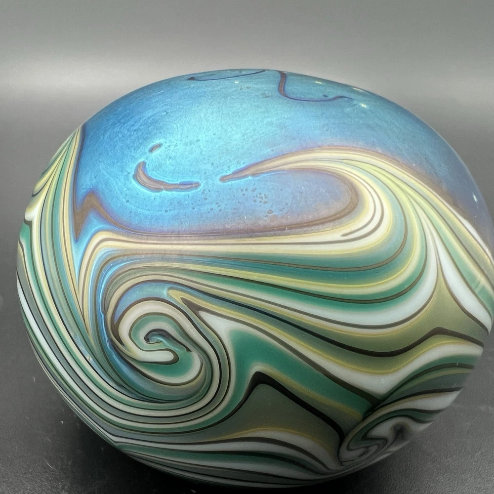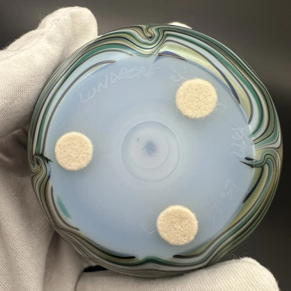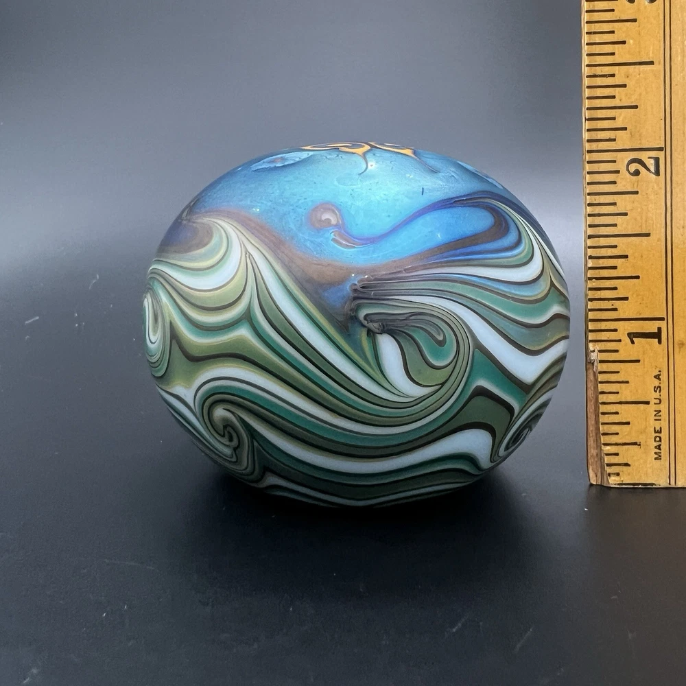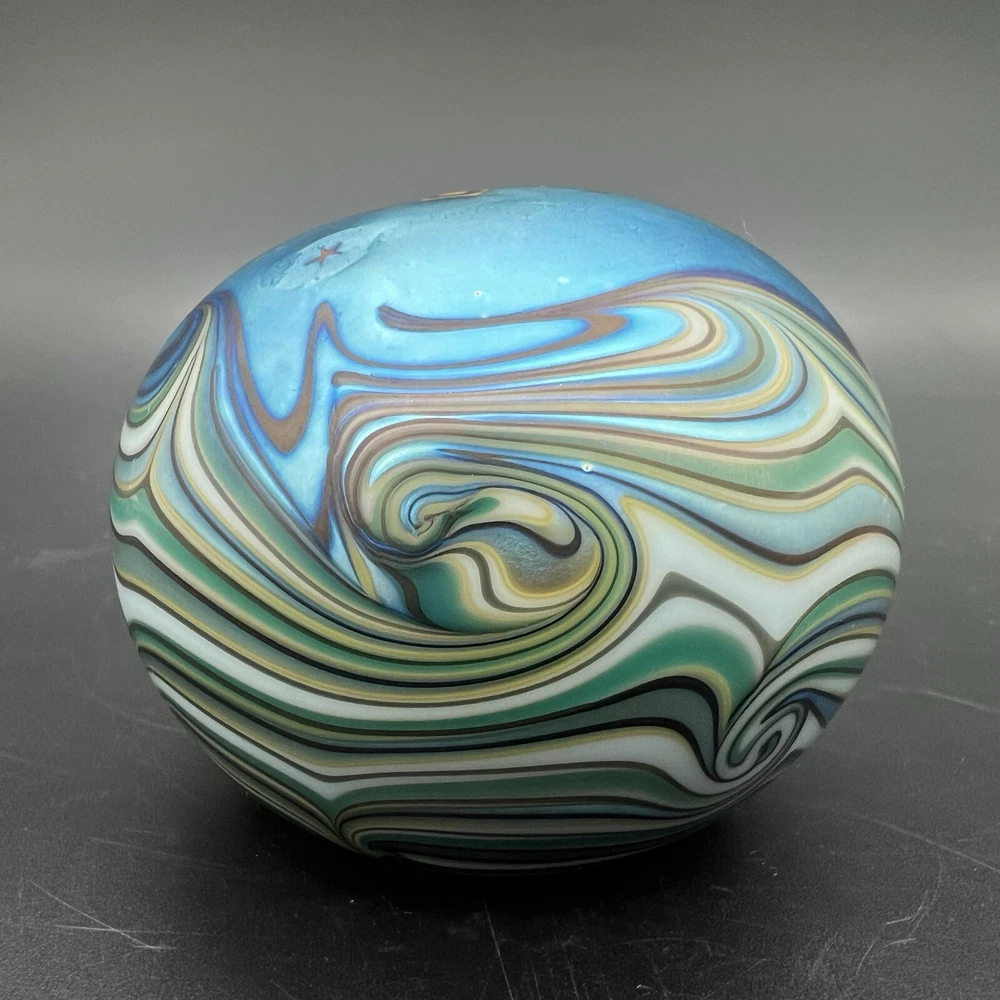 Signed Lundberg Studios art glass paperweight features an orange and purple butterfly with red stars above a swirling green and cream colored sea. 3”x2.25”