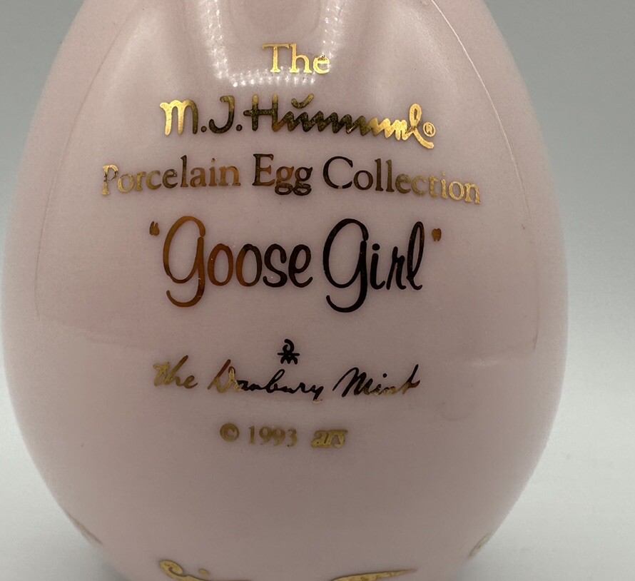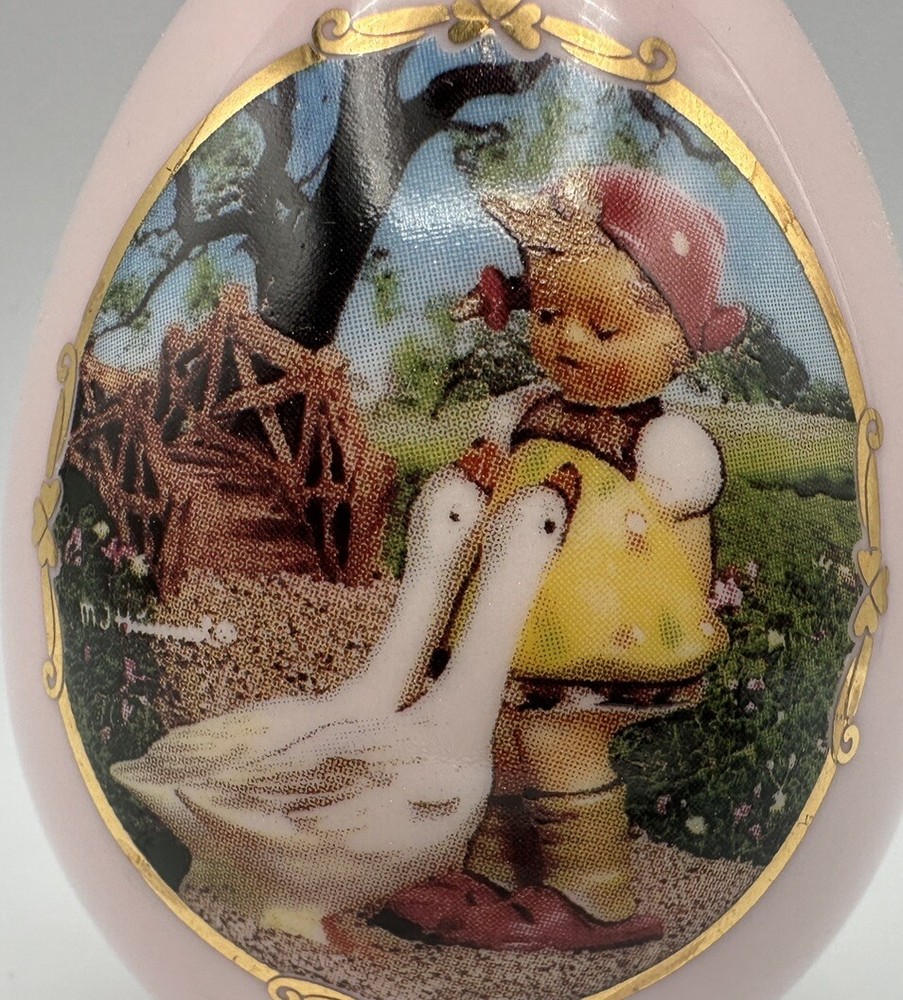 This beautiful porcelain egg from the M J Hummel collection features the beloved character Goose Girl in full color. Crafted in 1993, this collector's item is a must-have for any fan of traditional figurines and sculptures. The glossy finish on the egg adds an elegant touch, making it a perfect addition to any room in the house. The egg is medium-sized and comes unboxed, but is in excellent original condition. It was manufactured in Japan and features a bordered pattern that adds to its overall charm. Whether for personal enjoyment or as a gift for a loved one, this Hummel collector egg will bring joy and charm to any collection.