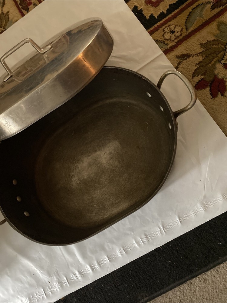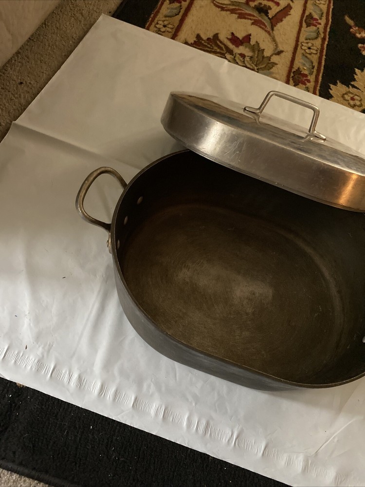 Country/Region of Manufacture:United StatesItem Width:10"Item Height:7.75" with lid in placeItem Weight:7.6 poundsFeatures:Double Handle, Easy to Clean, Flat-BottomedSet Includes:Lid, Pot, TrivetType of Oven:Electric, GasTime Period Manufactured:1900-1999Stove Type Compatibility:Electric, GasSurface Coating:AnodizedType:Dutch OvenItem Length:13"Original/Licensed Reproduction:OriginalVintage:YesColor:BlackNumber of Items in Set:Three-PieceBrand:MagnaliteShape:OvalItem Depth:4.75" pan height without lidMaterial:Aluminum