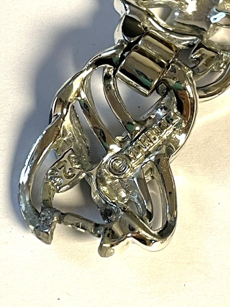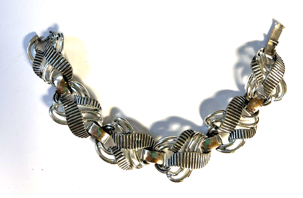 This stunning vintage bracelet is a true treasure! The chunky silver-tone design gives it a bold, retro charm that instantly elevates any outfit. The craftsmanship is exceptional—you can feel the quality in its weight and the secure snap closure. Signed by Marboux, it’s a rare find with timeless appeal, perfect for gifting or treating yourself. The 1940s flair makes it a conversation starter, blending elegance with a touch of nostalgia. Whether dressed up or down, it adds a unique statement to your look. Love how versatile and eye-catching it is!
