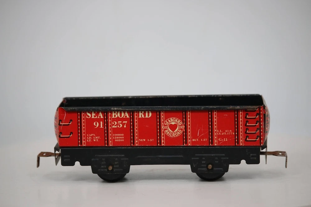 Vintage MArx O scale sea board 19257 metal train car SKU#008145 Look closely at the pictures to see further details. PLEASE see photos for detailed condition!! PLEASE LOOK AT THE PHOTOS CAREFULLY BEFORE PURCHASING!! If you are purchasing more than one item from us and would like combined shipping, PLEASE request an adjusted invoice from us while still in the cart and BEFORE paying. eBay does not usually calculate combined shipping accurately and you might get overcharged. Please be aware that when we photograph items, we use lighting that will show the details well. Although we try to present the product as accurately as possible, the lighting may affect the overall look of the item by appearing lighter/darker or possibly a different hue than the actual item. Depending on the type of lighting you have in your home, there may be some differences between the photos and the actual item. If this is a concern of yours, please feel free to request additional photos made in natural lighting or ask for a more detailed description of the item PRIOR TO PURCHASE! There may be pieces that are missing or broken including, but not limited to, couplers, brake wheels, steps, ladders, railings, etc. May need detailed cleaning. PLEASE NOTE: We greatly appreciate your interest in our item for sale. We look forward to a pleasant, quick and satisfying transaction for everybody, so please note the following information before bidding. Thank you! ITEM DESCRIPTIONS: * We will try to describe items well and provide plenty of photos. Please review these carefully before bidding or purchasing. * Only the items pictured and described are what you will receive when purchased. * We will occasionally offer an item clearly marked "AS-IS". This means that we are not sure if it works because we are unable to test it for whatever reason. We will offer these at a discounted price then a similar "working" item. It is possible that these items will work fine, but it also is possible that these items are more useful for their parts. Please only bid on or purchase these items if you are well aware of this, as we will only provide refunds of actual item price (no shipping cost refunds) for these items. * If you have any questions that aren't addressed by the descriptions or photos, please feel free to ask before you bid. SHIPPING: * We offer international shipping, please feel free to contact us if you have any questions. * We try to pack items as carefully as possible, but damage may occur during shipping. If you receive an item that was damaged in shipping, please contact us and we will work with you to resolve the problem. * We will combine shipping costs for all items the same buyer purchases from us within 2 days. Please wait to pay for items until you're done shopping with us. Please contact us if you're expecting to buy more items from us, or to have us adjust the shipping costs. * We will usually ship items out within 24 hours of payment being received Sunday through Friday at noon. We will notify the buyer if there will be a delay in shipping for some reason. Please allow additional time for holidays and weekends when the post office is closed. If payment is received after noon (EST) on Friday, the item might not be shipped until the following Monday Or Later If Monday Is Holiday. * We do try to recycle shipping materials as much as possible. RETURNS: We abide by eBay's Money Back Guarantee. We definitely want our customers to be happy with their purchase! You may return an item within 30 days of receiving it with the following guidelines: * If the item is defective or damaged (unless we clearly marked the listing "AS-IS"), the buyer will receive a full refund after the buyer returns it and it is received by us. Customers who falsely claim their item is defective, damaged, or not as described in order to receive a full refund and free return shipping will be permanently blocked from making future purchases from us. * If the item is as described (including "AS-IS" items) and the buyer decides for any other reason than defective/damaged to return it, only the actual price of the item will be refunded once it has been returned and it is received by us. The buyer will be asked to pay all original and return shipping charges. This includes all reasons other than defective/damaged, including wrong size, wrong type, changed mind, etc. All "AS-IS" items will fall into this category of return. Please make sure the item is what you want before purchasing it. * Please contact us before initiating a refund request, issues, questions or concerns. We will do our best to get back to you as quickly as we can. Thank you and if you read this far... you are awesome and we hope you have a great day!! FEEDBACK: We always leave feedback at the end of transaction. We consider the transaction to be over when we receive feedback from the buyer confirming the item arrived satisfactorily. If you are unsatisfied with your purchase please contact us before leaving neutral or negative feedback. WE APPRECIATE POSITIVE FEEDBACK IF YOU ARE SATISFIED WITH YOUR PURCHASE! THANK YOU FOR YOUR INTEREST IN THIS ITEM!