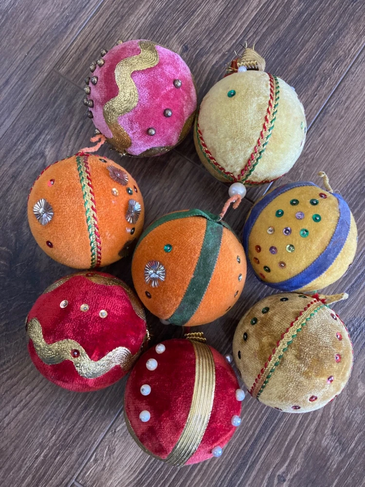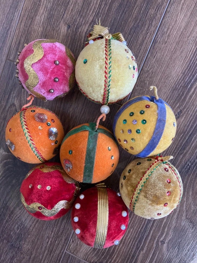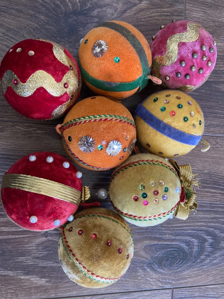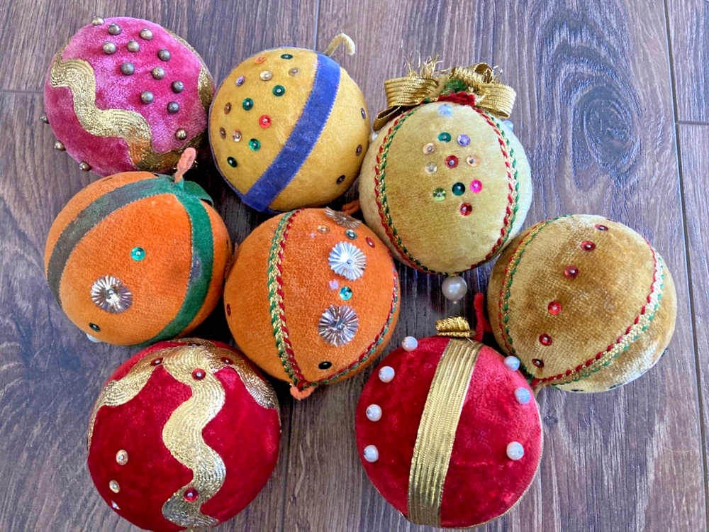 HOOKED-ON-VINTAGE IS SO PLEASED TO OFFER THESE REAL VINTAGE MCM MID-CENTURY MODERN CHRISTMAS ORNAMENTS BALLS. BOTH ARE VERY COLLECTIBLE. VTG LOT 8 CHRISTMAS TREE ORNAMENT BEADED PUSH PIN SEQUIN VELVET 2-7/8” DIAM MERRY CHRISTMAS Y’ALL! SUPER FUN LOT OF VINTAGE CHRISTMAS ORNAMENTS. We have many, many of his Christmas ornaments to list, so please check back with us. Thank you so much for stopping by Hooked-On-Vintage. We appreciate it!