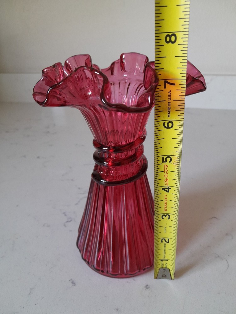This is a vintage Mid-Century Modern Fenton art glass vase in cranberry red with a ruffled edge. The vase measures 7 1/4 inches in height and features a wheat pattern. It is made of glass in a studio crafted production style, typical of Fenton. This piece would be a stunning addition to any glassware collection, especially for those with a love for vintage art glass.