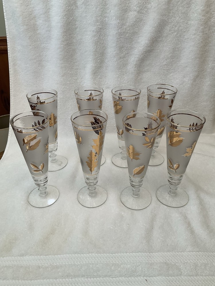 Add a touch of vintage charm to your home bar with this set of eight Libbey Pilsner glasses. The glasses feature a beautiful gold leaf pattern that adds a touch of elegance to any occasion. These glasses are perfect for all occasions, whether you are hosting a dinner party or enjoying a quiet night in. Crafted from high-quality glass, these glasses are stylish and durable. The glasses are decorated with a frosted finish that enhances their beauty. These glasses are perfect for beer enthusiasts who want to enjoy their favorite brew in style.