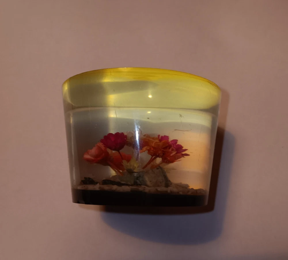It's in good condition but has some wear on it. There is 1 small scratch on the top, and there are a couple of scratches on the side. It's made out of acrylic. It's 2.5 inches tall. I will pack it with care and will include tracking.