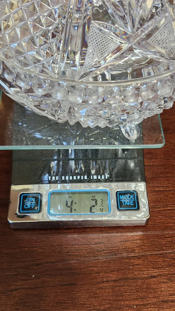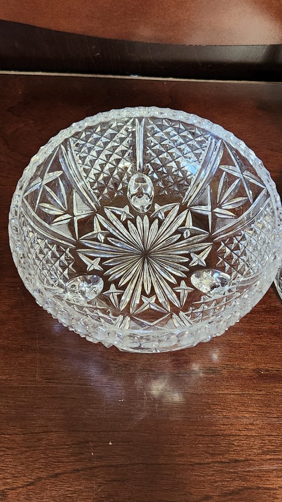 This vintage MCM round cut lead crystal candy dish is a stunning piece that will add a touch of elegance to any home decor. The dish has three feet and a lid, making it perfect for displaying candy or other small treats. The clear crystal material and cut glass production style showcase a beautiful design that is true to the mid-century modern style. The dish is an original piece from the 1960s and is in excellent condition. It has one compartment and is 10 inches in height and 7 inches in width, weighing 4lbs. This unmarked antique dish is a must-have for collectors and those who appreciate unique and timeless pieces.