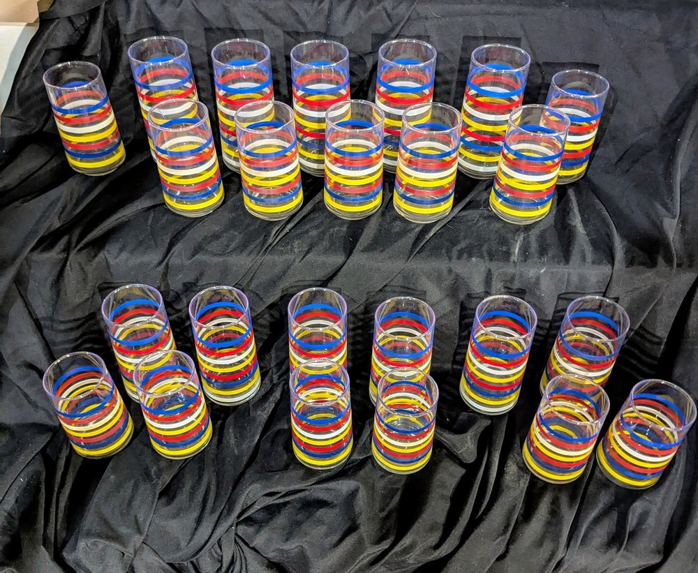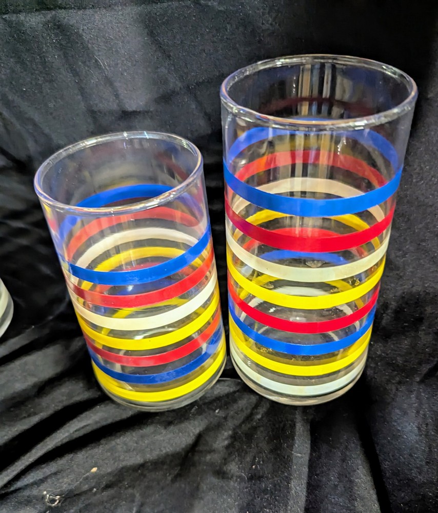 This set of 8 Libbey striped tumbler glasses is perfect for any occasion. The mid-century modern design adds a touch of vintage charm to your drinkware collection. Made in the United States, these glasses are crafted from high-quality glass material and feature a decorative striped pattern. The set includes 4 large and 4 small glasses, each measuring 4.75 inches in height. These glasses are ideal for serving water, iced tea, or other beverages. They are also great for display and can be used as decorative pieces in your home or office. Add this set of Libbey striped tumbler glasses to your collection today!