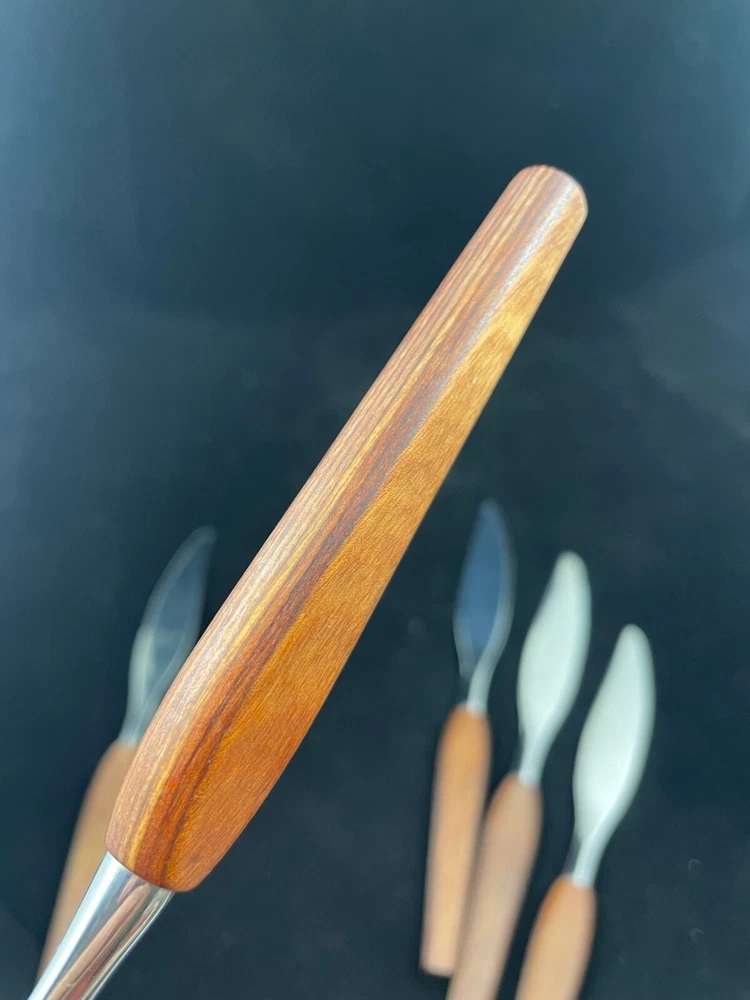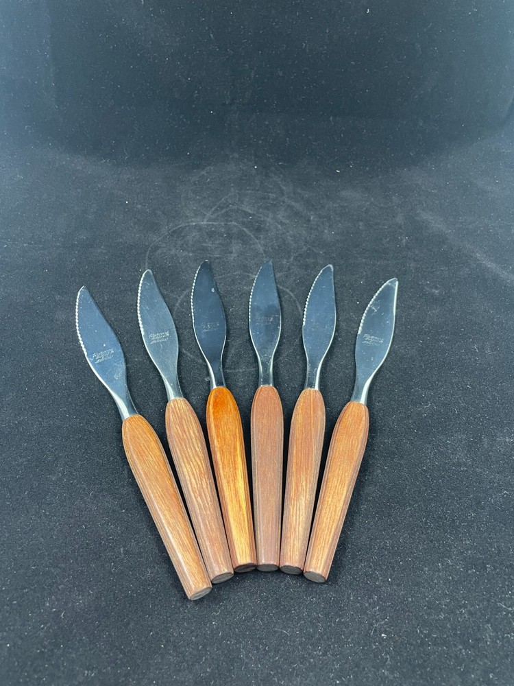 Vintage MCM Fleetwood Designer Teak Handle Stainless Steel Steak Knives Set of 6 Add a touch of vintage MCM charm to your dining experience with this set of 6 Fleetwood designer teak handle steak knives. Crafted from high-quality stainless steel. For inventory - Montana 11:11 Box
