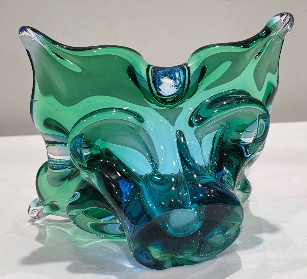 VINTAGE MCM TEAL BLUE / GREEN FREEFORM ART GLASS ASHTRAY / TRINKET BOWL UNSIGNED BUT BELIEVED TO BE CHALET LORRAINE MEASURES ABOUT 6.5" SQUARE x 3.75" HIGH VERY GOOD CONDITION WITH NO CHIPS, CRACKS OR REPAIRS