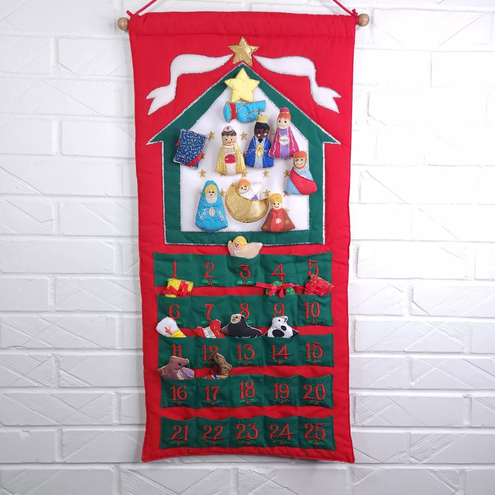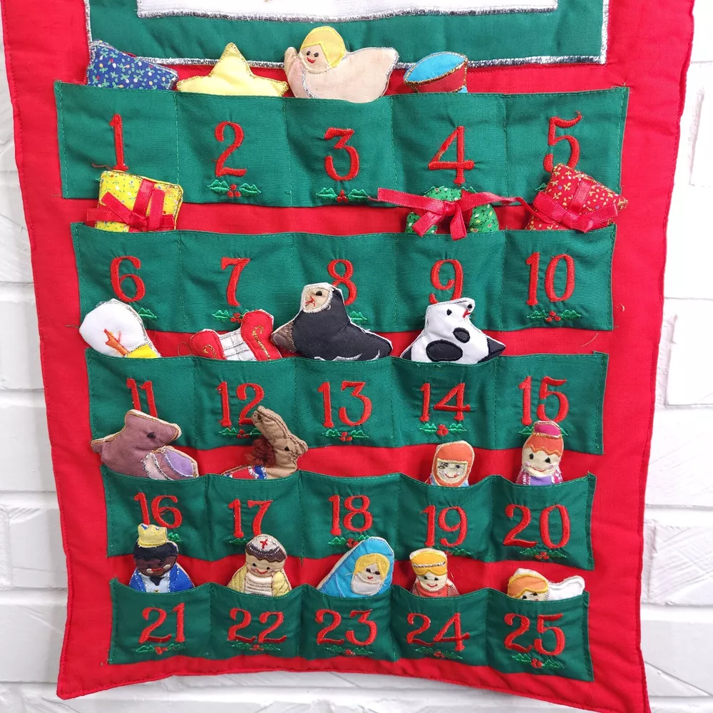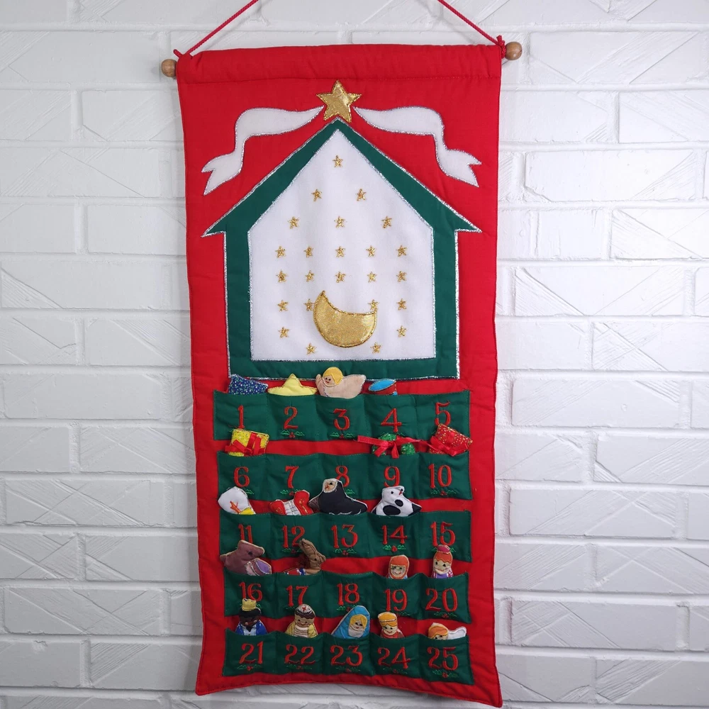 No holes or stains. Some loose threads (see photos). Missing 5 figures. White felt and hook-and-loop backing allows placing figures in a nativity scene. Measures approximately 29.5 inches by 14.5 inches.
