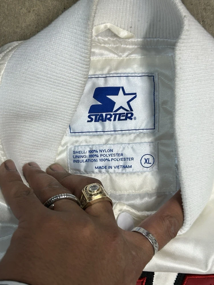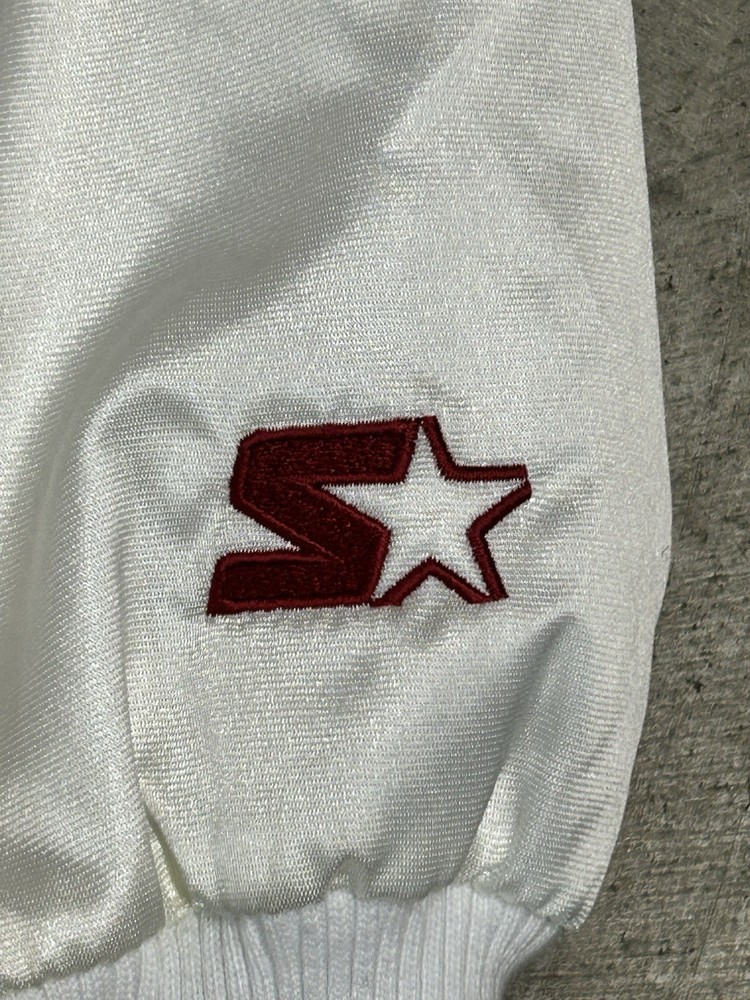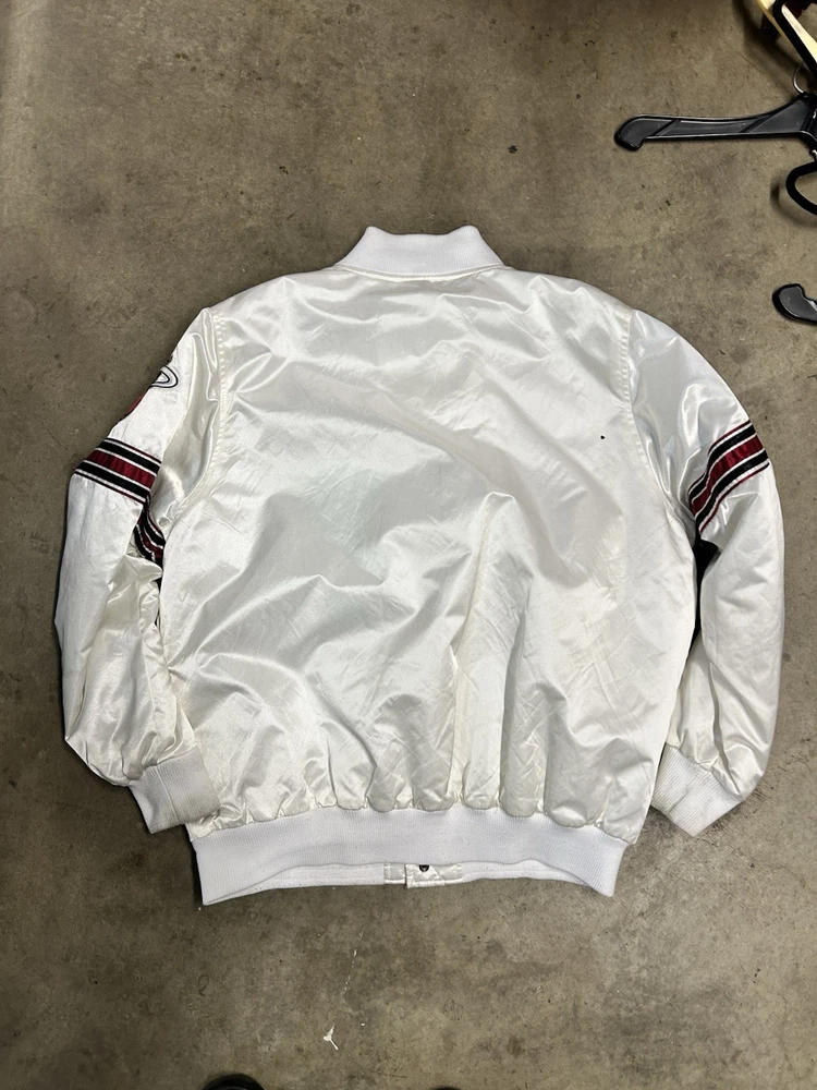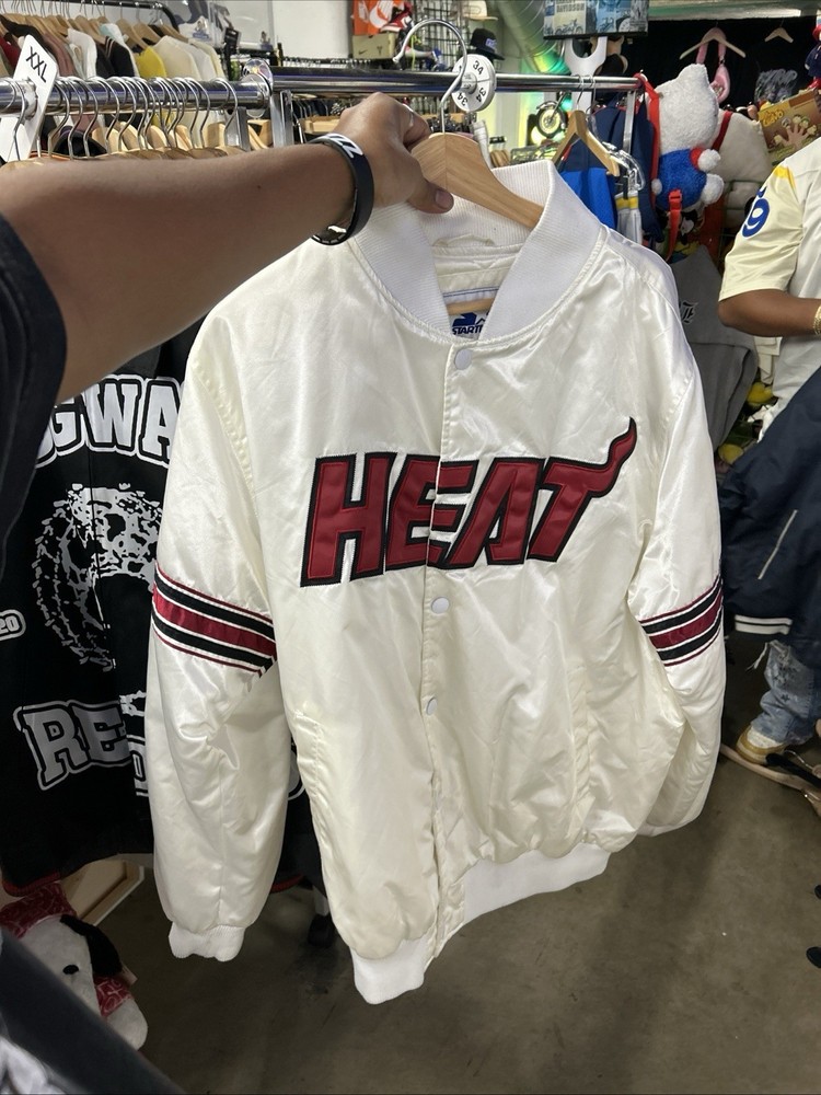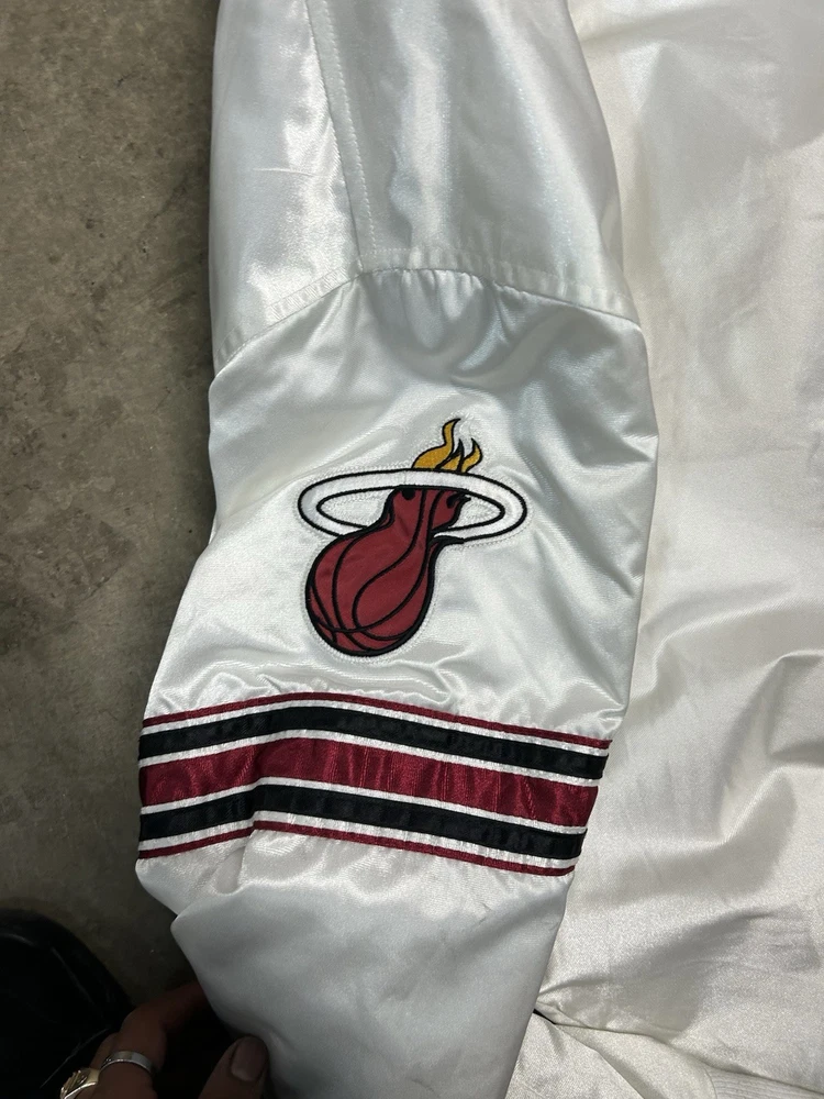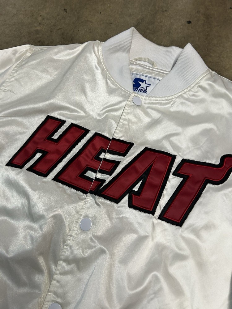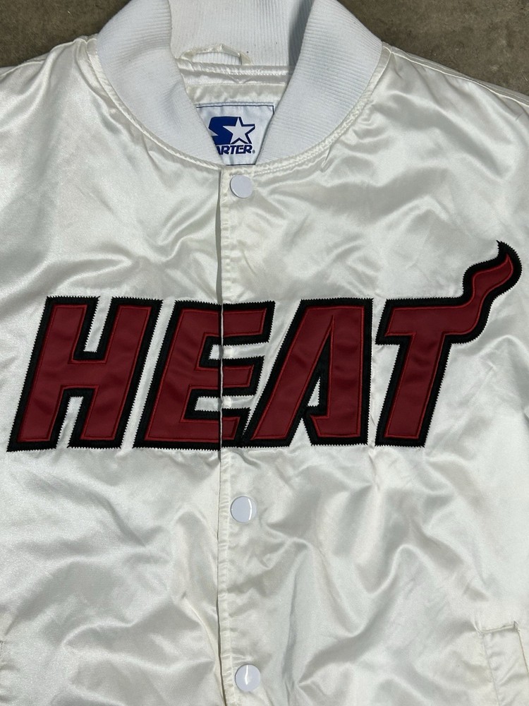 The Vintage MIAMI HEAT VARSITY JACKET by Starter in white, size XL, is a nostalgic piece perfect for basketball fans and collectors. This officially licensed jacket features the iconic Miami Heat team logo and is dedicated to legendary player Alonzo Mourning. Made of satin material, this jacket is a must-have for any fan looking to show support for the NBA team in style. Ideal for men who appreciate vintage sports apparel, this jacket is a unique and classic addition to any wardrobe.