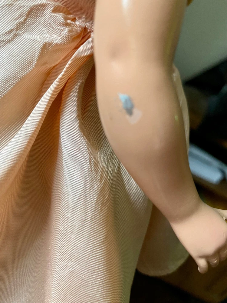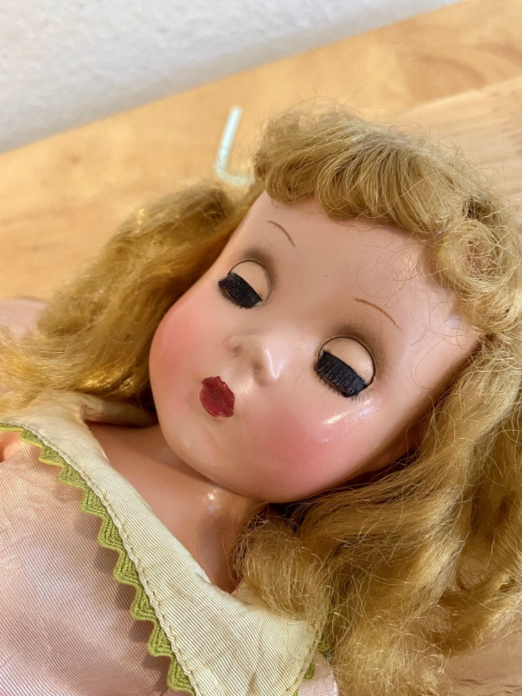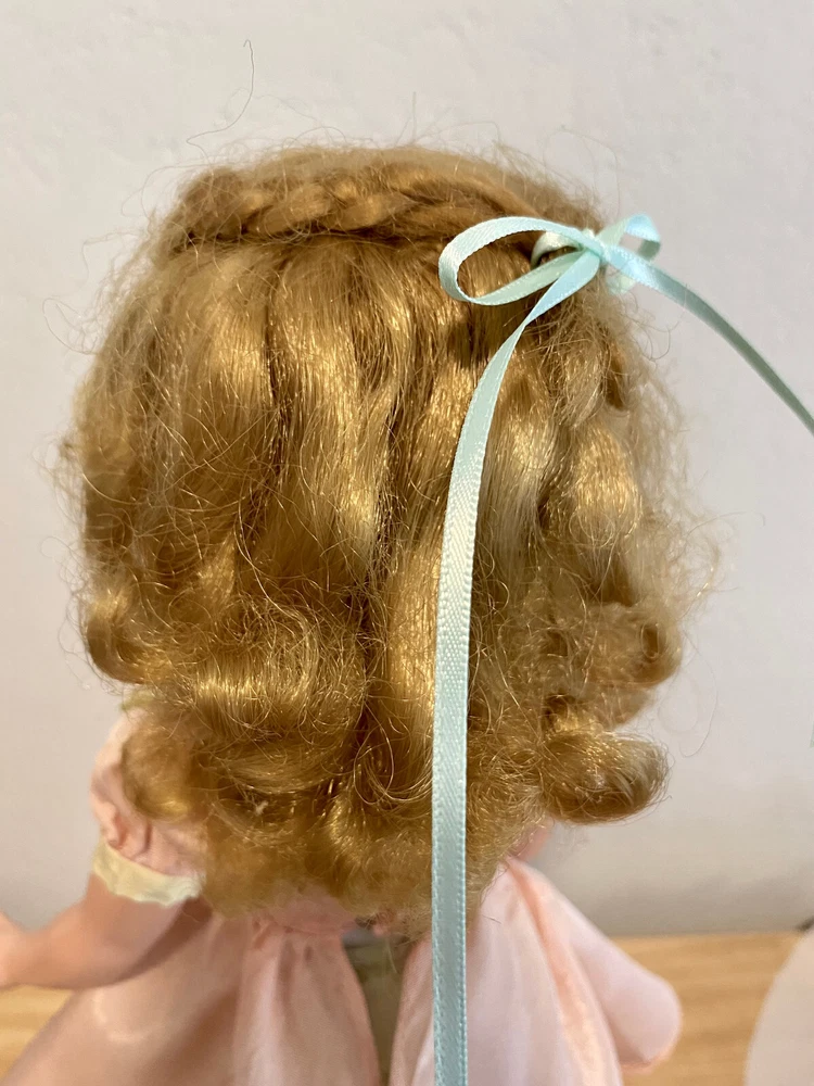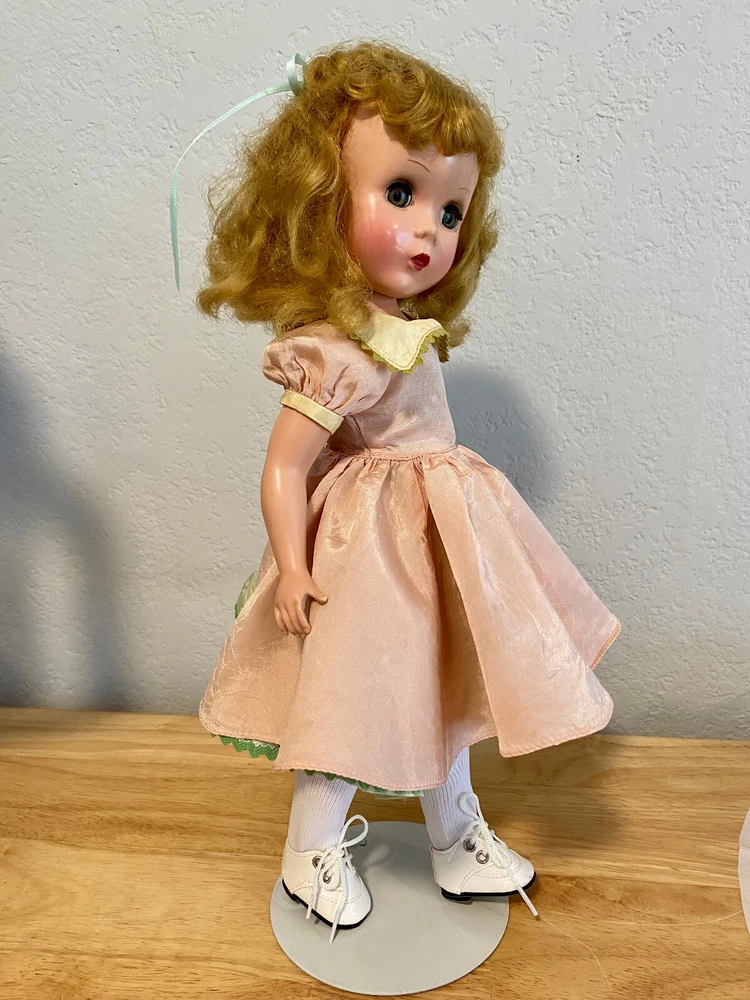 This Madame Alexander Maggie doll is absolutely stunning! Her vintage charm shines through—pristine saran wig, vivid face paint, and that iconic Maggie expression. The powder pink taffeta dress with lime green underskirt is gorgeous, and she’s been lovingly restrung for poseability. Minor scrapes don’t detract from her beauty. A flawless collector’s piece with new shoes, socks, and panties—sleepy glass eyes and delicate lashes complete her dreamy look. A true treasure!