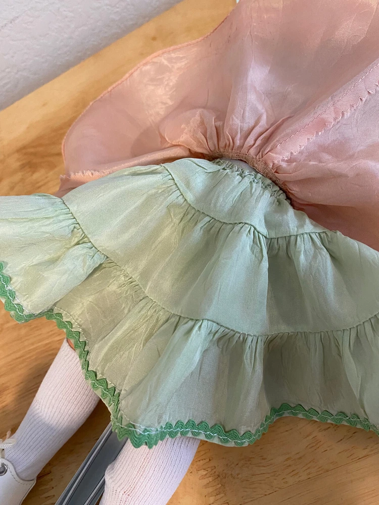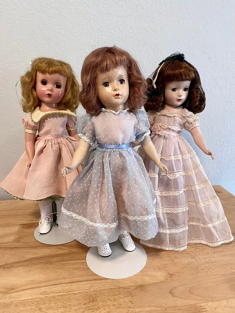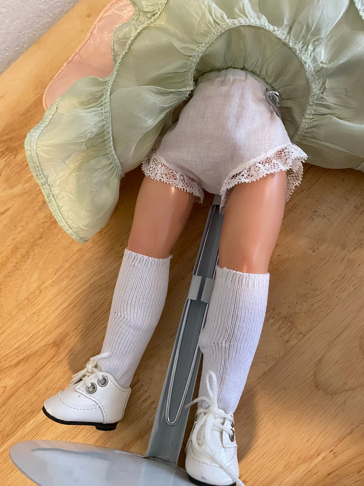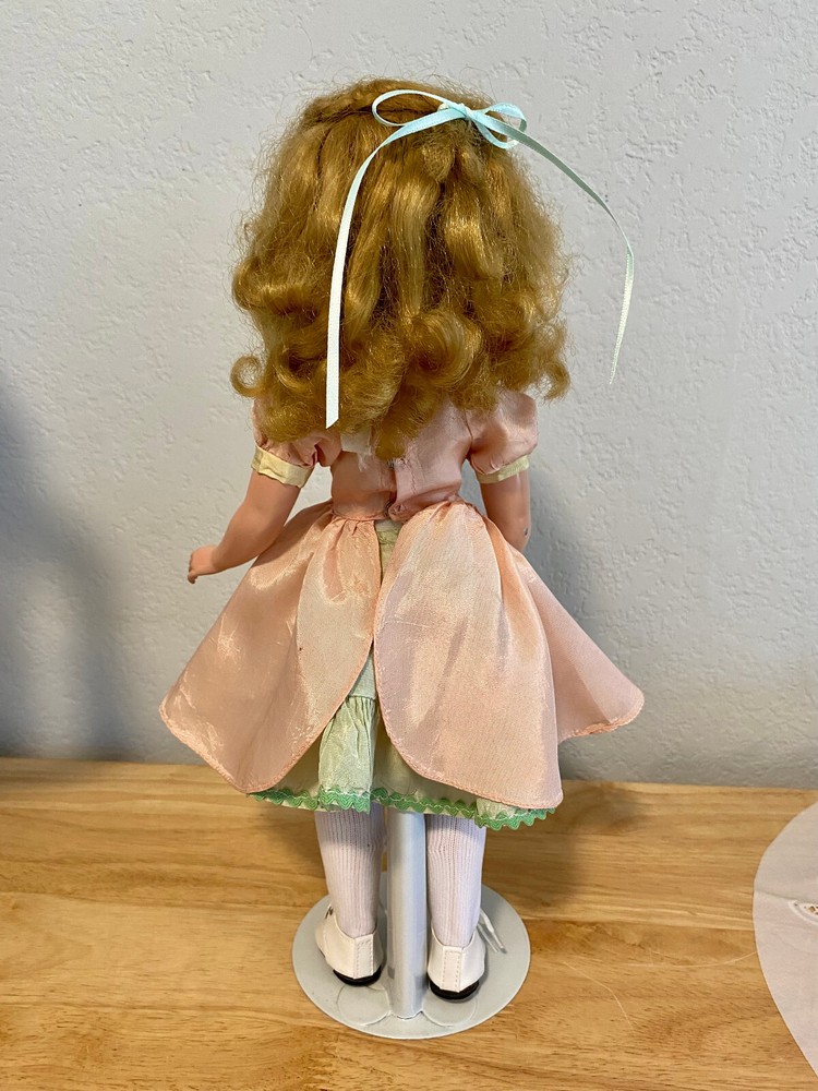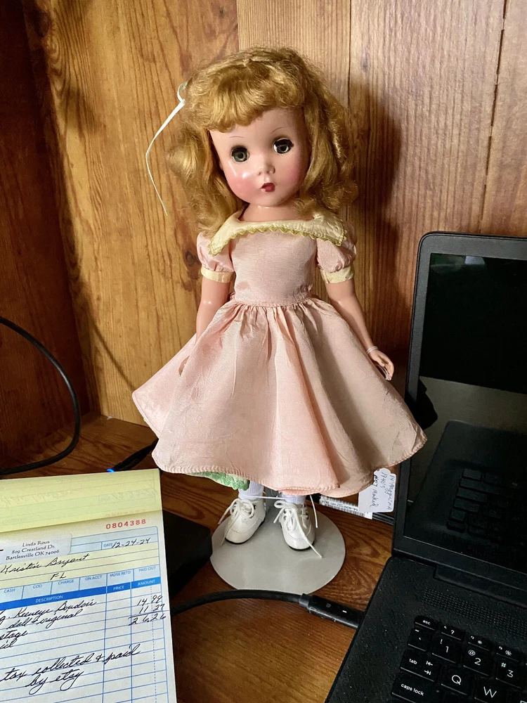 This Madame Alexander Maggie doll is absolutely stunning! Her vintage charm shines through—pristine saran wig, vivid face paint, and that iconic Maggie expression. The powder pink taffeta dress with lime green underskirt is gorgeous, and she’s been lovingly restrung for poseability. Minor scrapes don’t detract from her beauty. A flawless collector’s piece with new shoes, socks, and panties—sleepy glass eyes and delicate lashes complete her dreamy look. A true treasure!