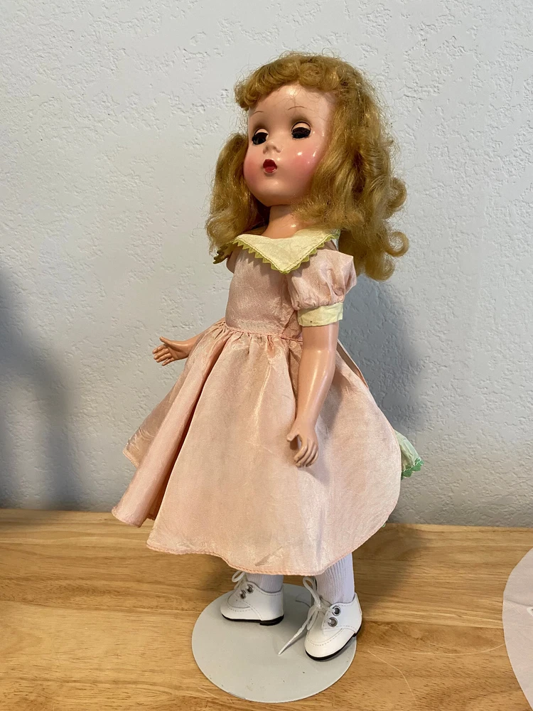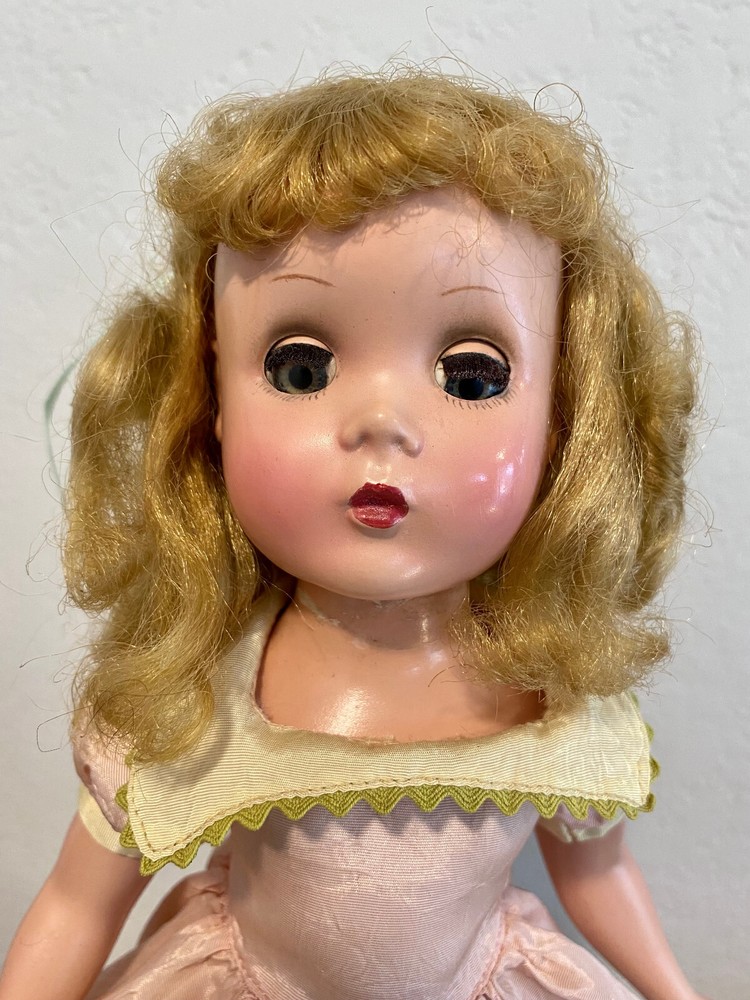 14" tall in great condition Doll is clean; no odors Body in great condition; the only scrapes are at the top of the neck. *NOTE: Scrape on right elbow The wig is original saran in fantastic condition. Hair in original style Her dress is tagged Dress is powder pink taffeta with lime green under skirt. Doll is not marked but you cannot mistake the Maggie face Hard plastic She has been restrung Shoes, socks and panties are new She has sleepy glass eyes Eye lashes are in tact; all fingers accounted for *Face paint is vivid She is an adorable doll Look close; ask questions More vintage dolls in my shop Thank you