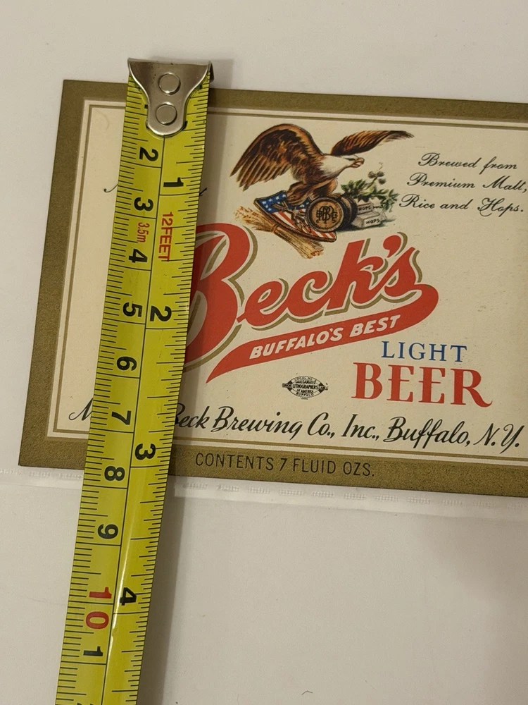 Own a genuine piece of Buffalo brewing history! This listing is for one (1) original vintage beer label from the legendary Magnus Beck Brewing Co. of Buffalo, New York. This is a "New Old Stock" (NOS) label that was never used or attached to a bottle. It is in remarkable condition with vibrant reds and golds, featuring the classic American Eagle crest. ⭐️Why this label is special⭐️ The "Shorty" Size: Most Magnus Beck labels found today are for 12oz bottles. This is the rarer 7 Fluid Oz. size, used for "pony" or "shorty" bottles. The History: Magnus Beck was a cornerstone of Buffalo's "Queen City" brewing scene from 1855 until 1956. This label dates to the post-Prohibition era (Internal Revenue Tax Paid). ⭐️Condition Report⭐️ Excellent. No fading, creases, or adhesive residue.