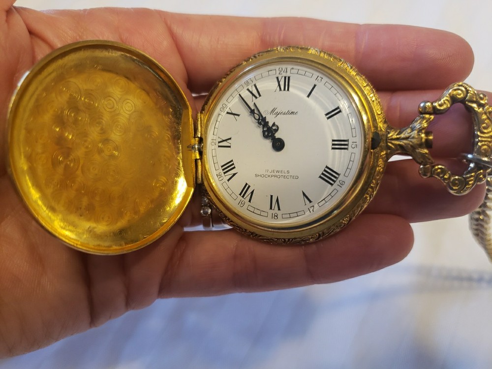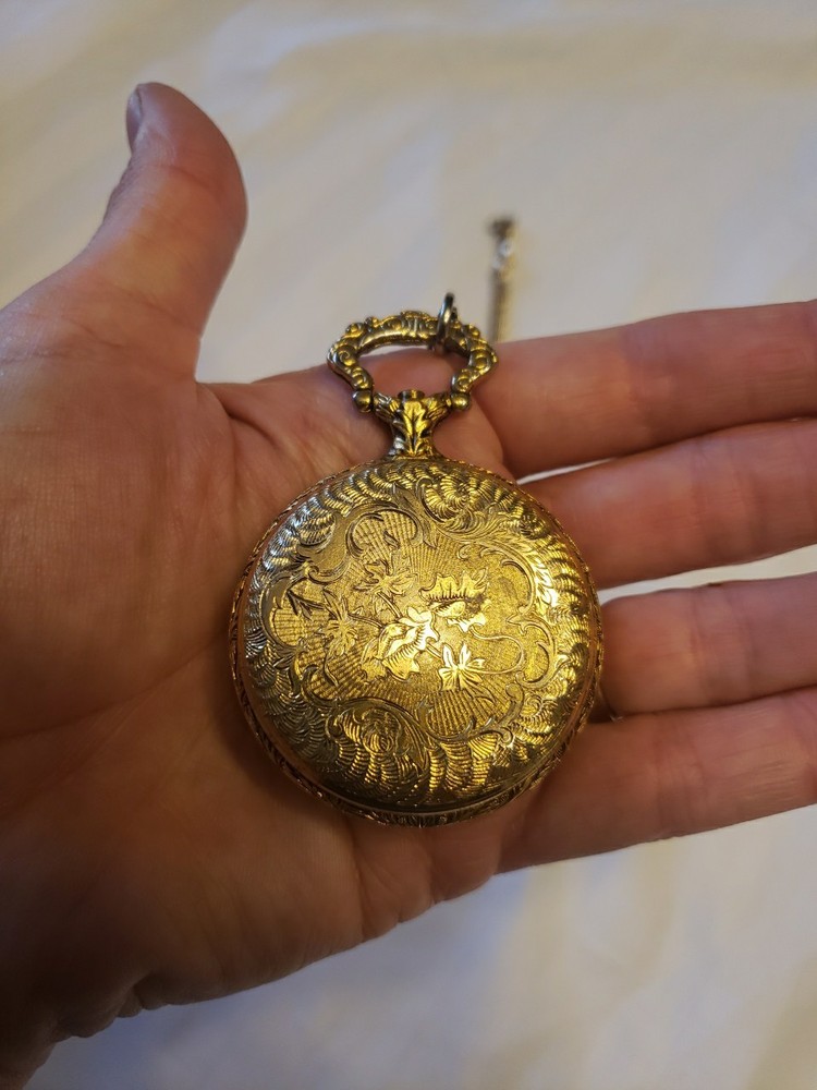 Missing the wind up knob-makes it difficultto open to see clock face. Has gold tone. See pictures. What you see is what you get .please message me if you have any questions. Thank you and God bless. Bin#20