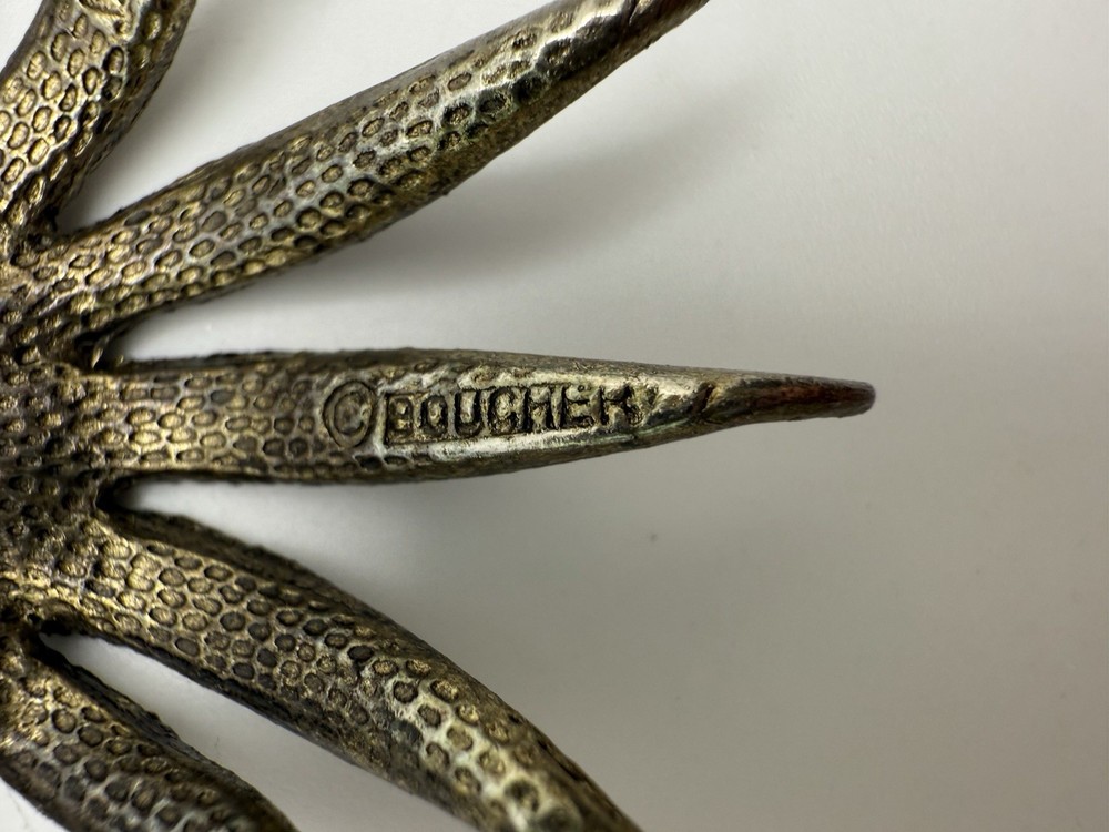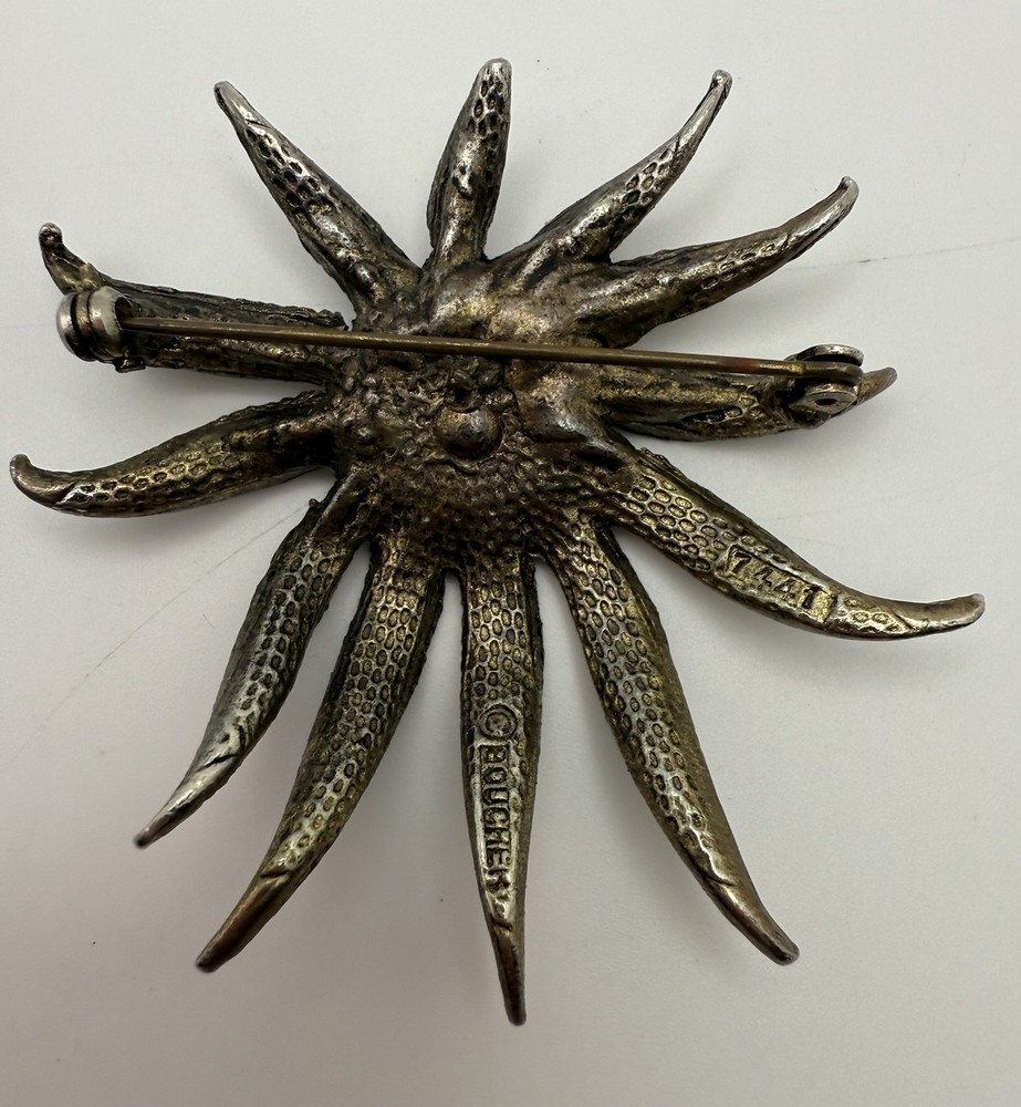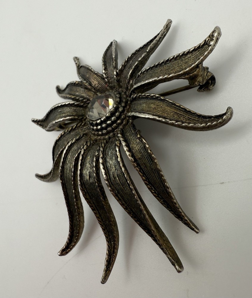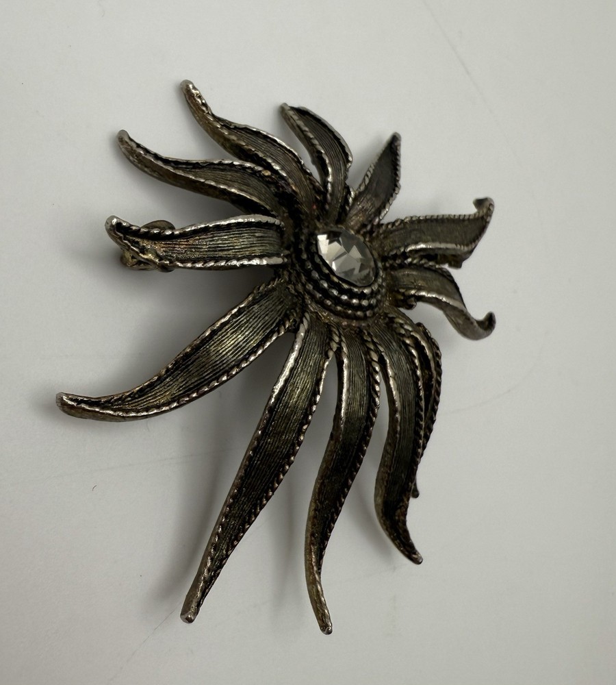 ✨ Vintage Marcel Boucher Starburst Pin | 1950s Textured Metal Brooch | Signed + #7441 A dramatic and iconic piece from renowned designer Marcel Boucher, this striking mid-century starburst pin captures the bold elegance of 1950s costume jewelry. 🔸 Details: • Designer: Marcel Boucher • Era: 1950s • Signature: Stamped Boucher with design number #7441 • Design: Radiating starburst / sunburst motif with deeply textured metal finish • Size: Approx. 2.25” diameter • Metal: Gold-tone metal (textured + polished contrast) • Closure: Secure rollover clasp • Condition: Excellent vintage condition — no missing parts, working clasp, minimal wear. This brooch is a collector’s dream — dramatic yet refined, and unmistakably Boucher. Adds instant vintage glamour to any jacket, blouse, or hat. 💫 A statement piece from a master of American costume design. ✨💖✨ Offers Encouraged 💌