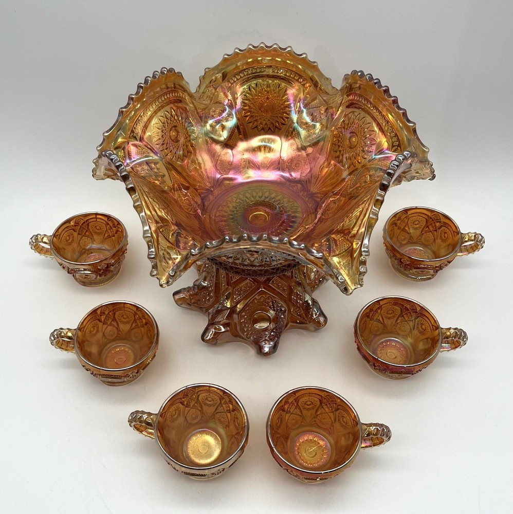This vintage glassware set is a stunning addition to any collection. The marigold carnival design is beautifully crafted on eight pieces, including a punch bowl, six cups, and a base bowl. The set is perfect for all occasions and is sure to impress your guests. The glass material is durable and the set is designed to last for years. The round shape of the bowl and cups make them easy to hold and serve. The set is ideal for adults and is perfect for a service of six. Add this gorgeous marigold carnival glassware set to your home today. Please check all photos carefully before purchasing,photos are part of the description,what you see is what you get. 20