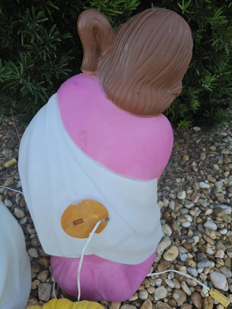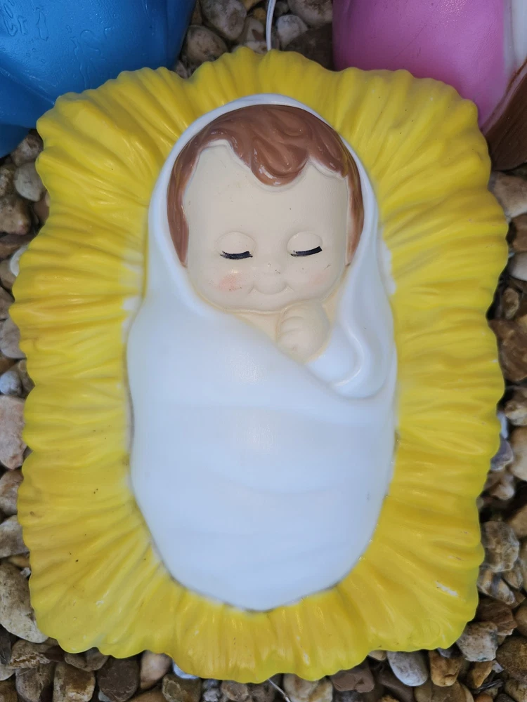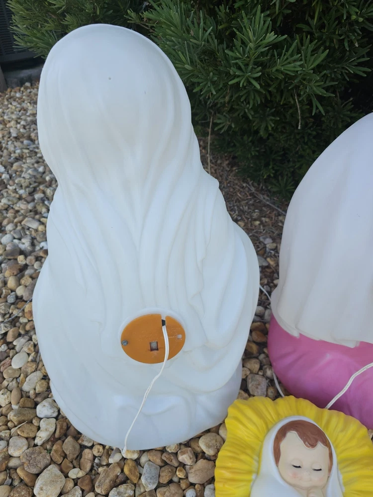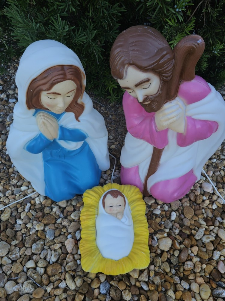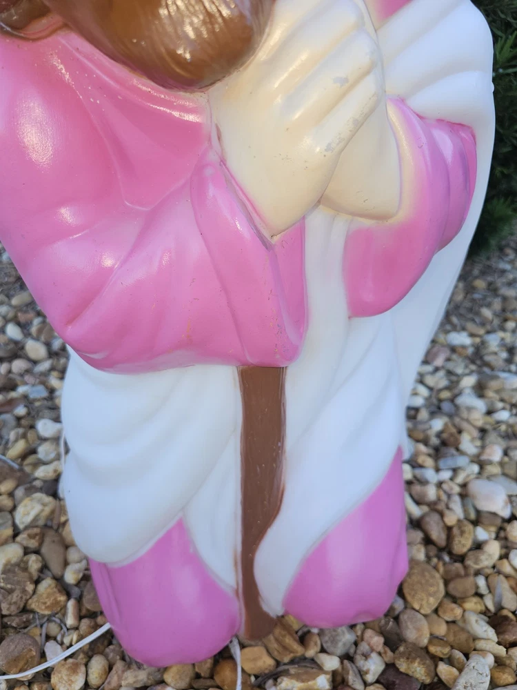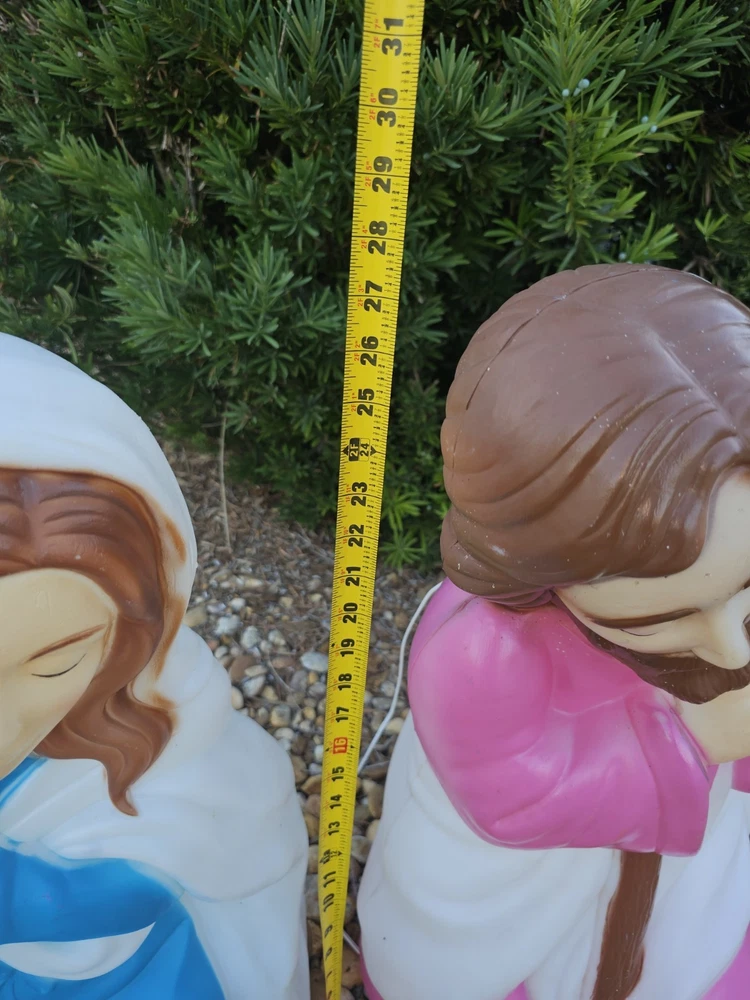 Celebrate the season with this classic vintage blow mold nativity set featuring Joseph, Mary, and Baby Jesus. Each figure stands approximately 27" tall and is full of charming, retro character. These are ideal for outdoor holiday displays and collectors of nostalgic Christmas décor. Condition Details: Joseph & Mary: Each stands about 27" tall. Both figures will need new wiring — Joseph's light no longer functions and Mary’s cord has been cut. Baby Jesus: Lights up beautifully as shown in the photos. Normal wear for age, including some paint loss (see photos for close-ups). No cracks or holes in the plastic. Overall solid condition. Features: Classic blow mold plastic Includes all 3 figures Perfect for outdoor or indoor holiday scenes Great vintage look from the mid to late 20th century