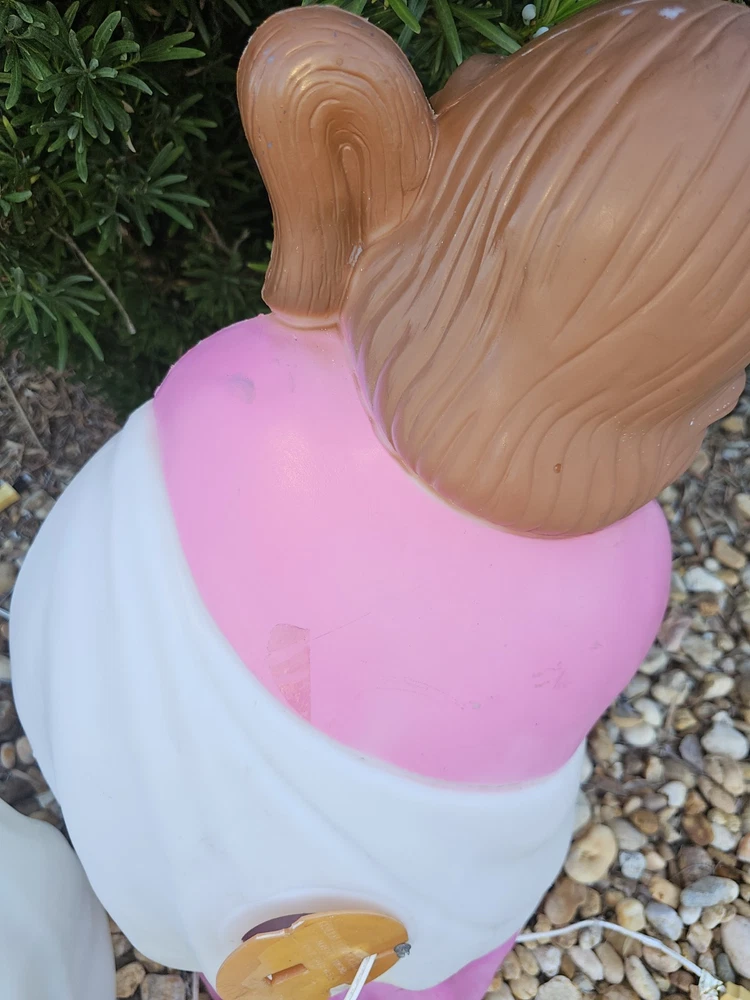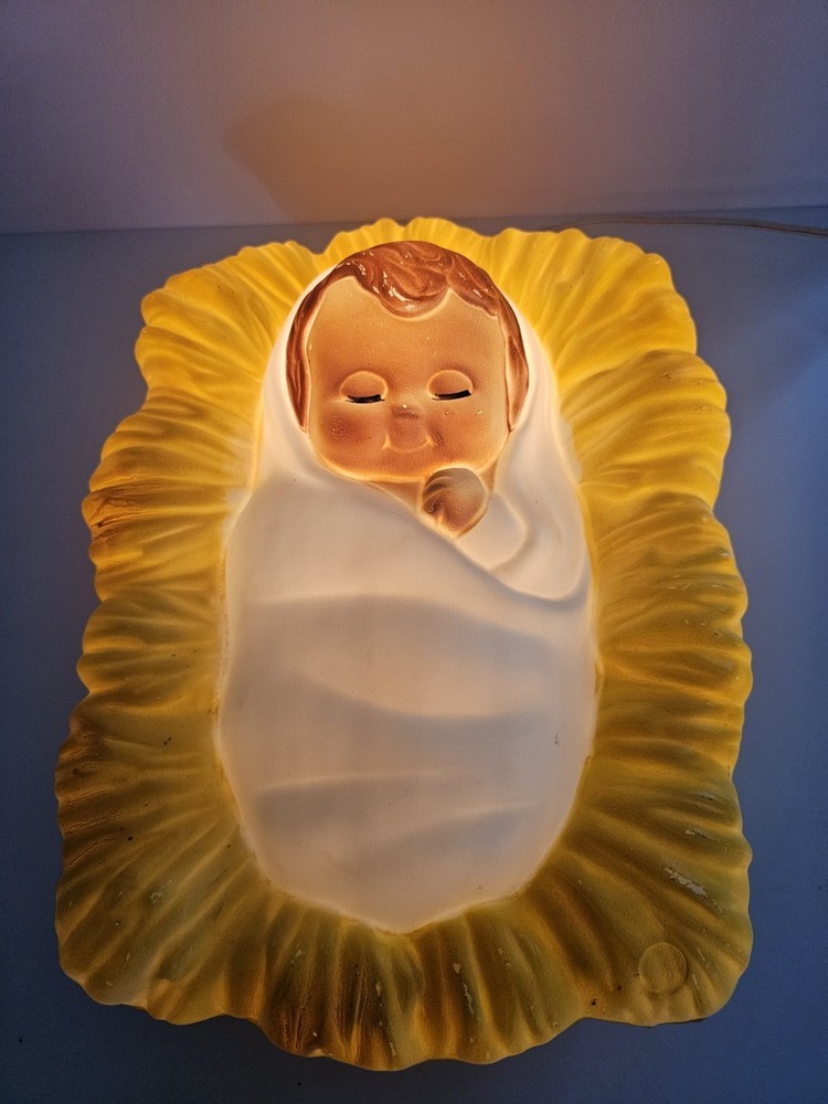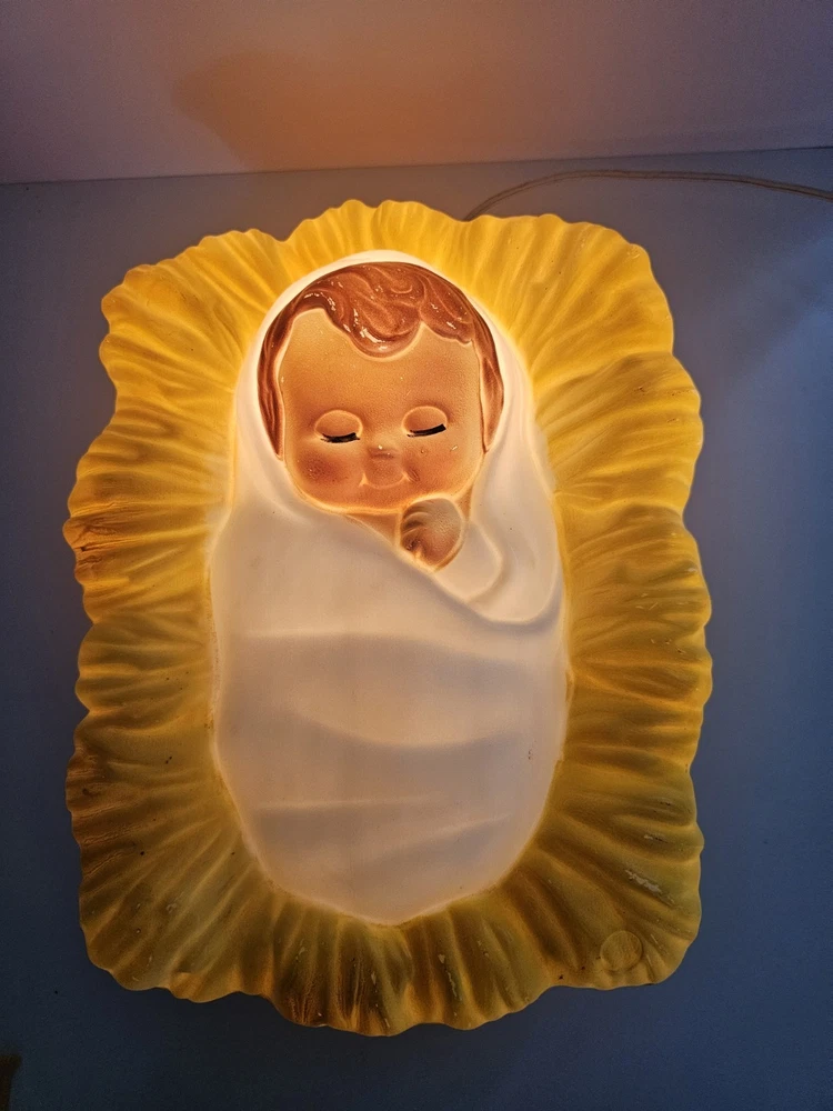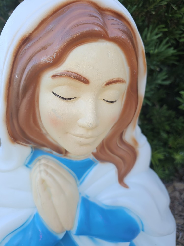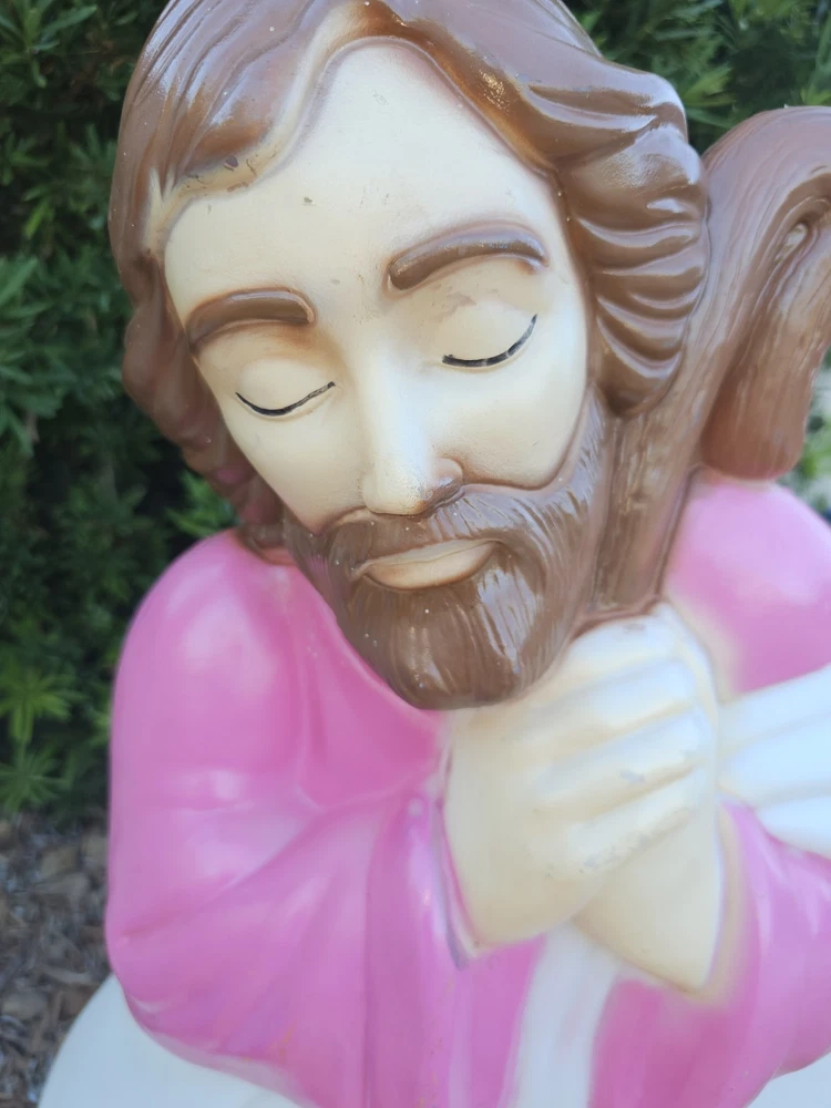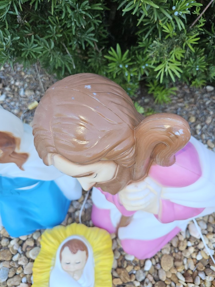 Celebrate the season with this classic vintage blow mold nativity set featuring Joseph, Mary, and Baby Jesus. Each figure stands approximately 27" tall and is full of charming, retro character. These are ideal for outdoor holiday displays and collectors of nostalgic Christmas décor. Condition Details: Joseph & Mary: Each stands about 27" tall. Both figures will need new wiring — Joseph's light no longer functions and Mary’s cord has been cut. Baby Jesus: Lights up beautifully as shown in the photos. Normal wear for age, including some paint loss (see photos for close-ups). No cracks or holes in the plastic. Overall solid condition. Features: Classic blow mold plastic Includes all 3 figures Perfect for outdoor or indoor holiday scenes Great vintage look from the mid to late 20th century