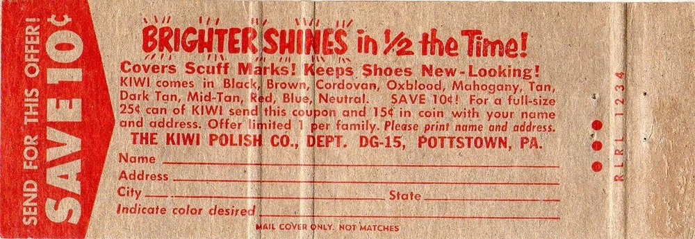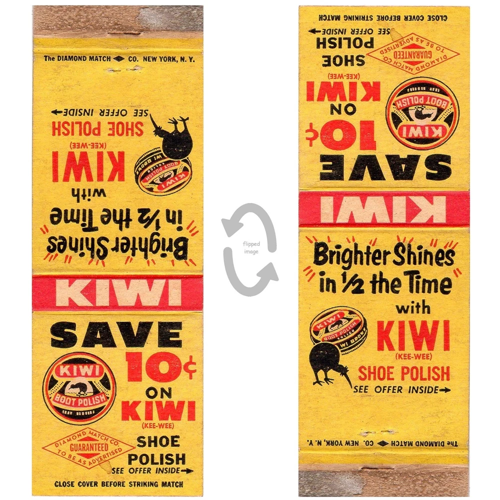 You are purchasing one vintage paper matchbook cover; matches have been removed. Good condition, previously owned. Please refer to photos for additional condition information. Your monitor may skew colors shown. Subject/categories: Graphic Art Vintage Matchbook Cover Kiwi Shoe Polish coupon offer safe 10 cents 1940s Pottstown Pennsylvania PA Printing on back? yes - coupon Manufacturer: Diamond Match Co Size: 20 strike Striker location: front Measurement: appx 4.5" x 1.5" Stock location: matches230404 We combine shipping on matchcovers - where possible, please put all purchases into one cart. In most cases, the eBay system will charge the full amount for shipping. In that event, you will be rebated after the sale. Rebate example: First item: you'll be charged as quoted on the item under "shipping" (example $4.25, $5.49, etc). Additional matchcover items:you'll be charged $0.35 each, and refunded the balance after the sale.