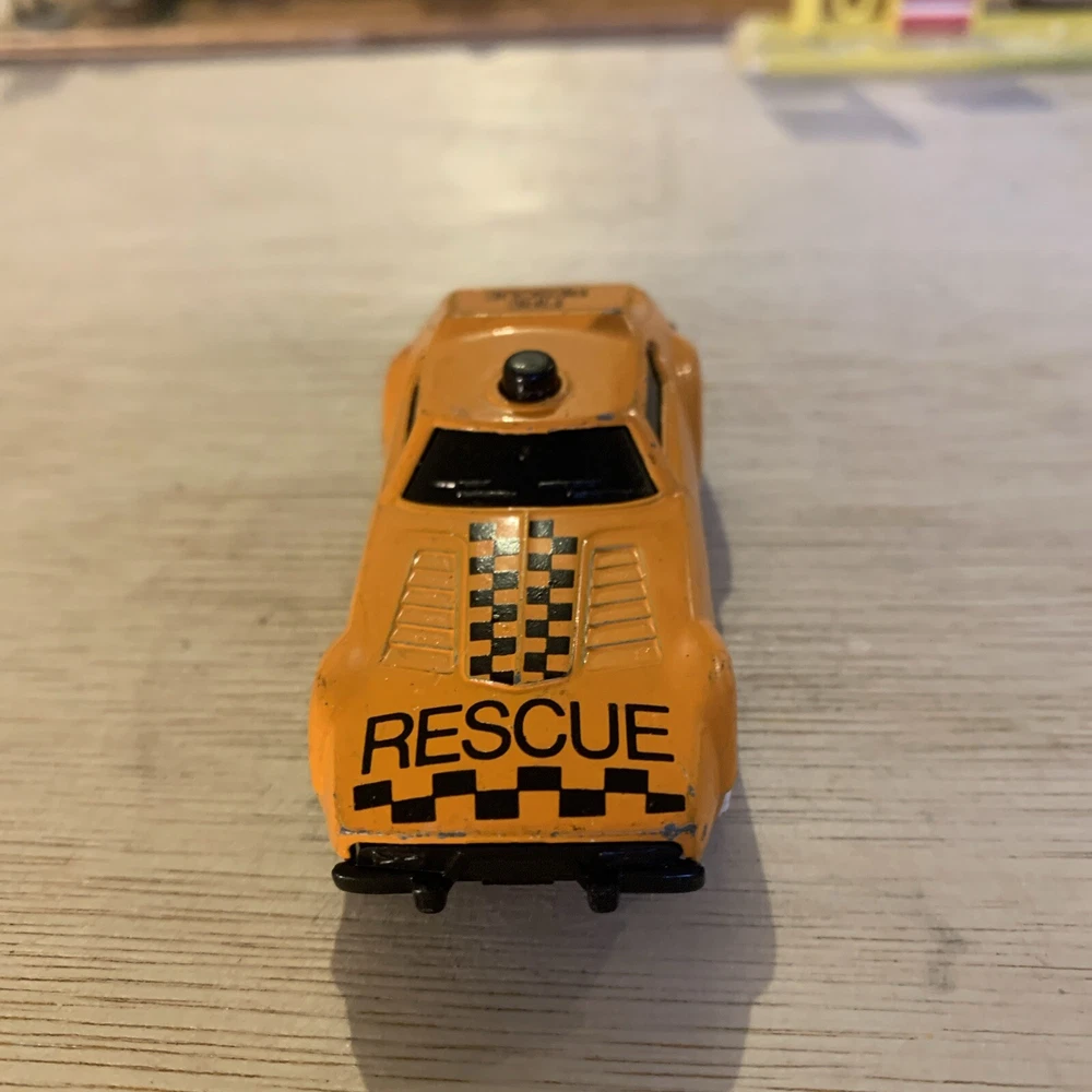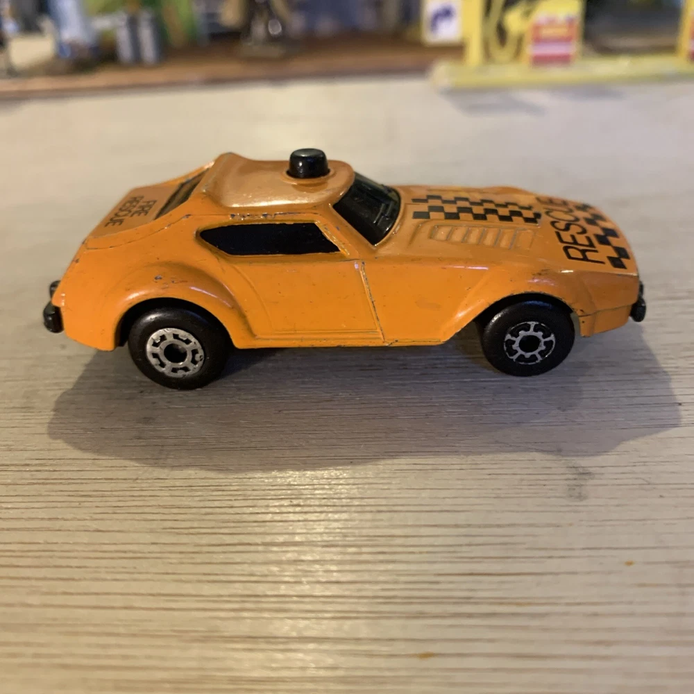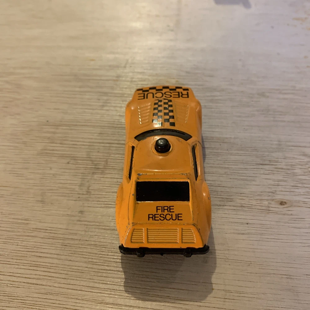 This is a vintage Matchbox 1985 Super GT Fire Rescue Car in rare orange colour. The die-cast car is part of the Ford vehicle make and is in 1:64 scale. A collectible piece from the past, this toy car is a charming addition for any Matchbox or die-cast car enthusiast.