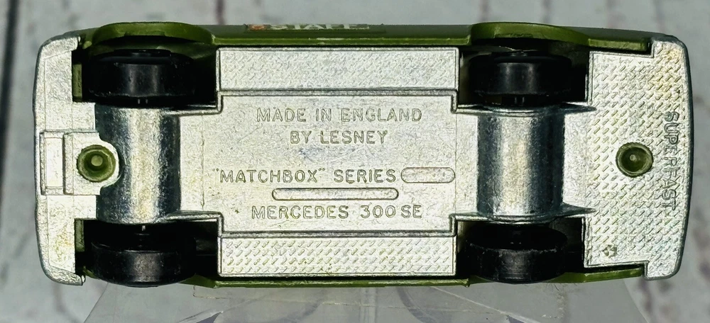 Vehicle Type: Car Vehicle Make: Mercedes-Benz Gender: Boys & Girls Material: Diecast Country/Region of Manufacture: United Kingdom Series: Matchbox Superfast Model: 300se Brand: Matchbox Theme: Military Character Family: Cars Scale: 1:64 Color: Green