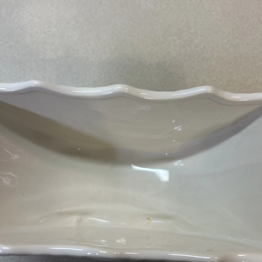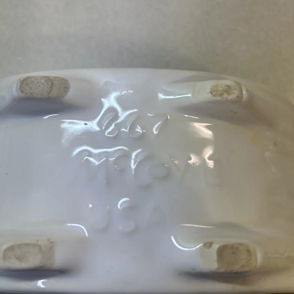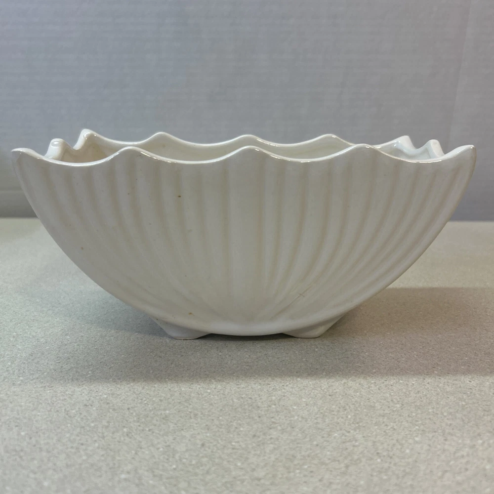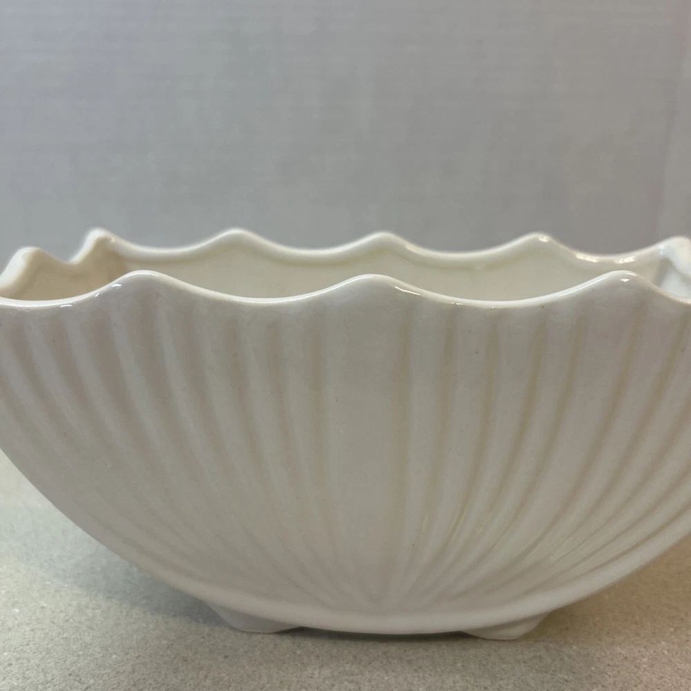 Country/Region of Manufacture:United StatesVintage:YesProduction Technique:PotteryMaterial:CeramicBackstamp:ImpressedFinish:GlossyType:PlanterSubject:DesignShape:scallopedOriginal/Licensed Reproduction:OriginalYear Manufactured:1940Brand:McCoyTheme:scallopedIndoor/Outdoor:IndoorPattern:ScallopedTime Period Manufactured:1940-1949Color:White
