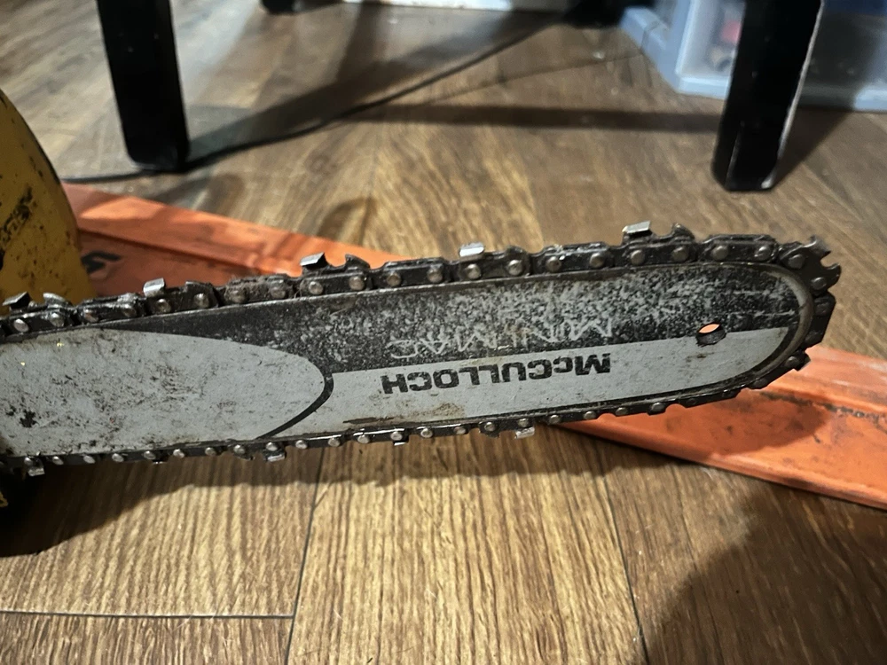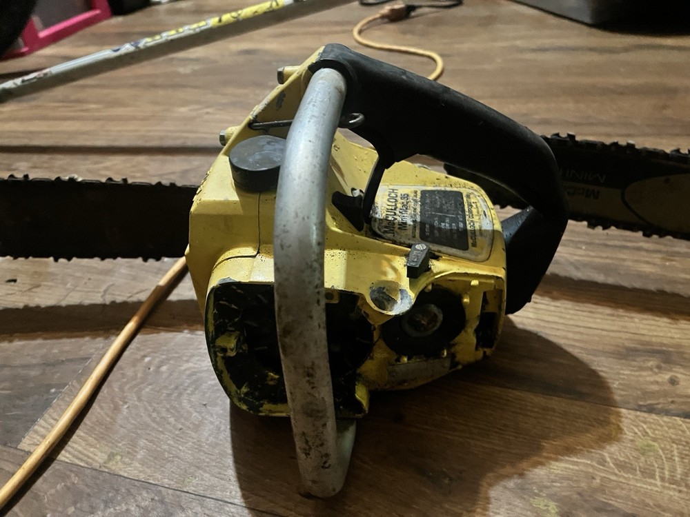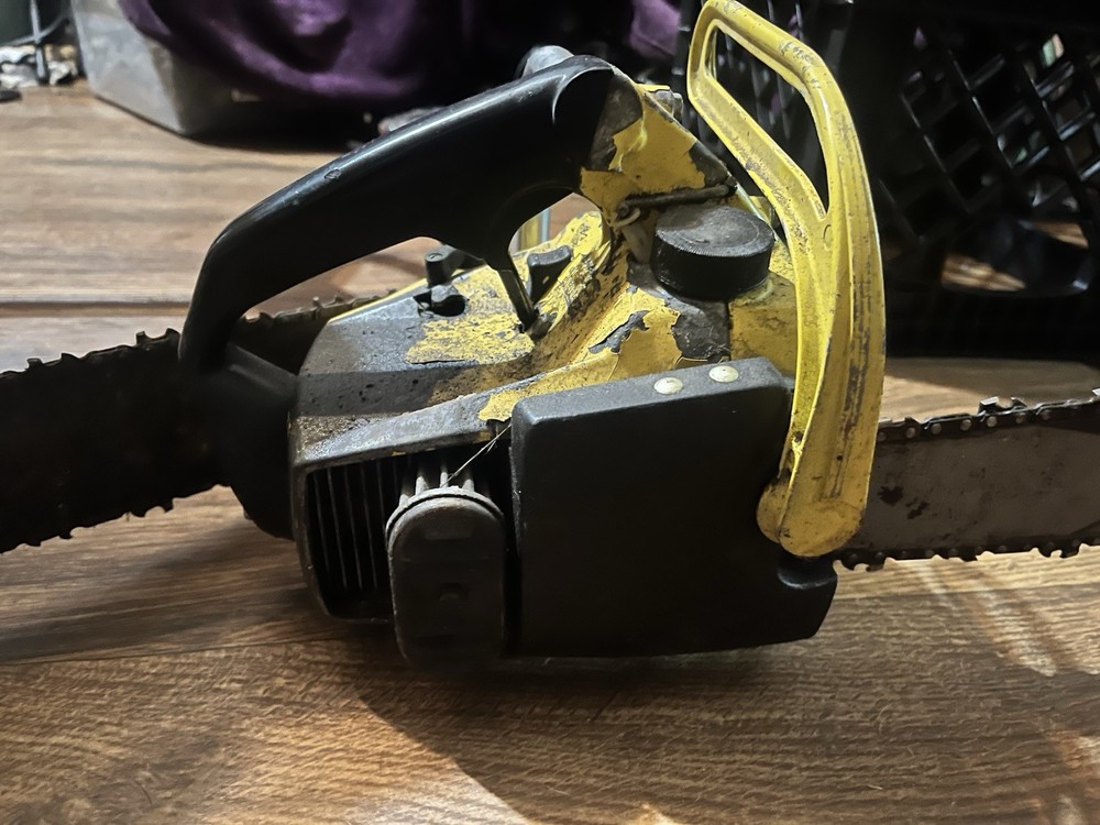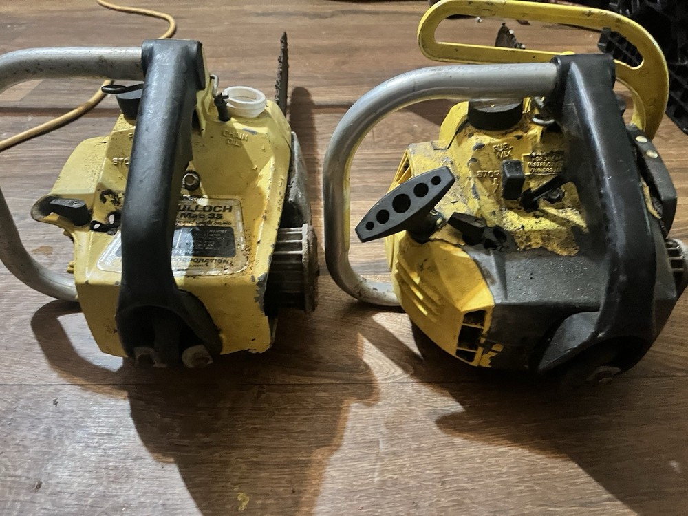 One the pull rope is broken but turns smoothly by flywheel with good compression has a good 16” bar and chain on it saw is in overall good condition cosmetically missing air filter and cover the second one is in good condition cosmetically as well same with the bar and chain it’s a complete saw and the motor has compression and turns over smoothly both saws are included in this auction has a 12” bar and chain