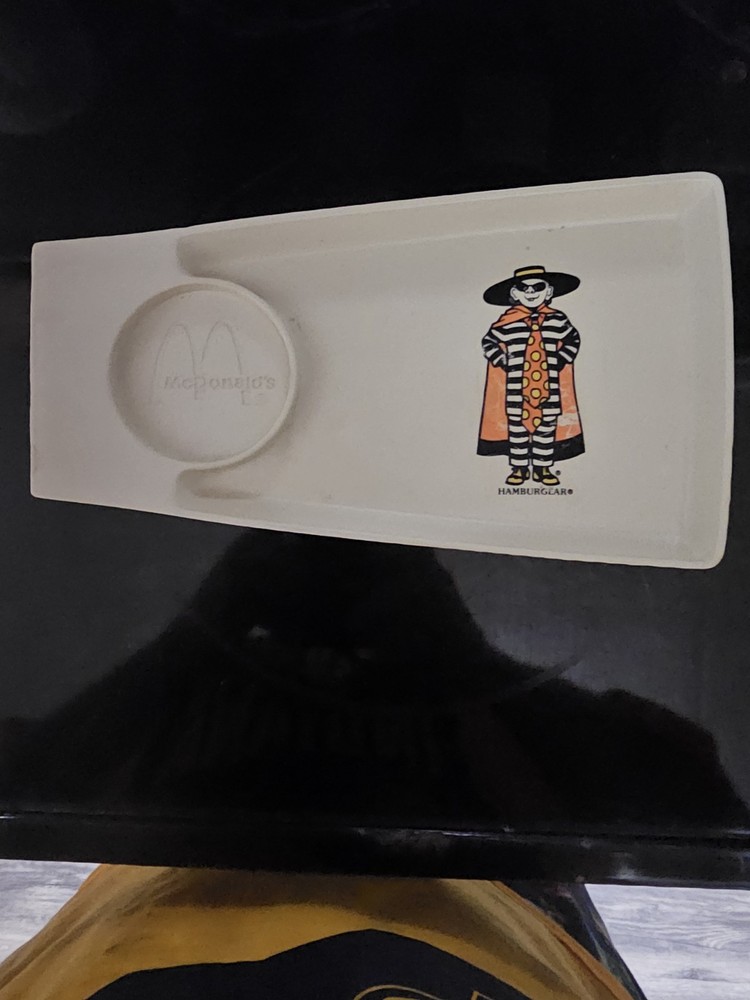 This is a vintage McDonald's plastic child's Happy Meal tray featuring the Hamburglar character. The tray is multi-color and original, perfect for collectors of McDonald's memorabilia or nostalgic restaurant and fast food items. It is a unique piece of advertising collectible representing the fast-food chain.