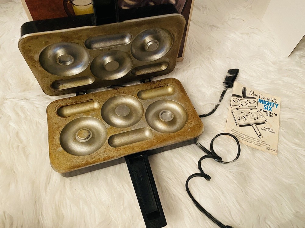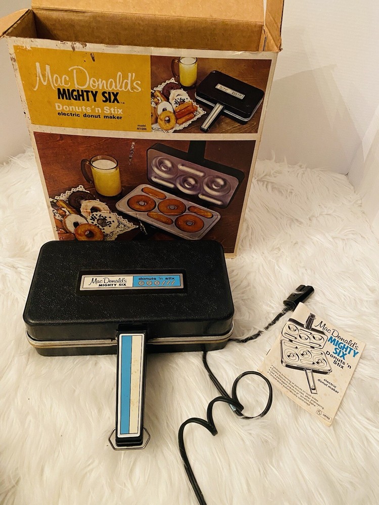 Vintage MacDonalds Mighty Six Donuts 'n Stix Electric Donut Maker. The box is in excellent shape and the appliance still works